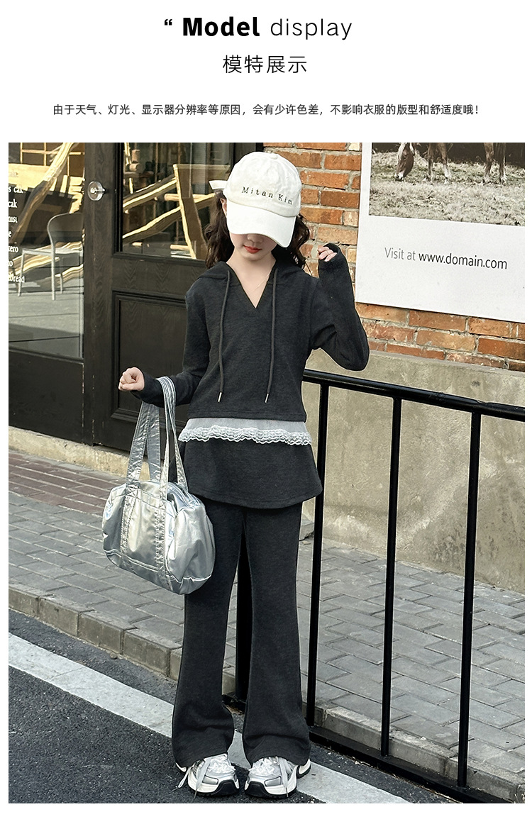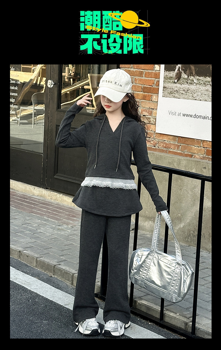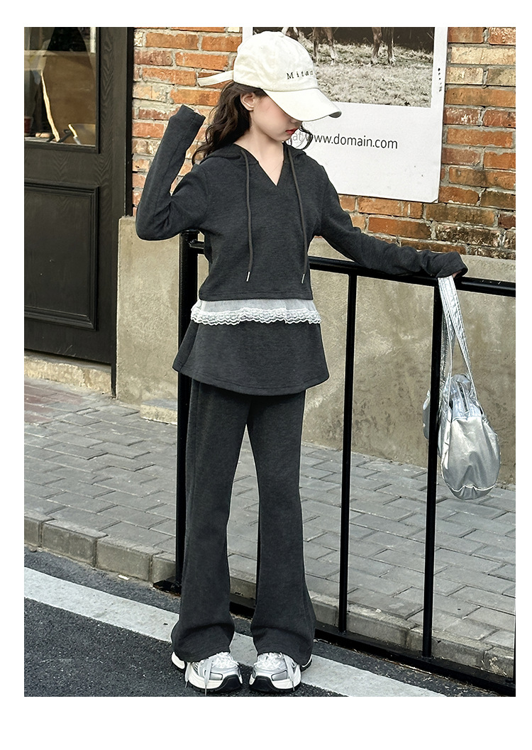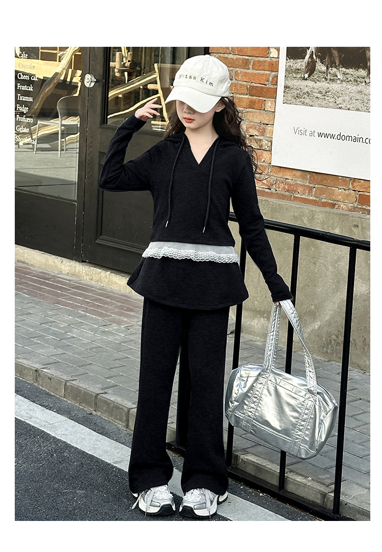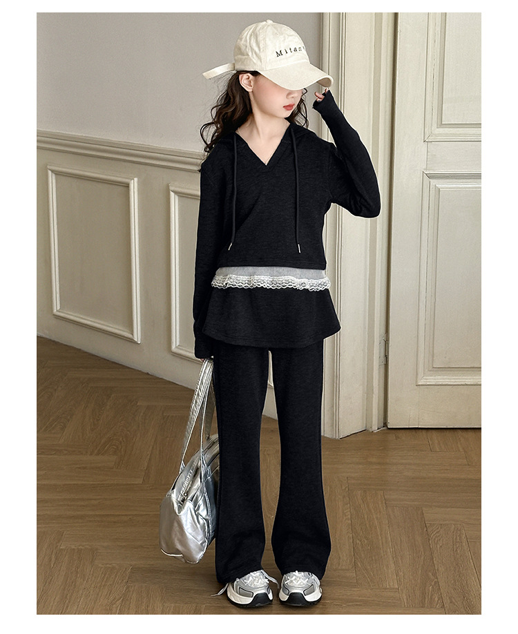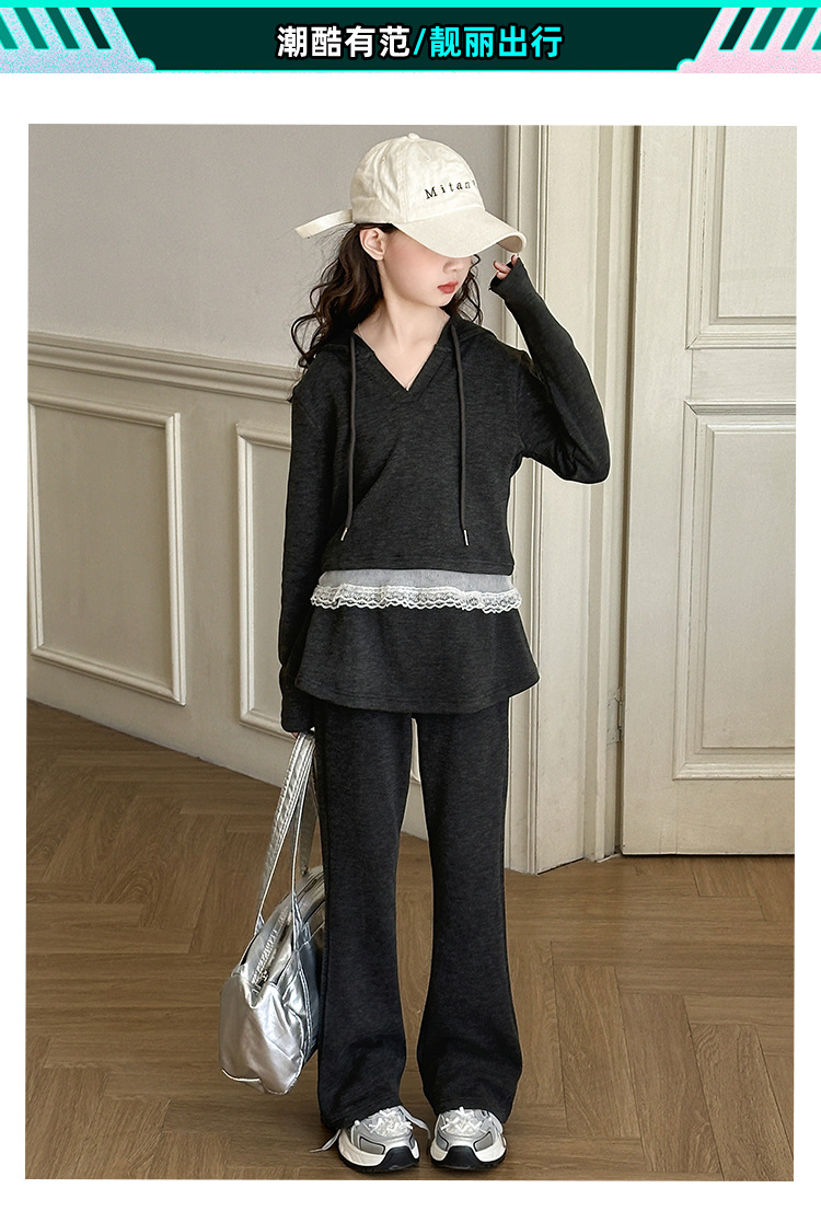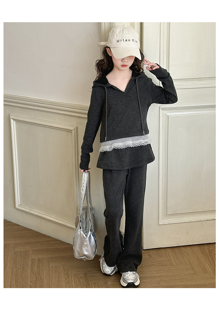 소녀 레이스 세트 2025 봄과 가을 새로운 어린 소녀 후드 땀 방귀 커튼 플래 바지 투피스 세트