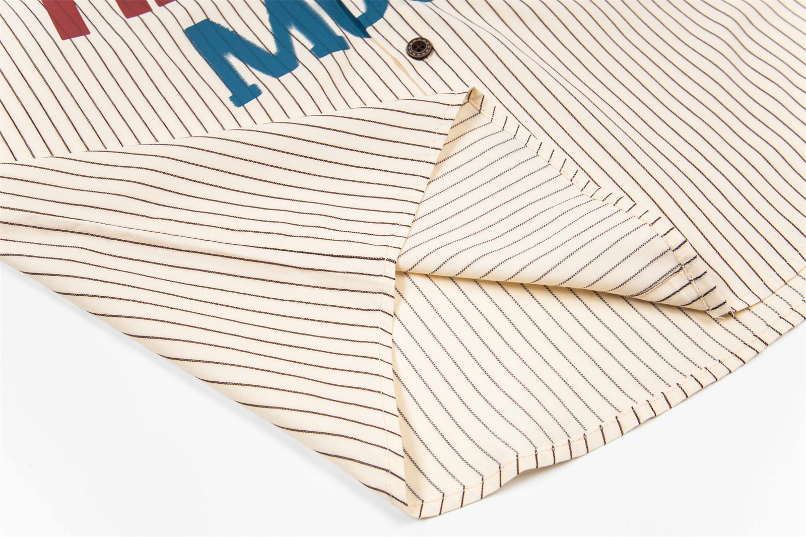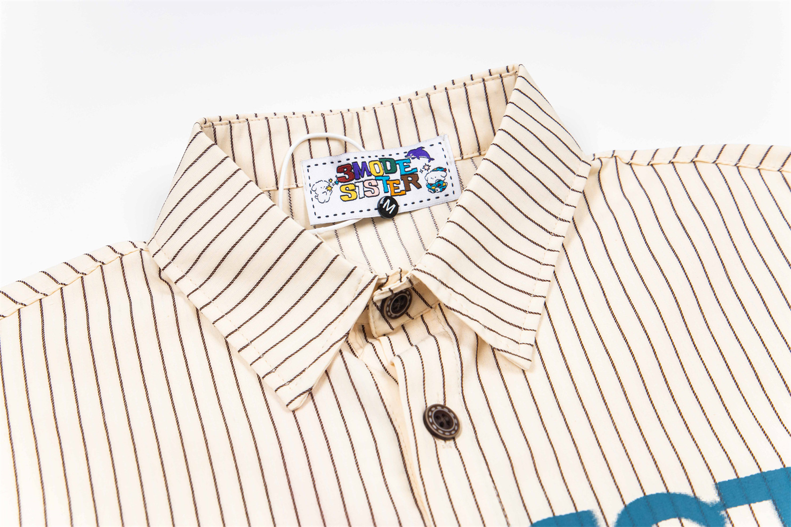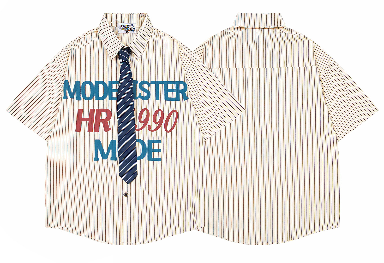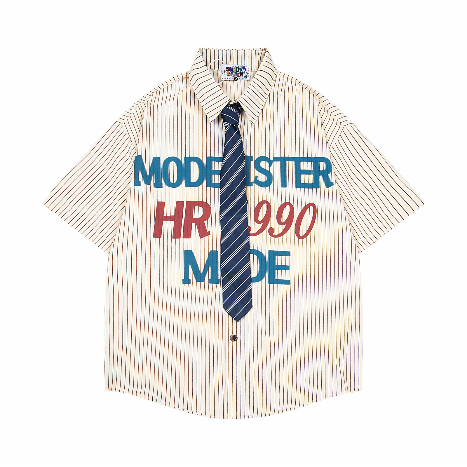 일본 복고풍 문자 프린트 스트라이프 넥타이 반팔 셔츠 남성 여름 루즈 캐주얼 다용도 커플 셔츠