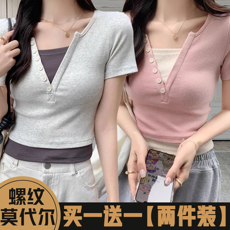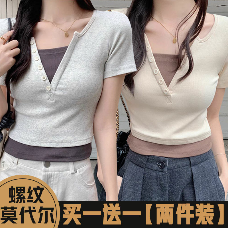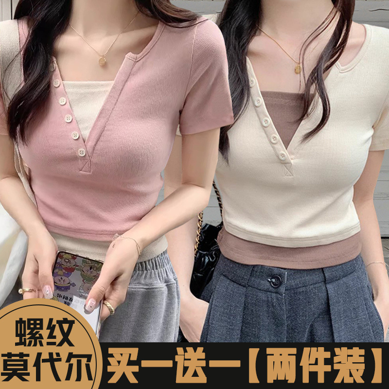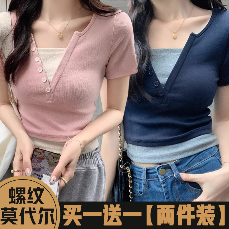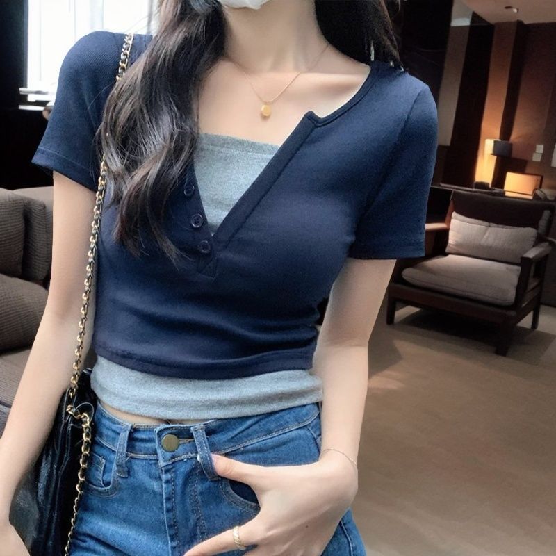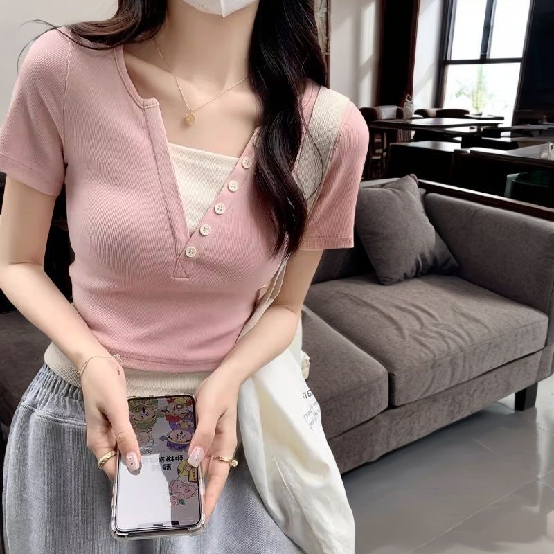 싱글/투피스 어깨 반팔 티셔츠 여성 여름 새로운 디자인 센스 슬림 핏 슬림 핏 컬러 매칭 페이크 투피스 스레드 탑스토어 가기