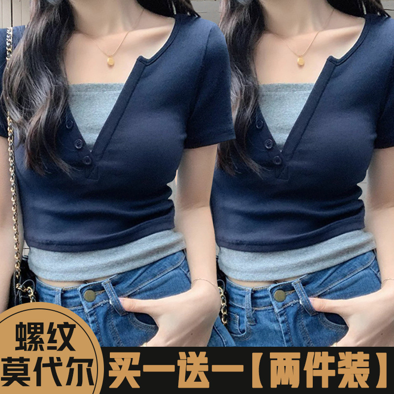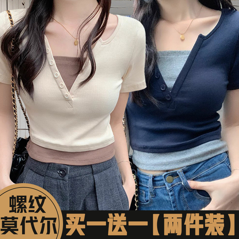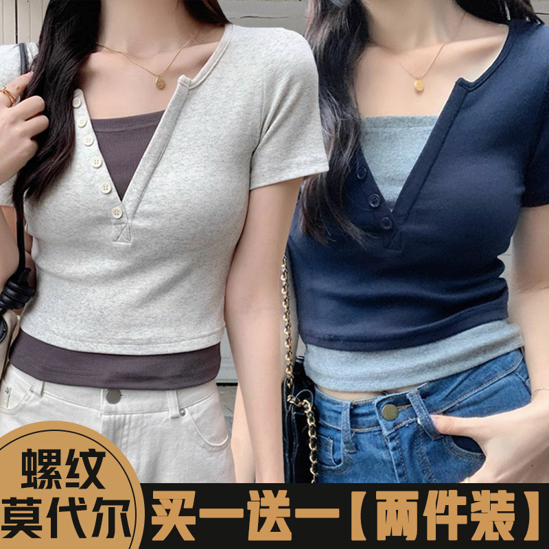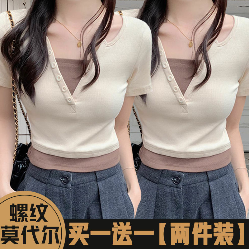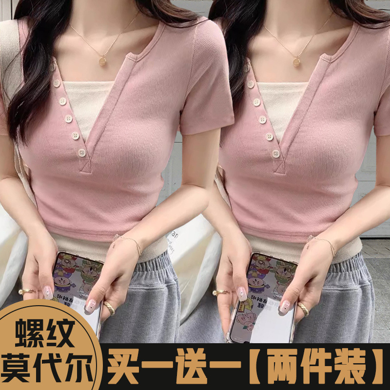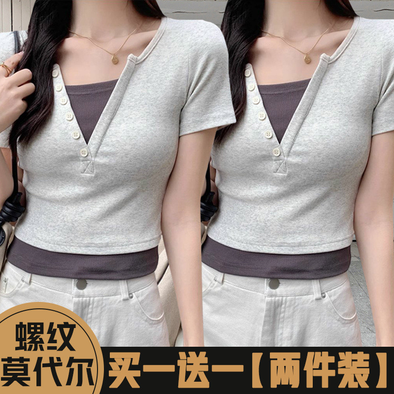 싱글/투피스 어깨 반팔 티셔츠 여성 여름 새로운 디자인 센스 슬림 핏 슬림 핏 컬러 매칭 페이크 투피스 스레드 탑스토어 가기