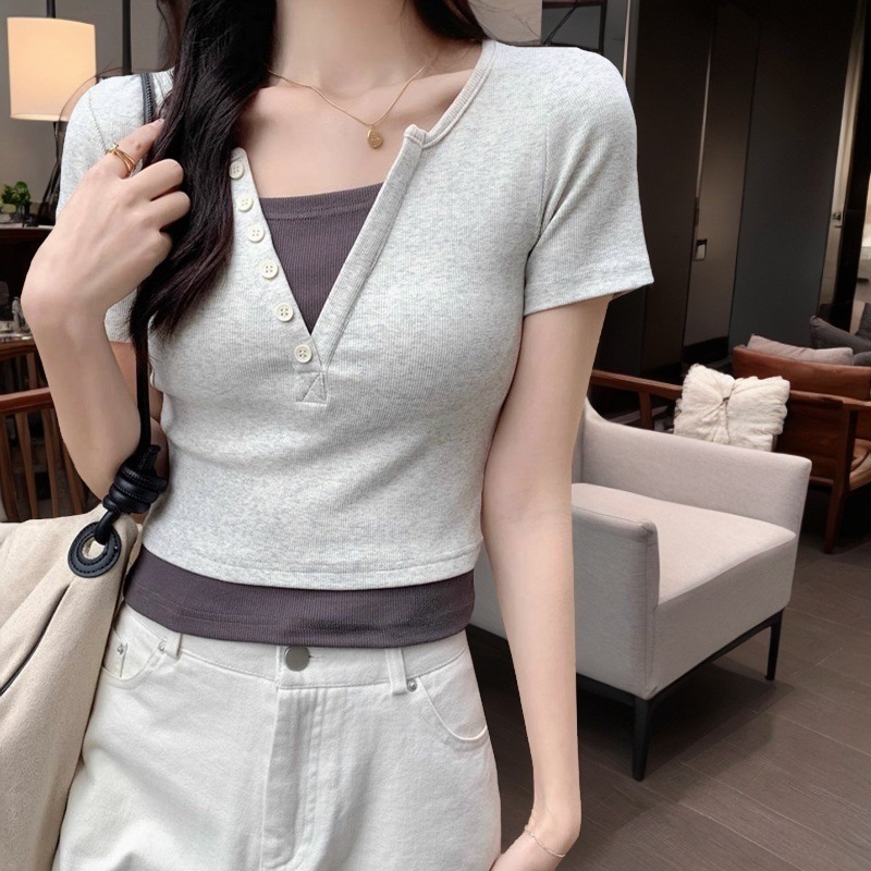 싱글/투피스 어깨 반팔 티셔츠 여성 여름 새로운 디자인 센스 슬림 핏 슬림 핏 컬러 매칭 페이크 투피스 스레드 탑