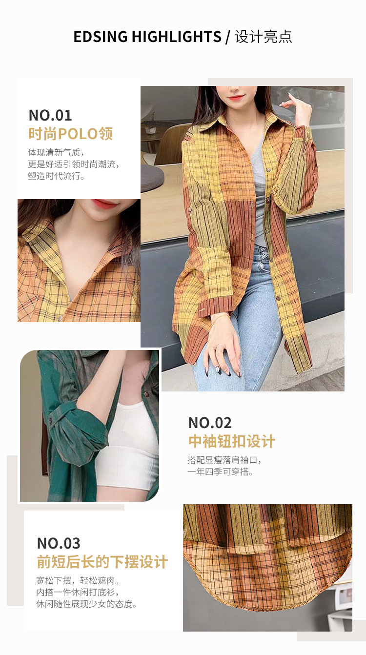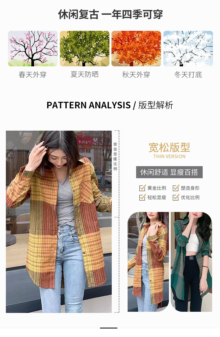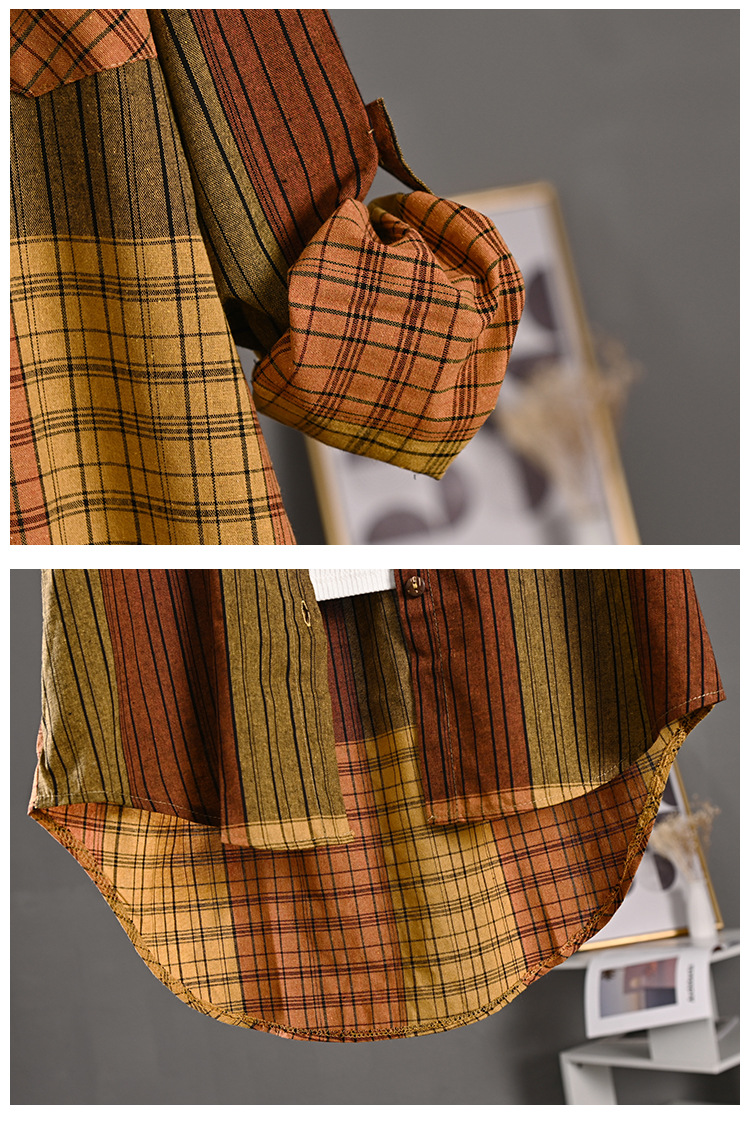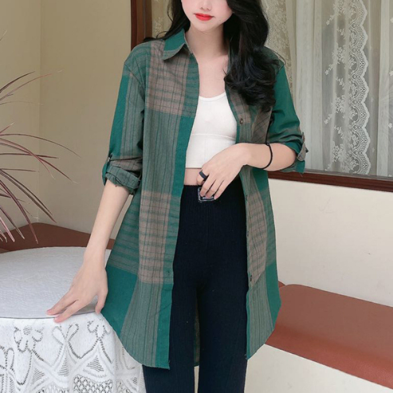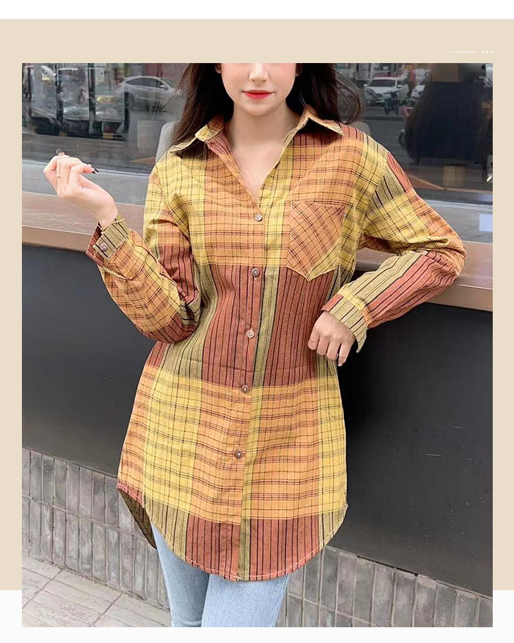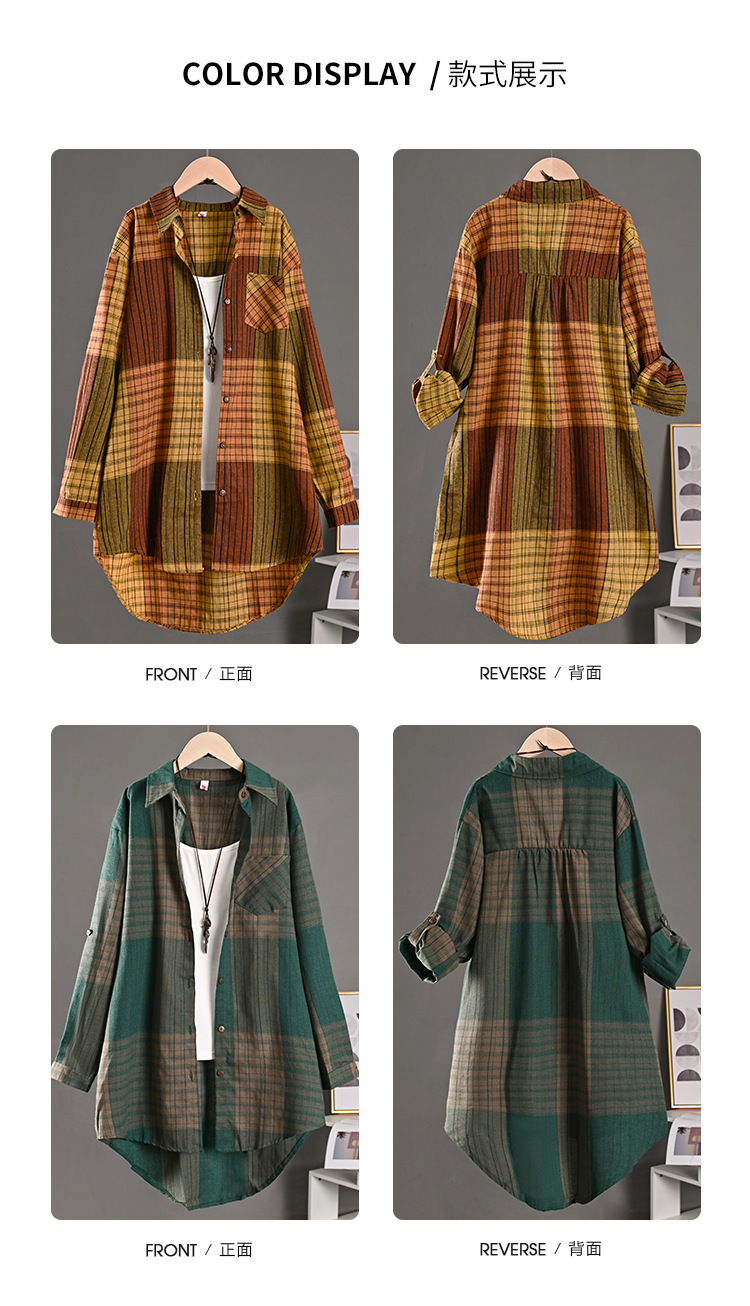 빈티지 체크 셔츠 여성용 중간 길이의 느슨한 봄과 가을 얇은 코트 코튼 및 리넨 셔츠 긴 소매 서양식 최고 디자인 감각