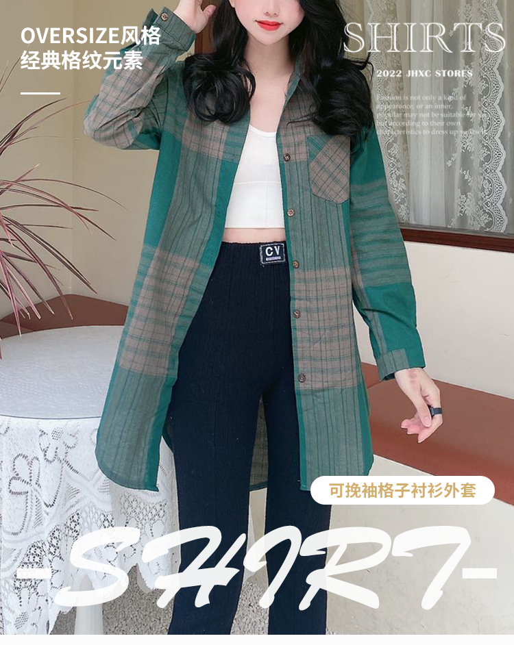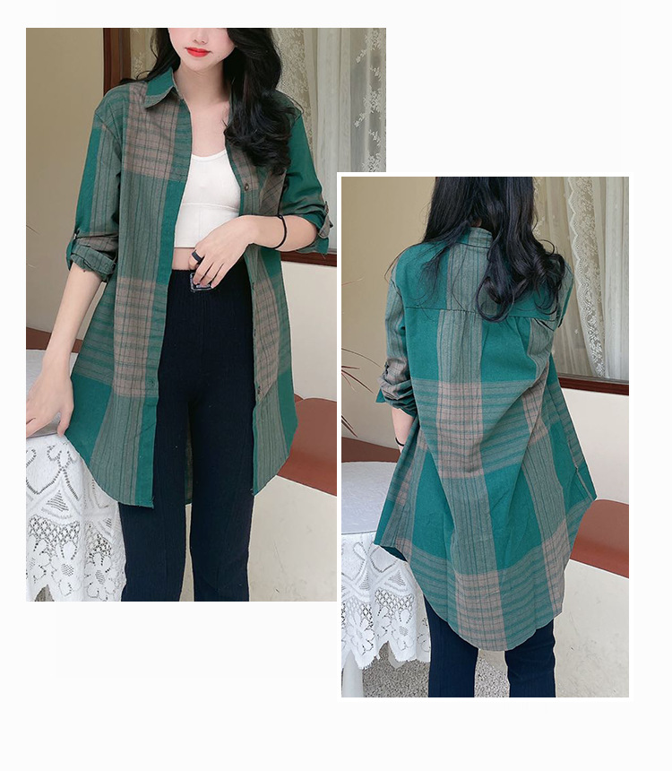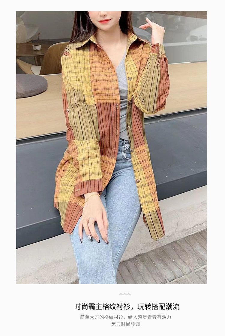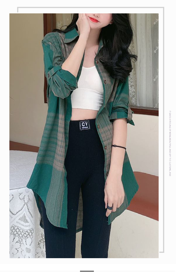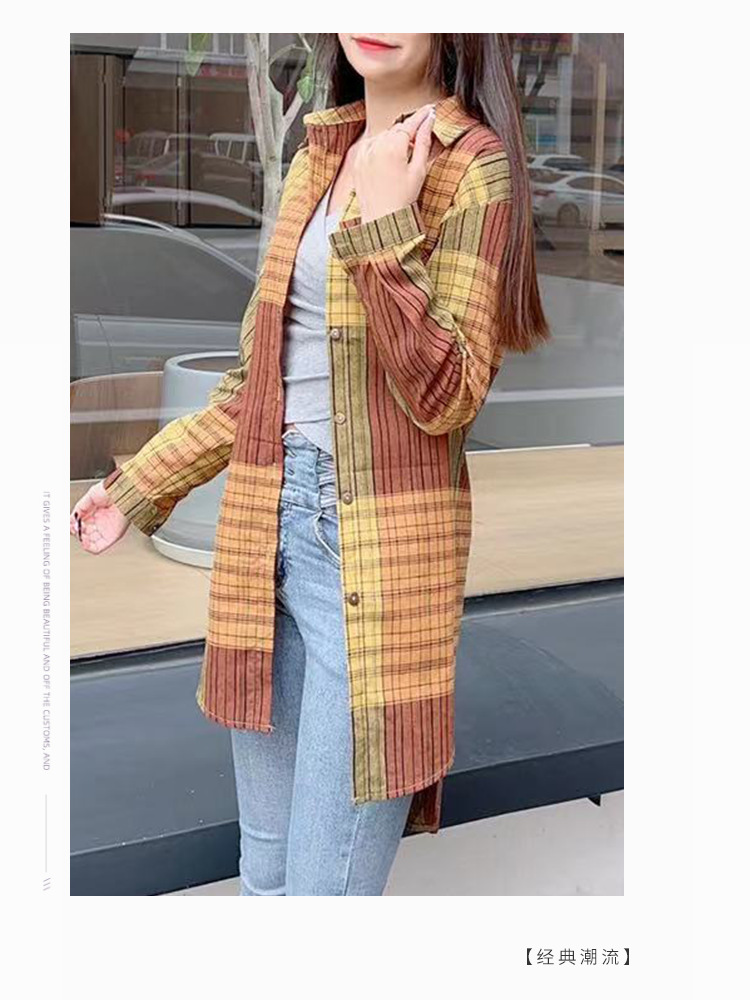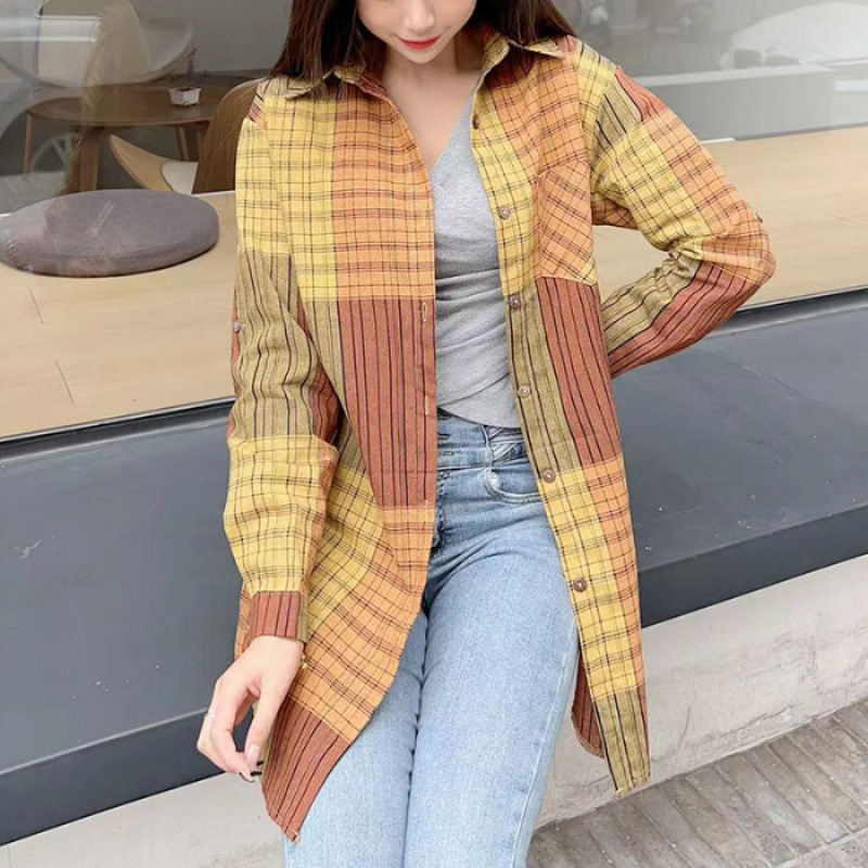 빈티지 체크 셔츠 여성용 중간 길이의 느슨한 봄과 가을 얇은 코트 코튼 및 리넨 셔츠 긴 소매 서양식 최고 디자인 감각스토어 가기