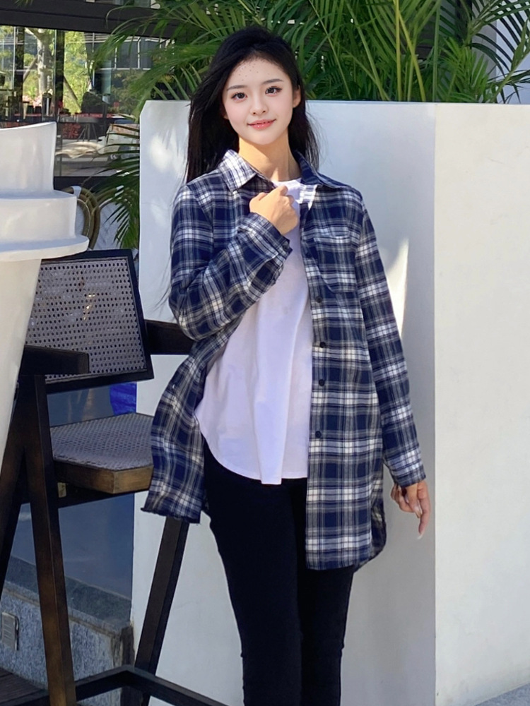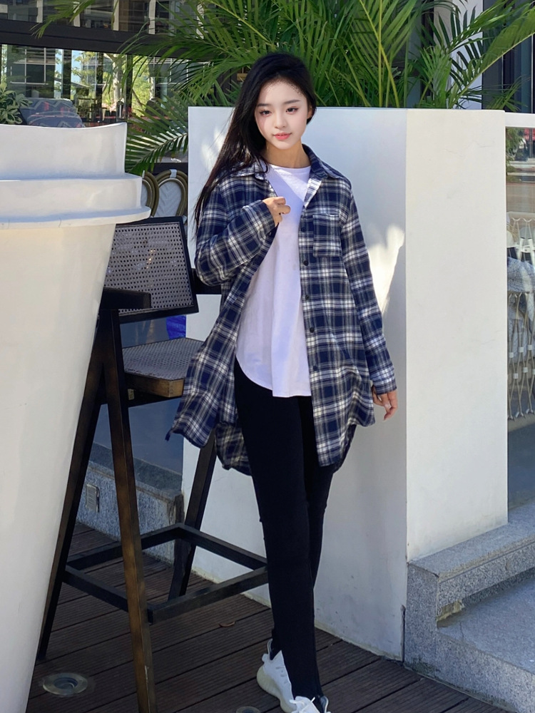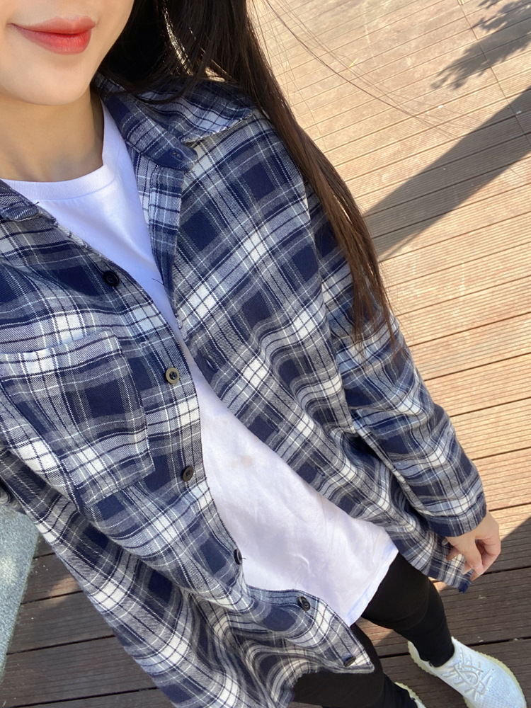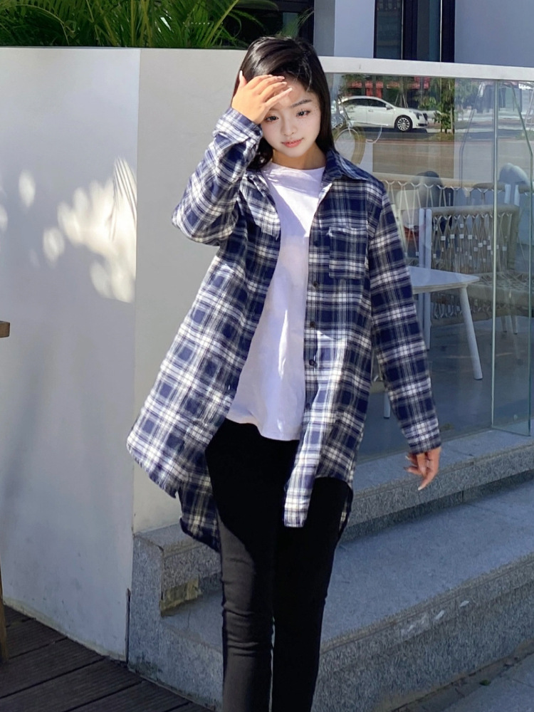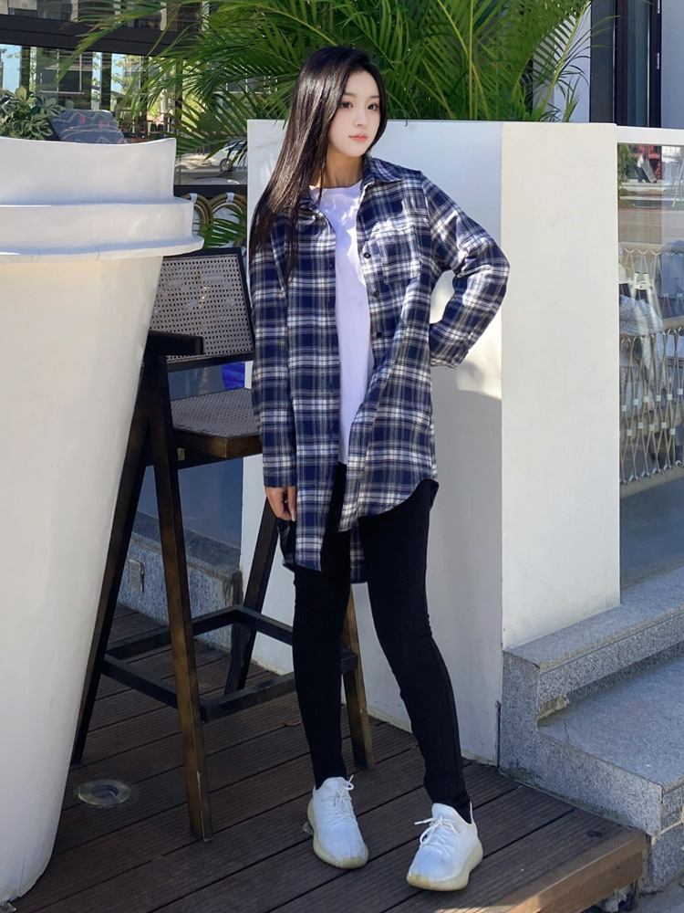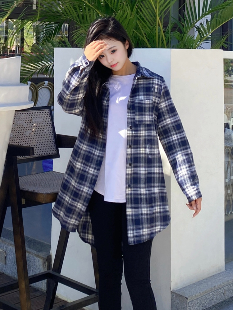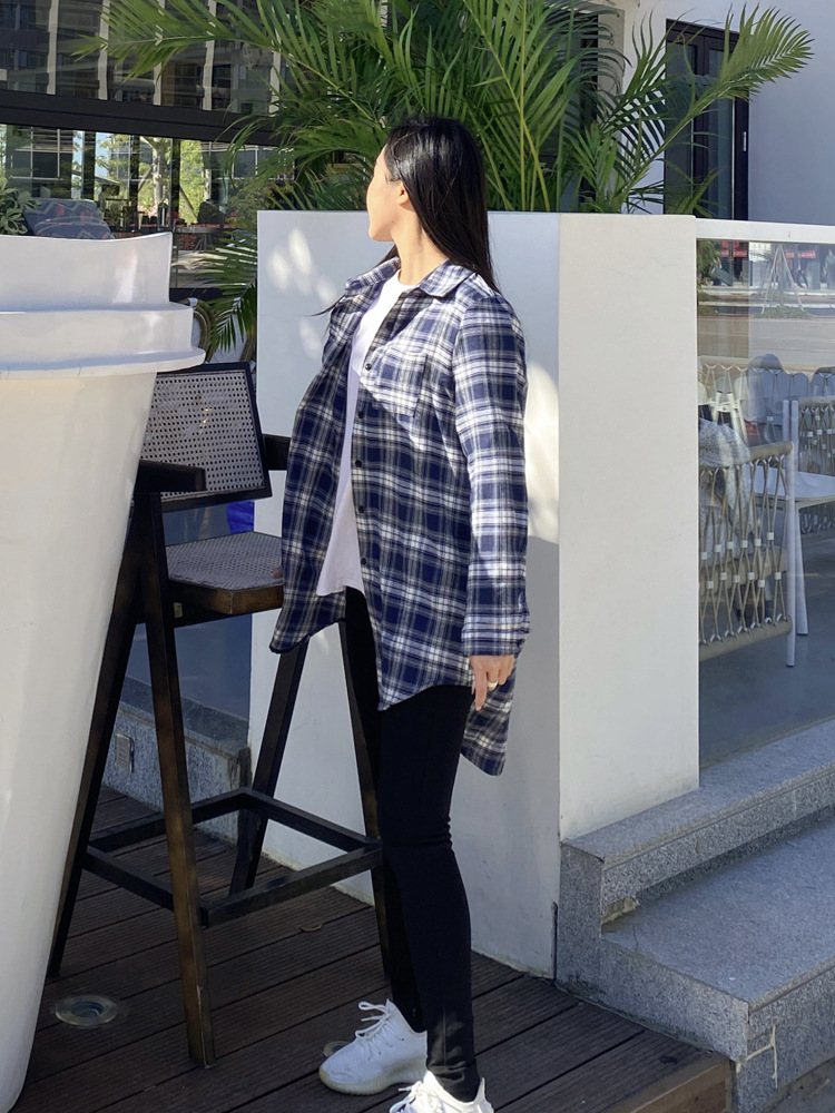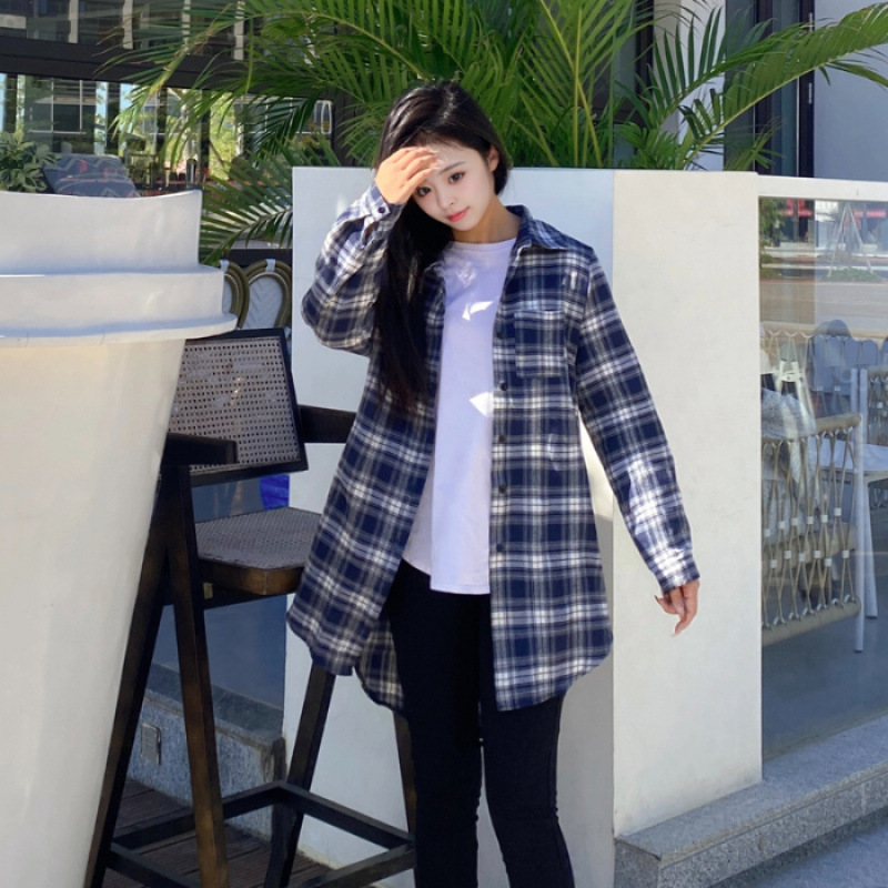 파란색과 흰색 격자 무늬 셔츠 여성의 중간 길이의 봄 및 가을 얇은 외투와 리넨 셔츠 긴팔 선 스크린 셔츠 서양식 격자 무늬 탑스토어 가기