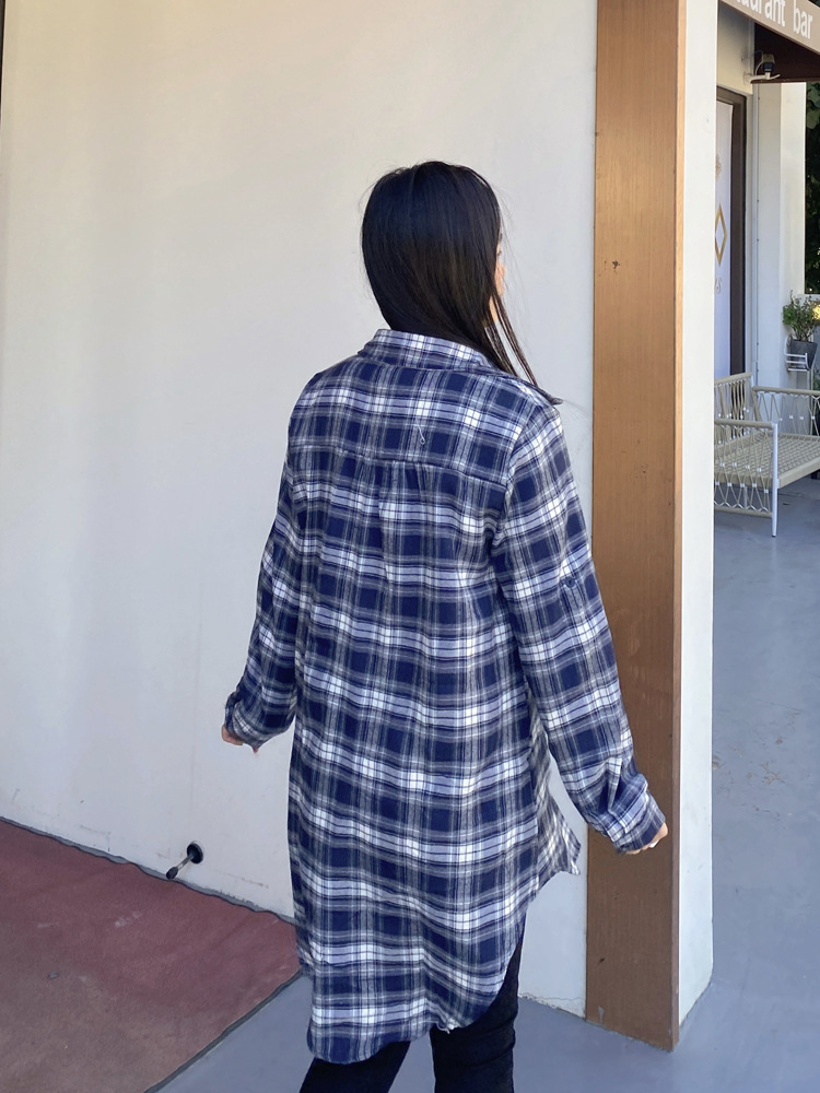 파란색과 흰색 격자 무늬 셔츠 여성의 중간 길이의 봄 및 가을 얇은 외투와 리넨 셔츠 긴팔 선 스크린 셔츠 서양식 격자 무늬 탑