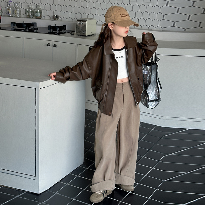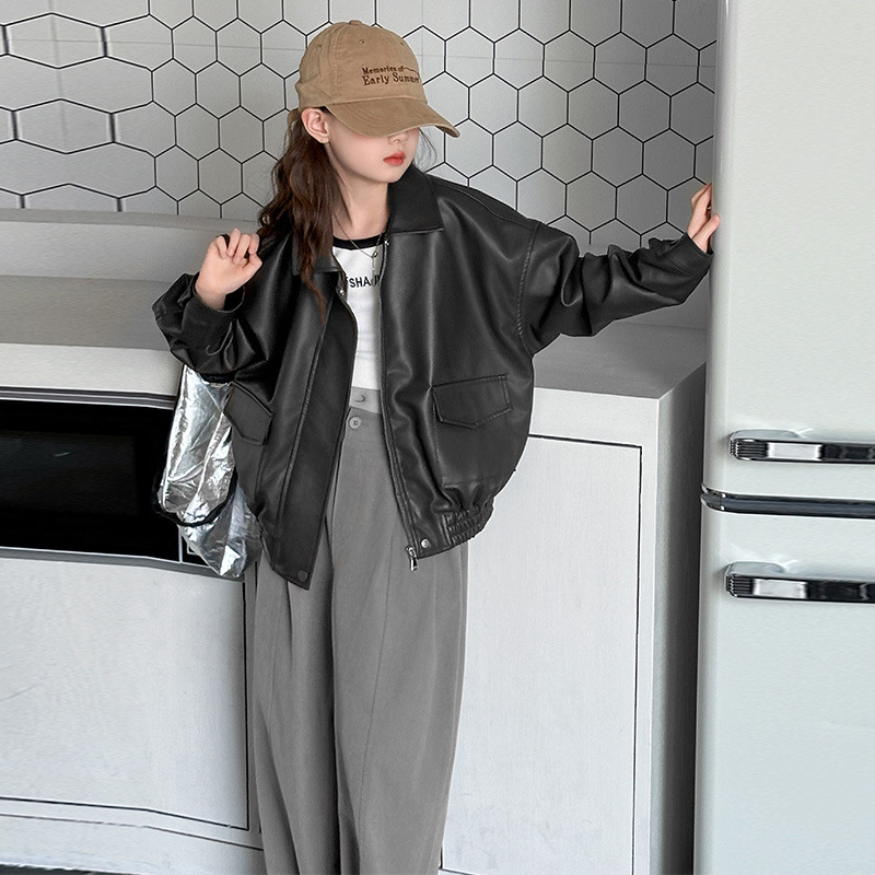 소녀 가죽 자켓 2025 봄 새로운 큰 소년 한국 스타일 스타일 PU 재킷 최고의 어린이 유럽과 미국 자전거 의류스토어 가기