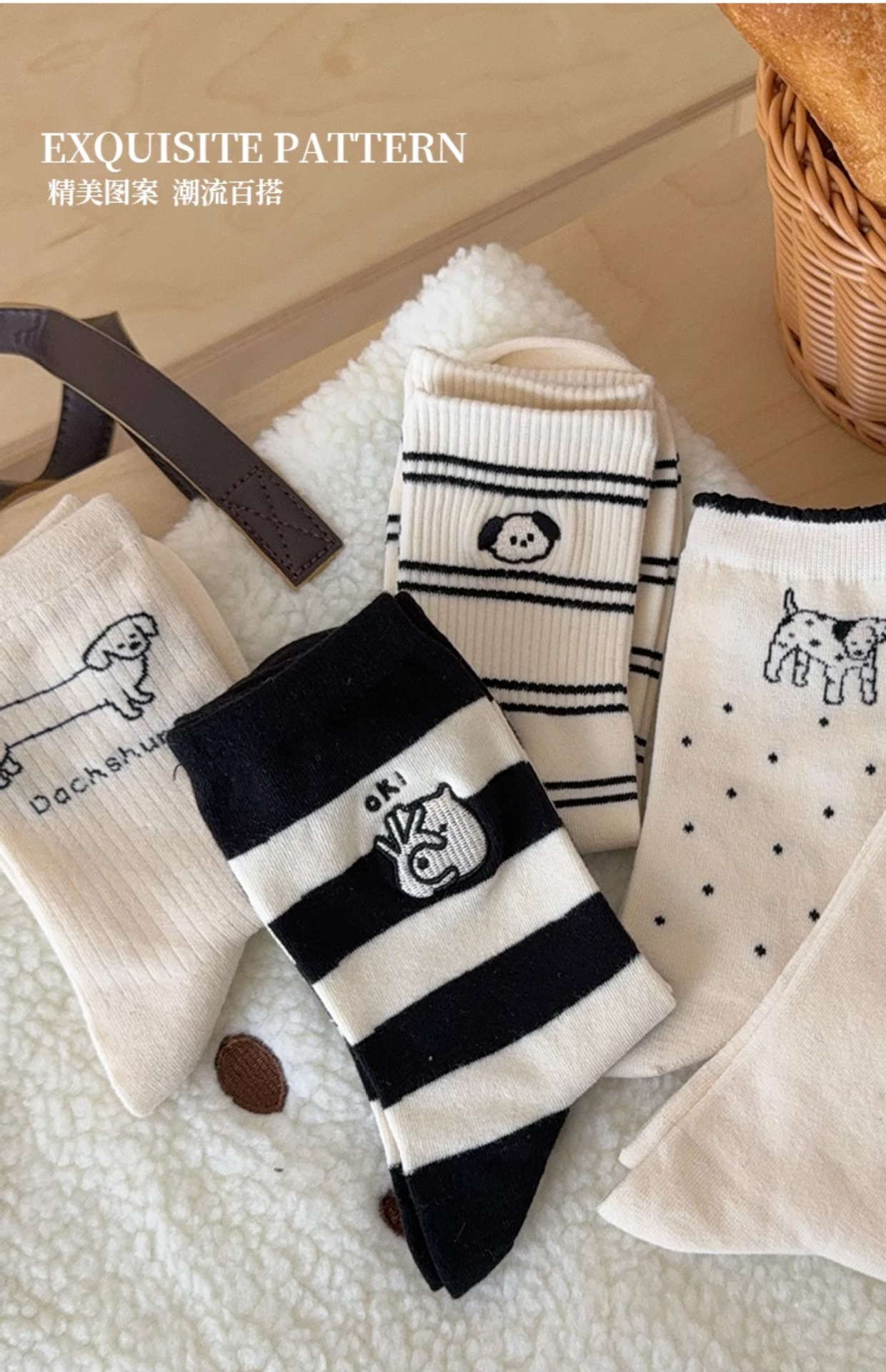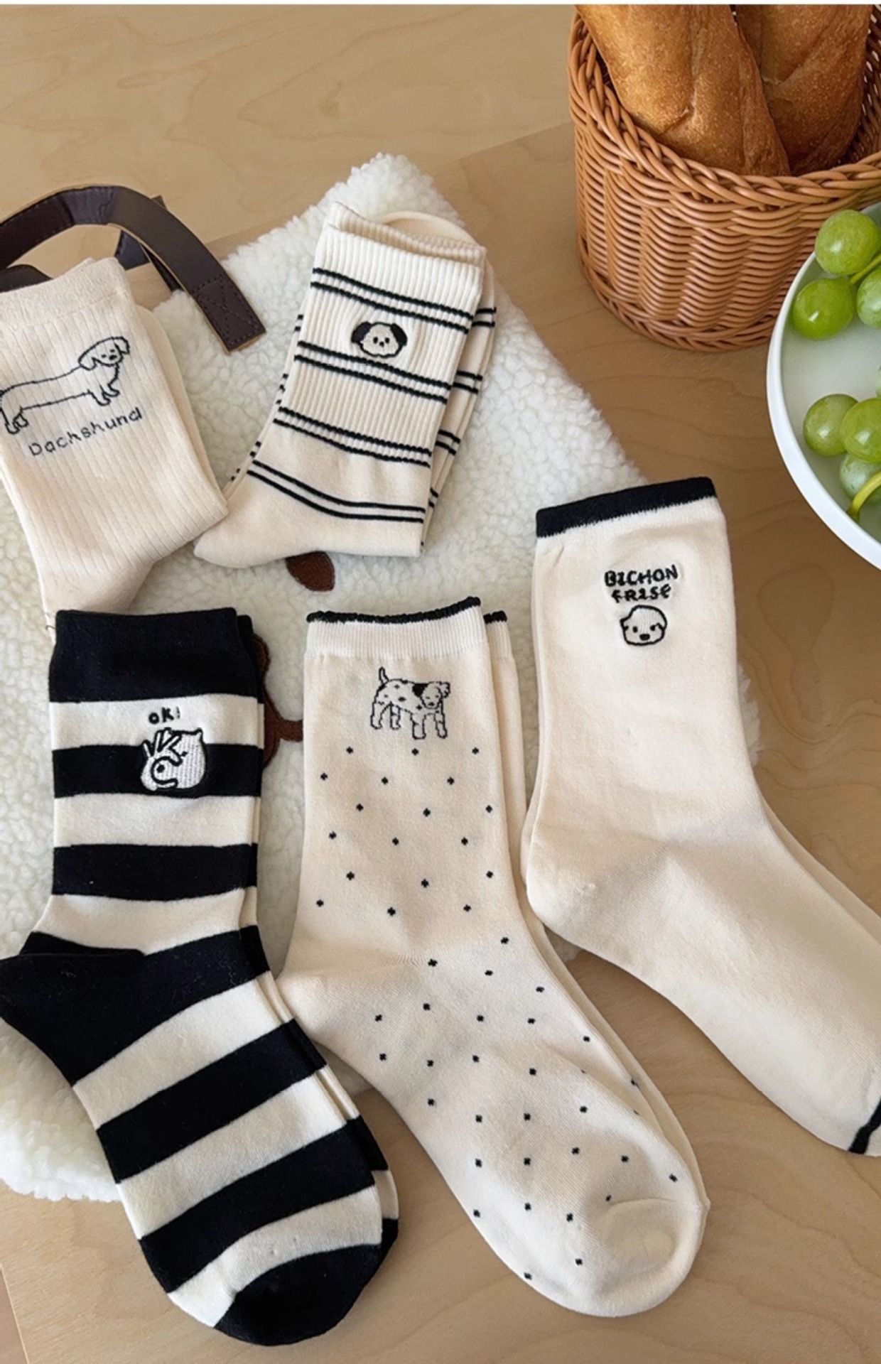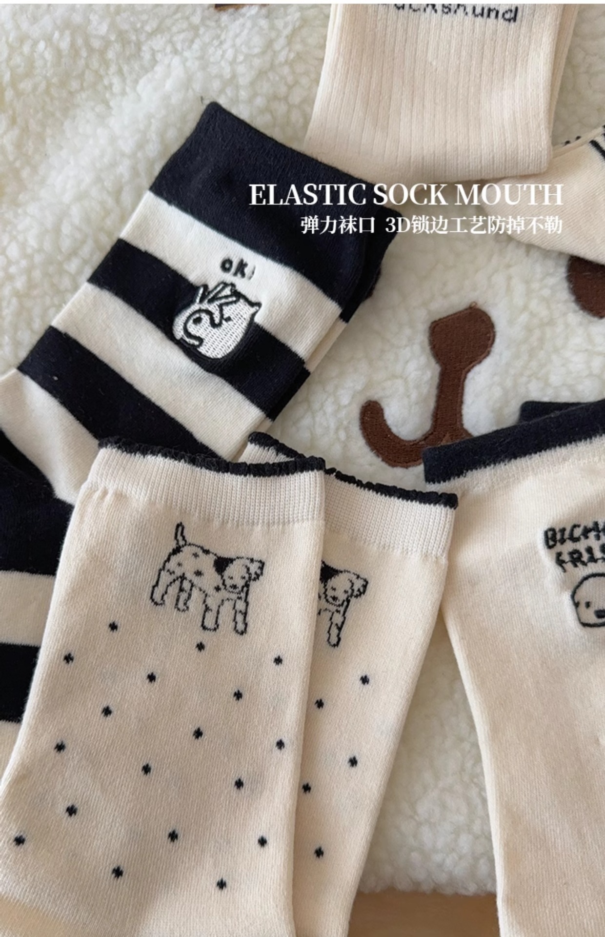 여성용 만화 강아지 양말, 귀여운 종아리 중간 양말, 여름 순면, 트렌디한 인터넷 연예인, 가을 여성용 한국 줄무늬 스타킹스토어 가기