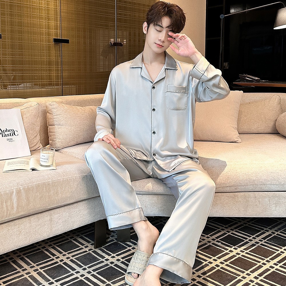 라이트 럭셔리 커플 아이스 실크 파자마 여성용 봄 얇은 긴팔 바지 Acetic 세트 한국식 인터넷 트렌디 남성용 홈 의류스토어 가기