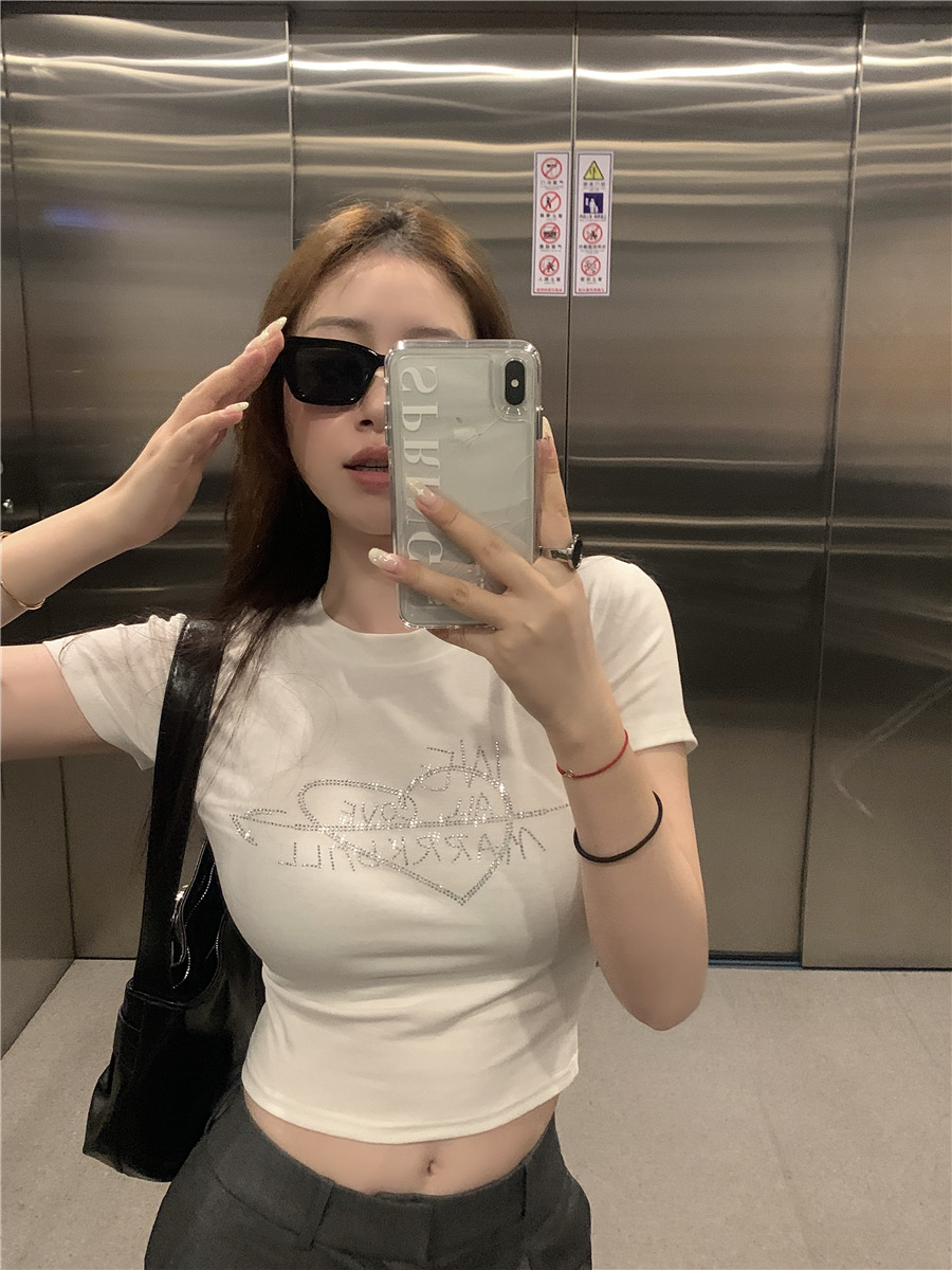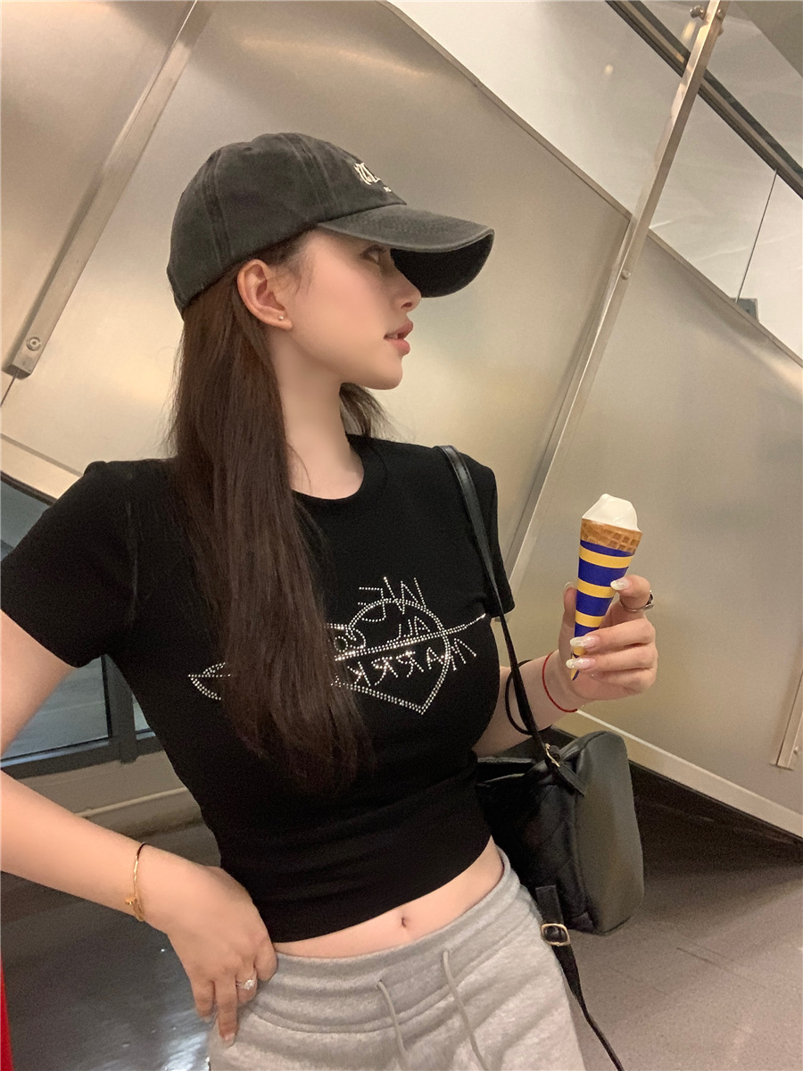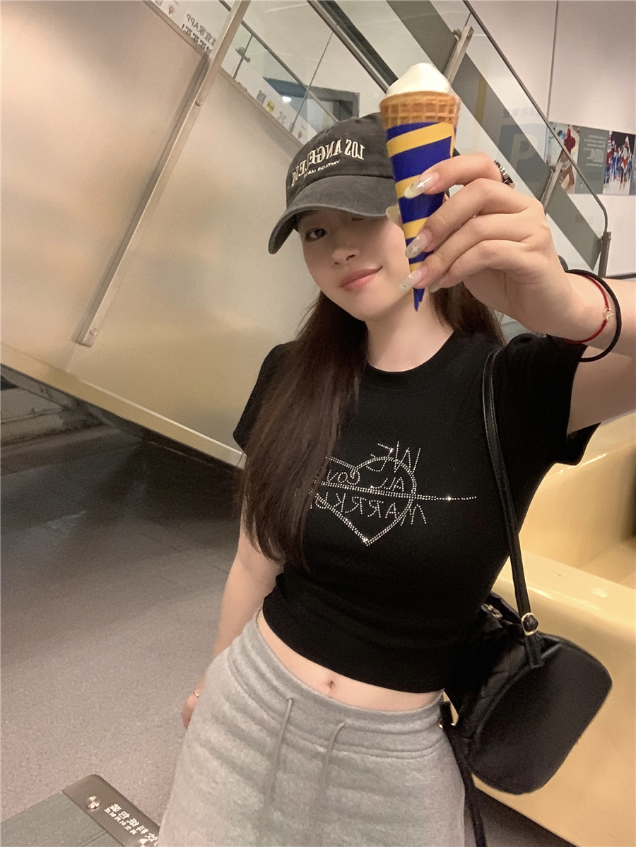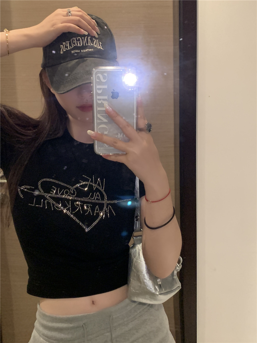 미국식 반짝이 장식 숄더 반팔 티셔츠 여성 여름 2025 신상 핫걸 슬림핏 디자인 숏탑스토어 가기