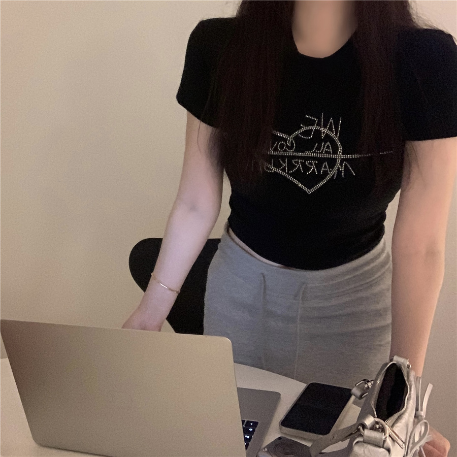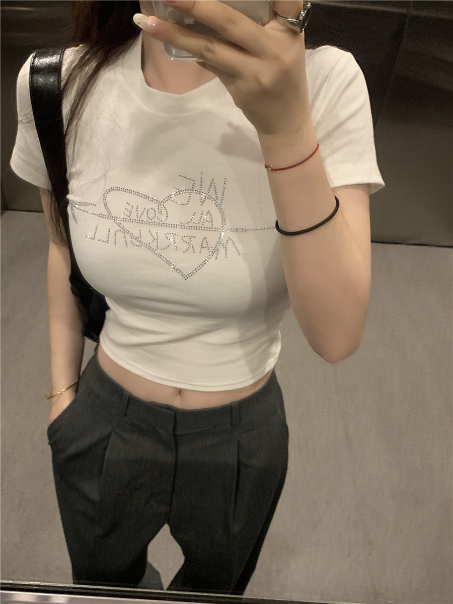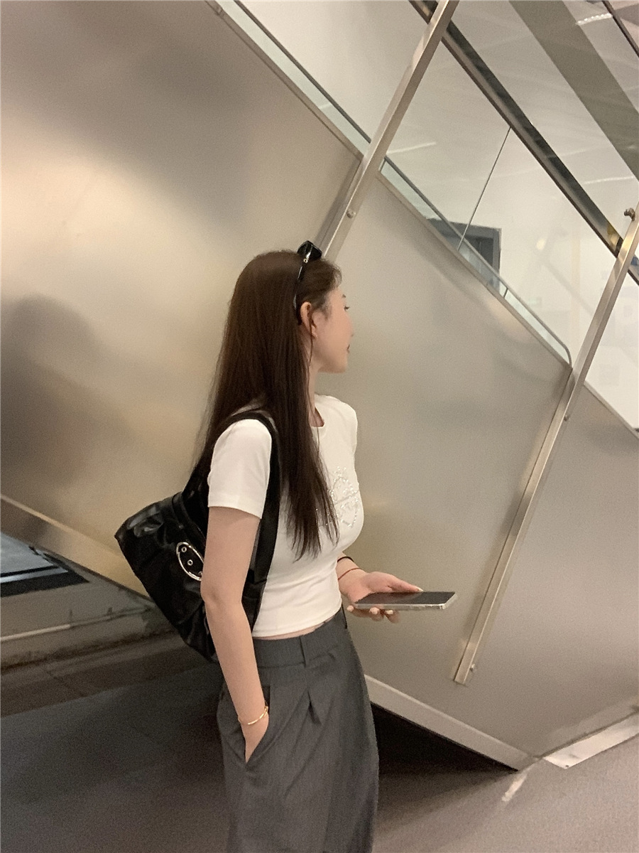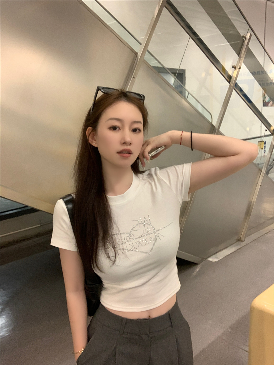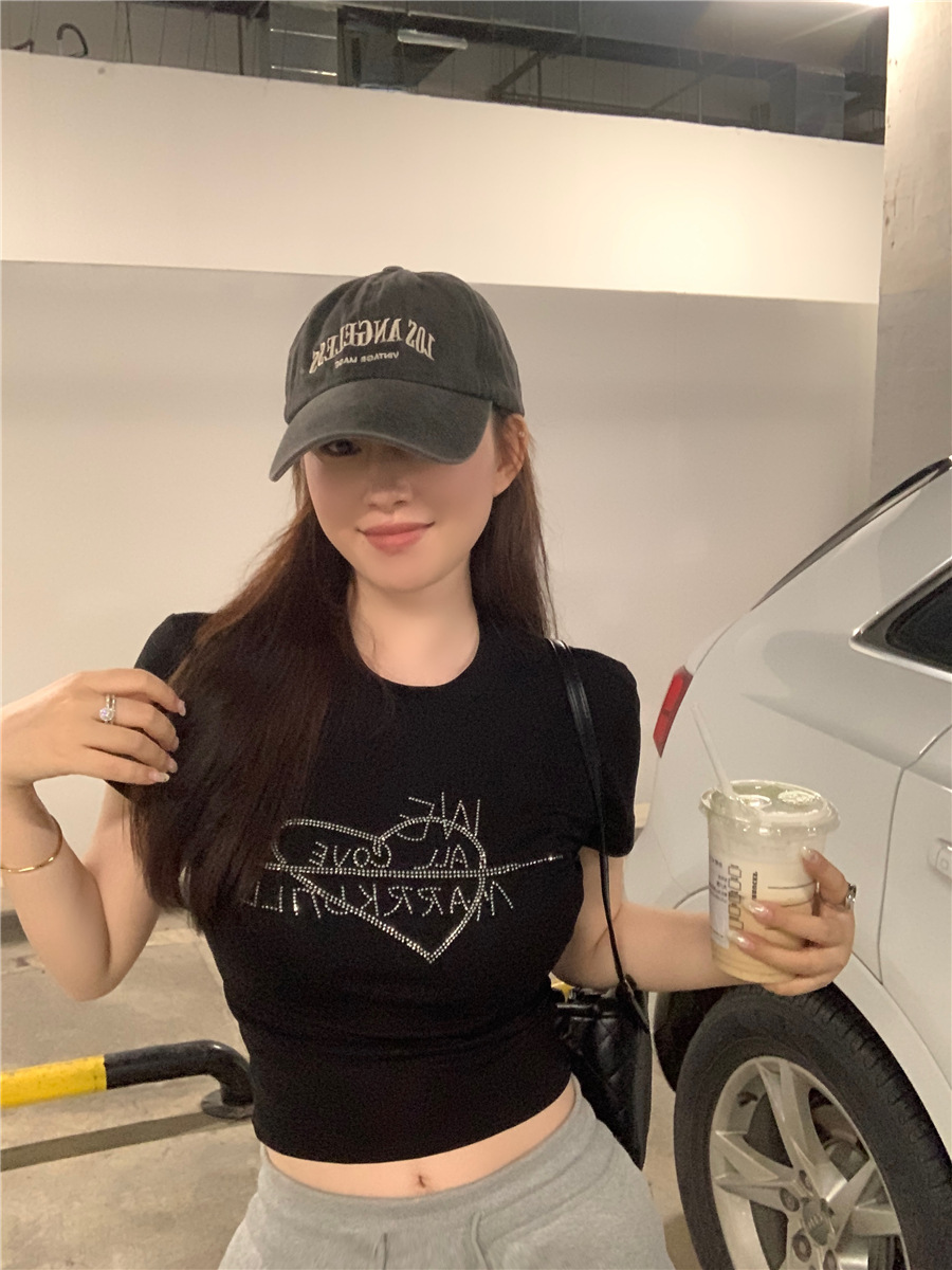 미국식 반짝이 장식 숄더 반팔 티셔츠 여성 여름 2025 신상 핫걸 슬림핏 디자인 숏탑스토어 가기