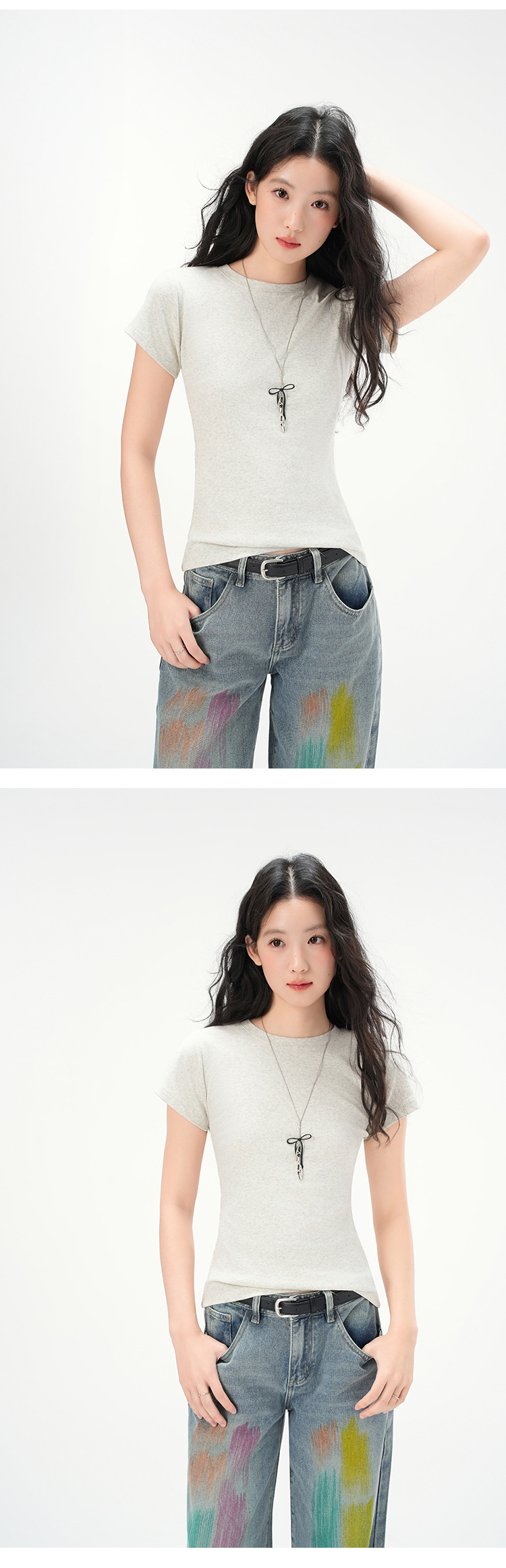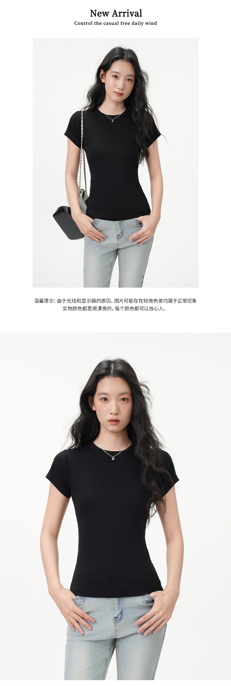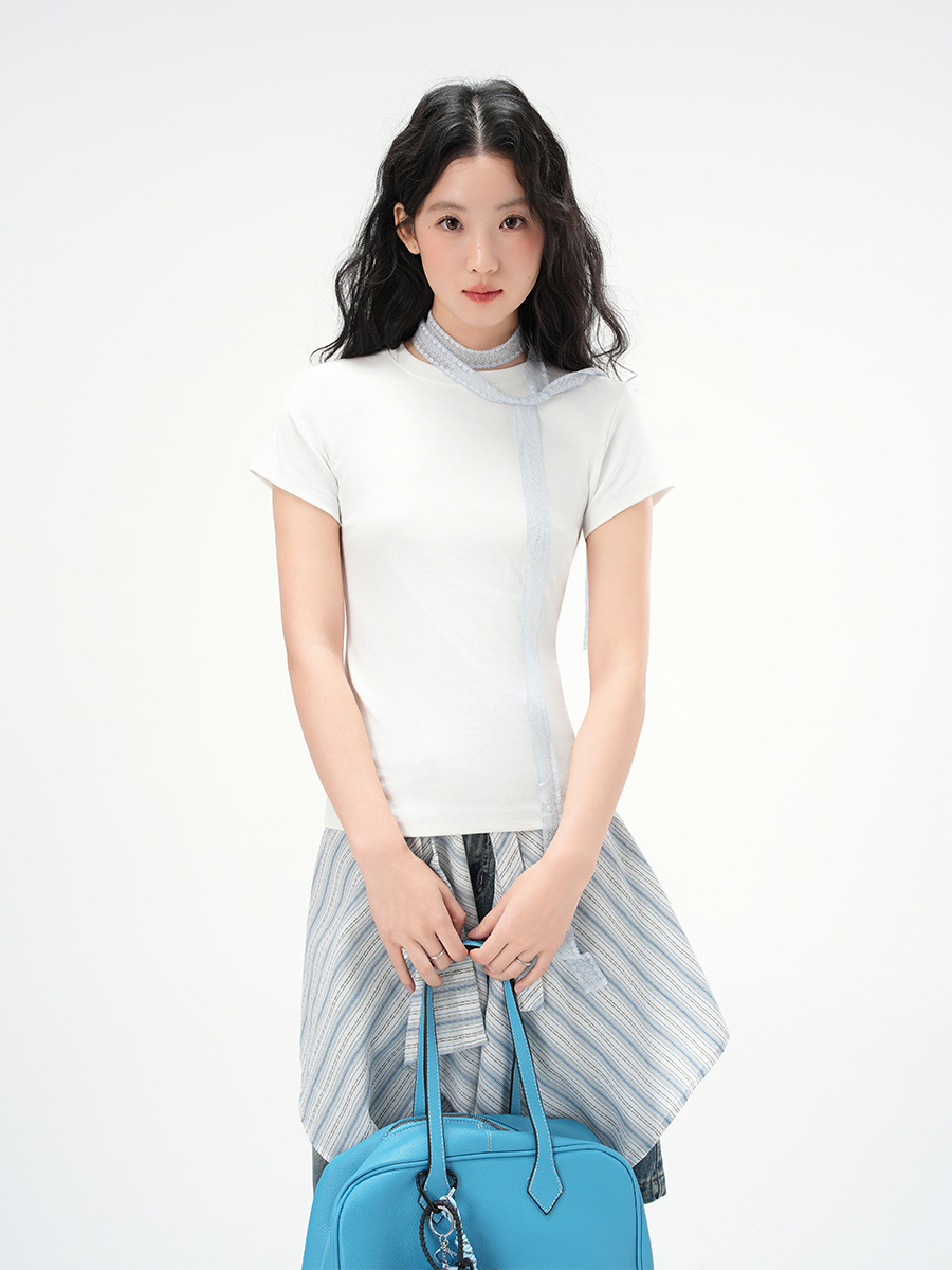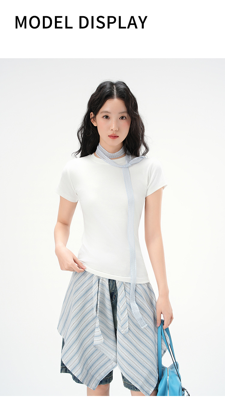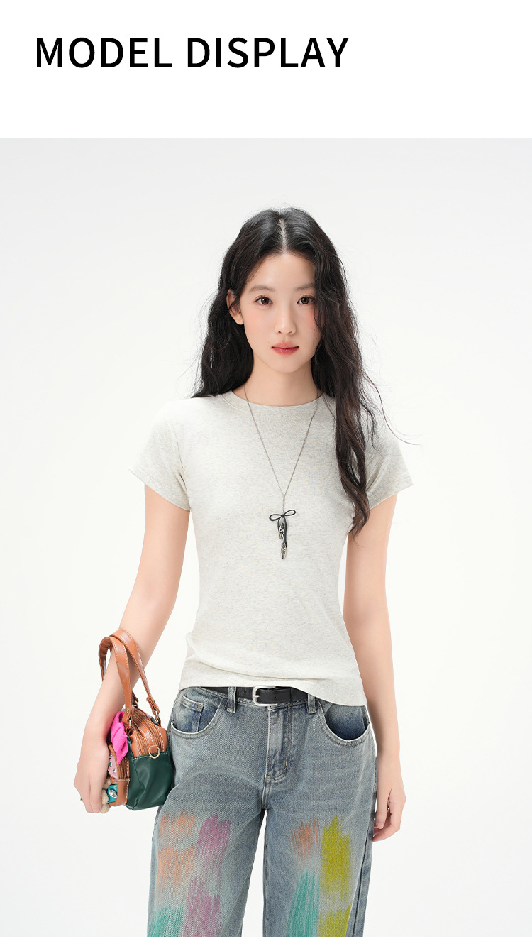 지유 2026 여름 라운드넥 기본 스타일 순면 오른쪽 어깨 티셔츠 여성용 미국 스타일 슬림핏 반팔 상의스토어 가기