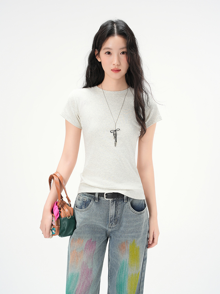 지유 2026 여름 라운드넥 기본 스타일 순면 오른쪽 어깨 티셔츠 여성용 미국 스타일 슬림핏 반팔 상의