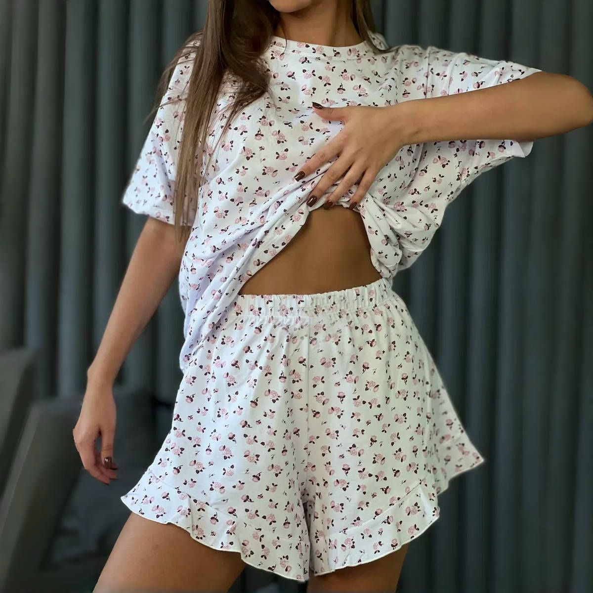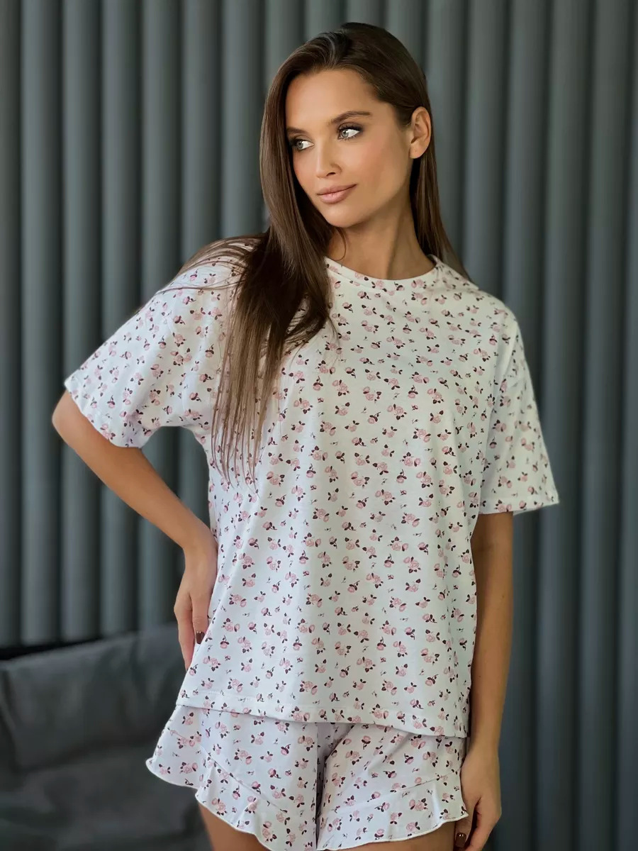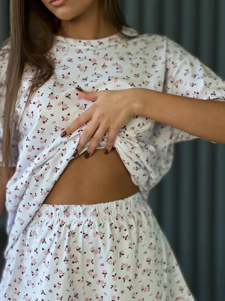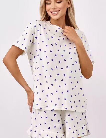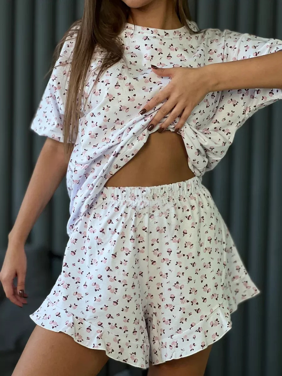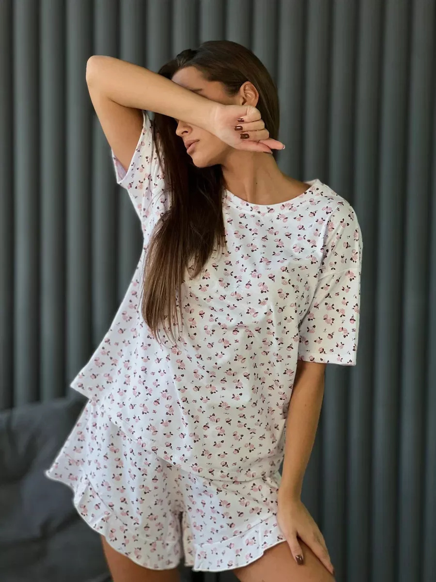 2025년 신상품 유럽 및 미국 봄 여름 신상 프린트 반바지 5부 소매 패션 캐주얼 여성 잠옷 홈웨어스토어 가기