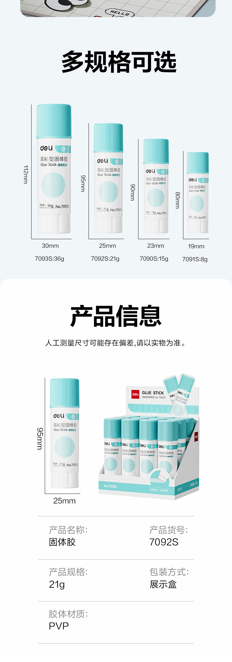 Deli 7092S 개인 PVP 고체 접착제 21g 포름 알데히드가없는 세척 가능한 높은 점도 접착제 스틱 수동 사무실 사용