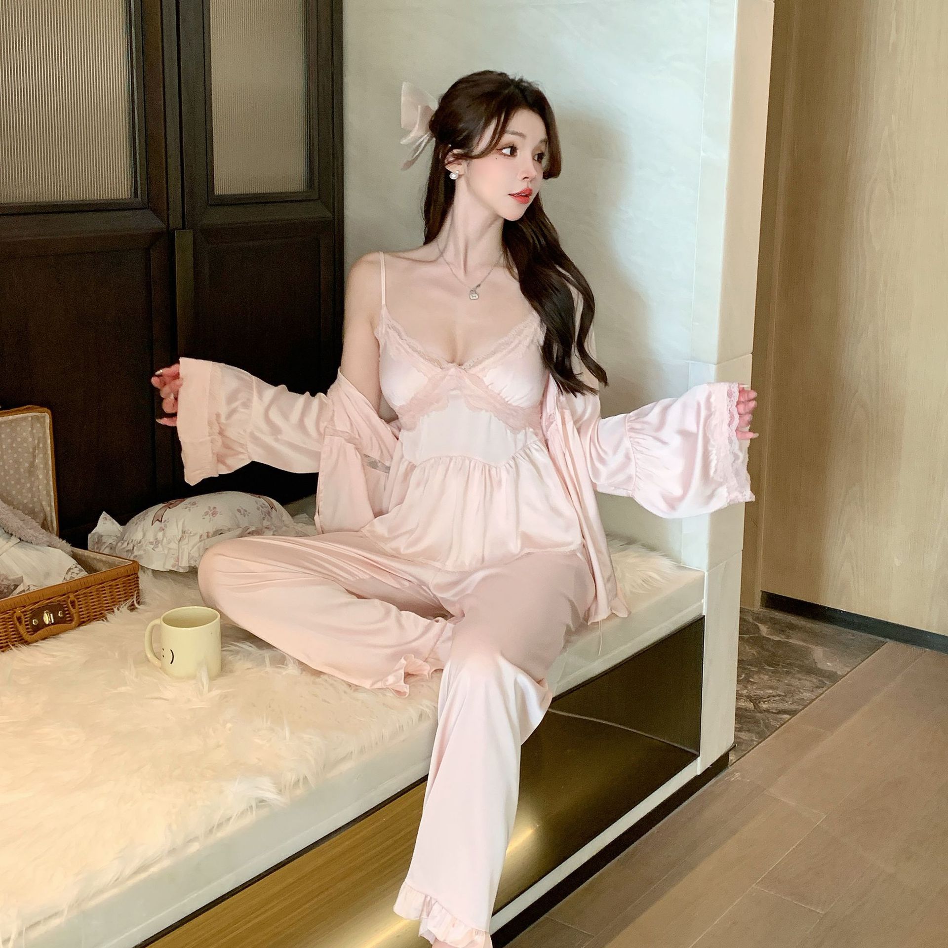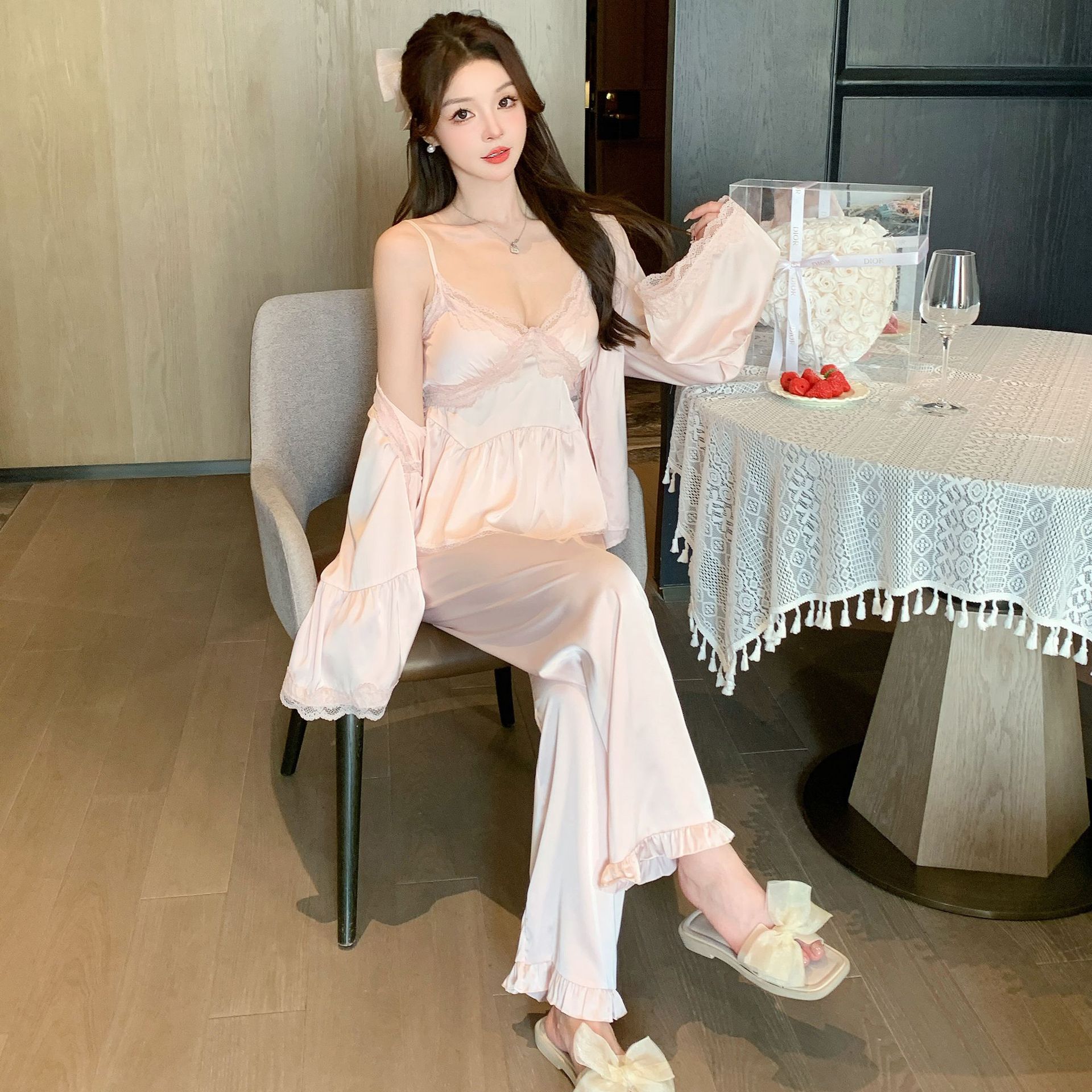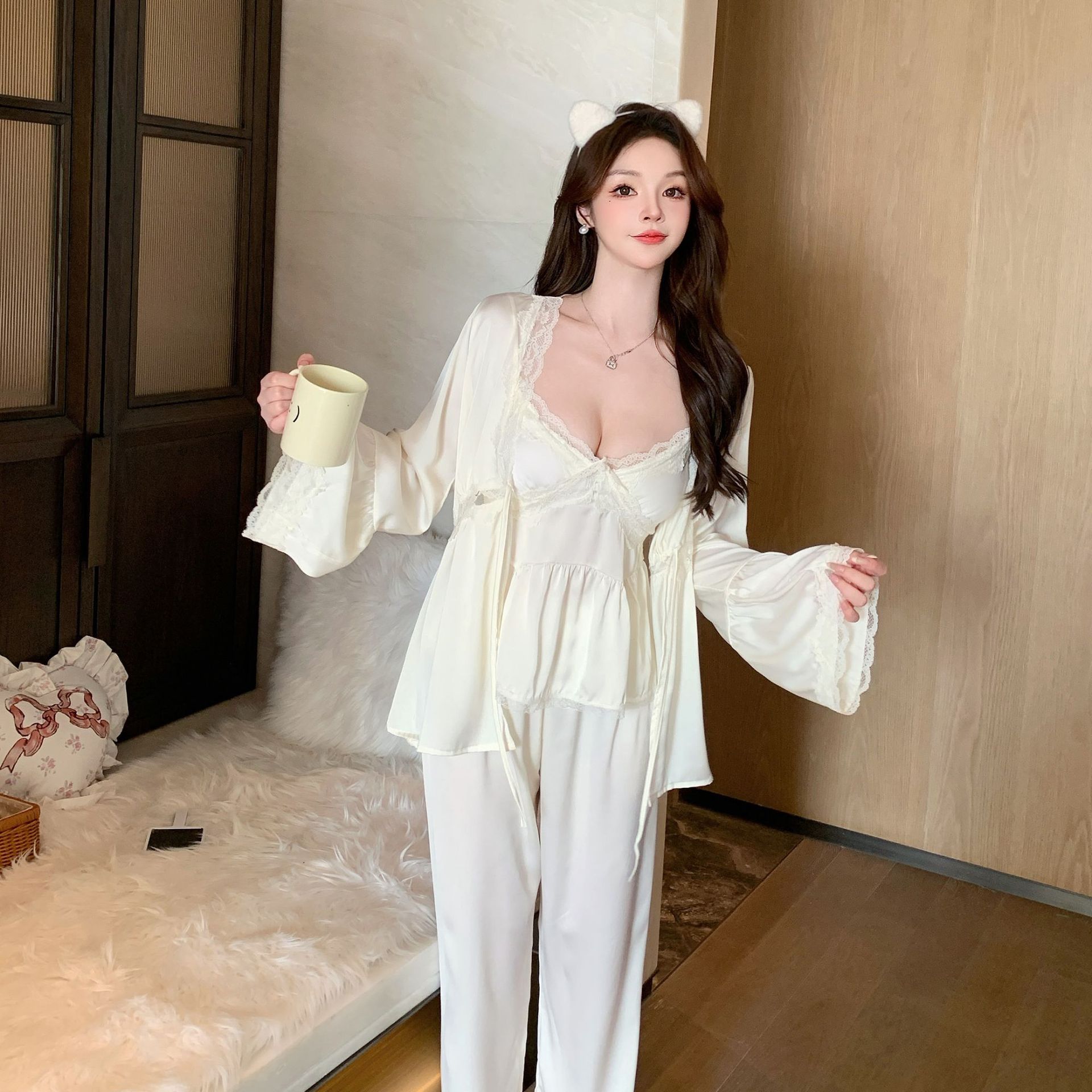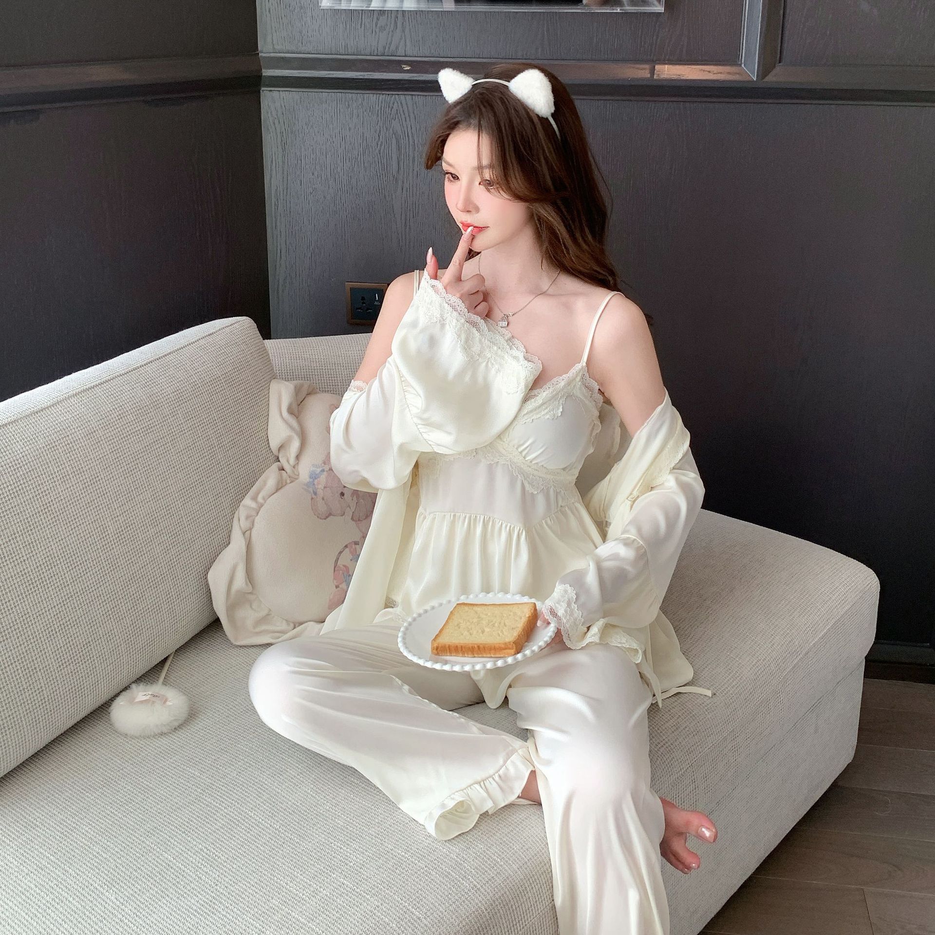 레이스 슬링 3 피스 세트 여성의 순수한 봄과 여름 새틴 실크 긴팔 홈 의류 따뜻하고 편안한 세트