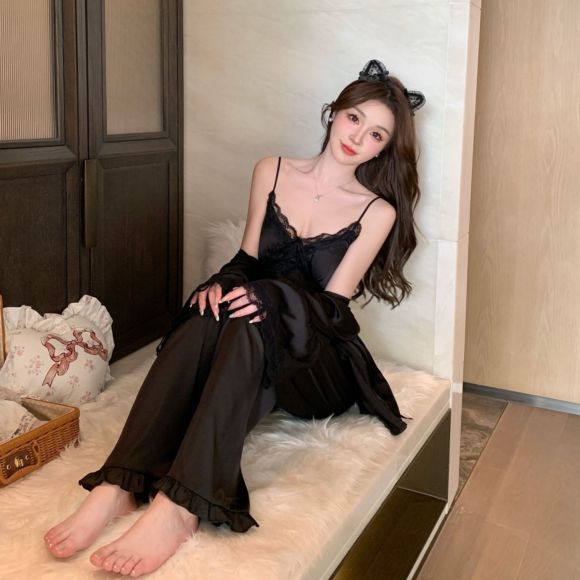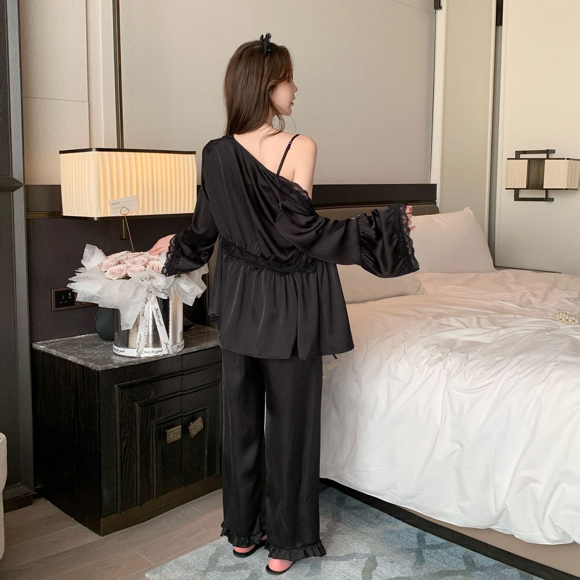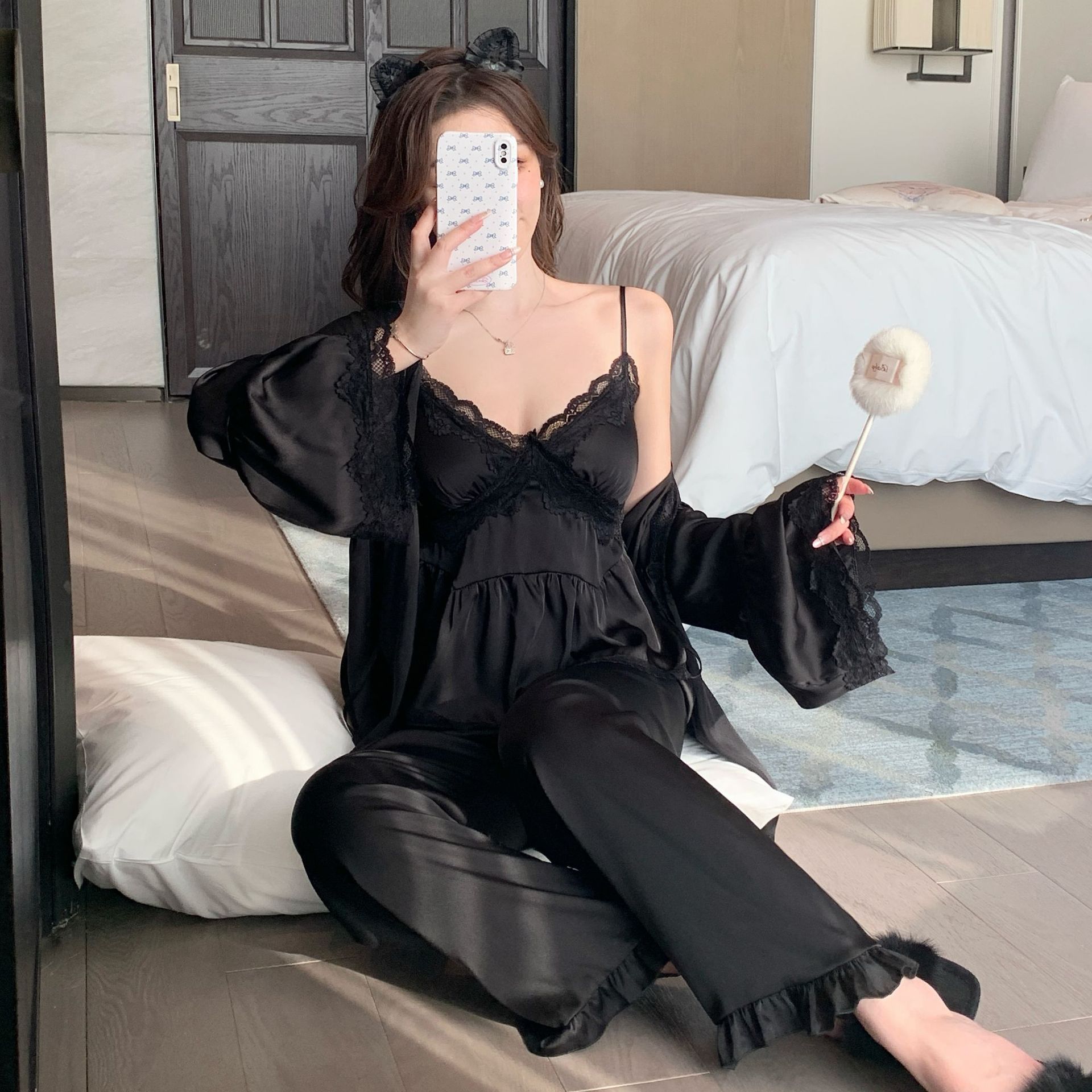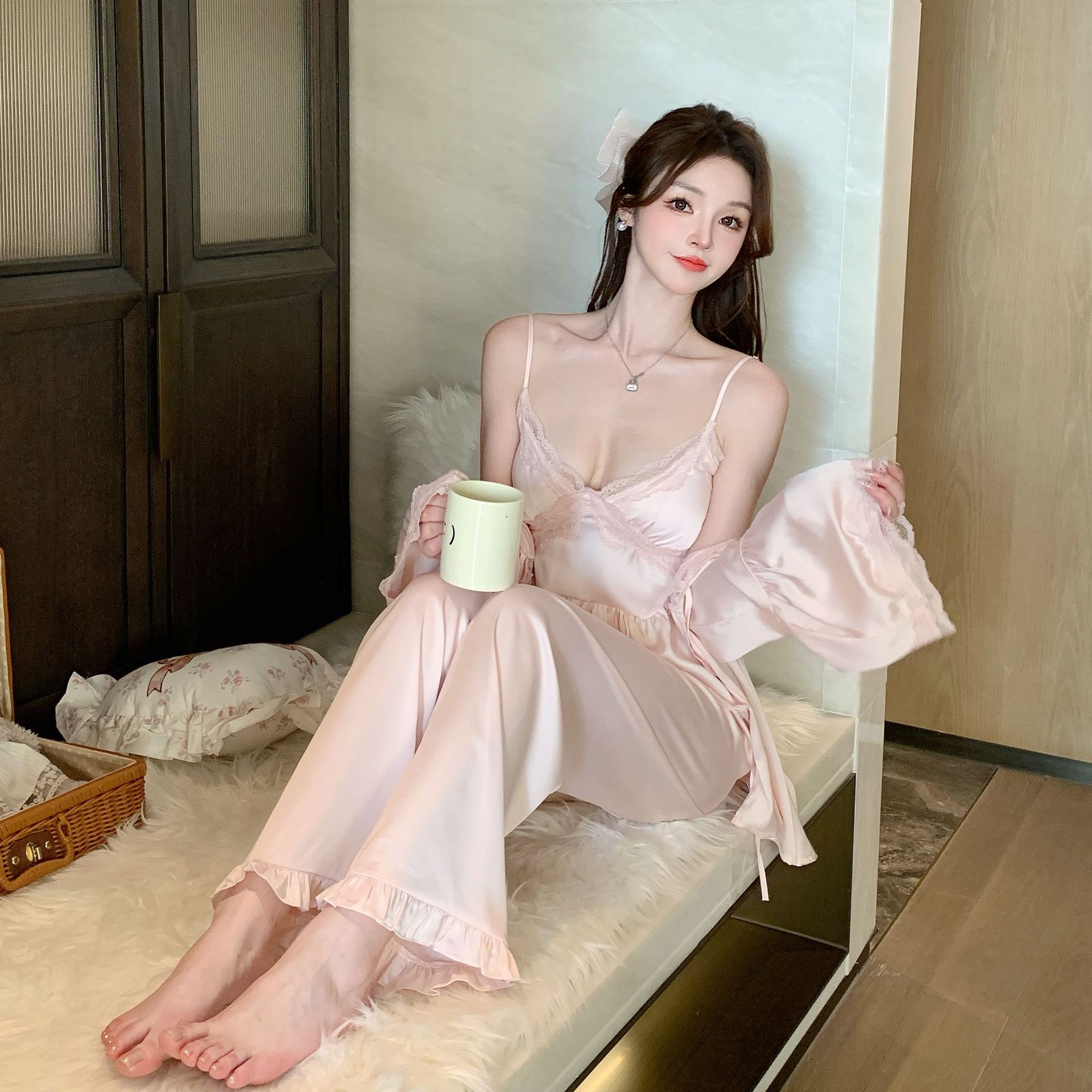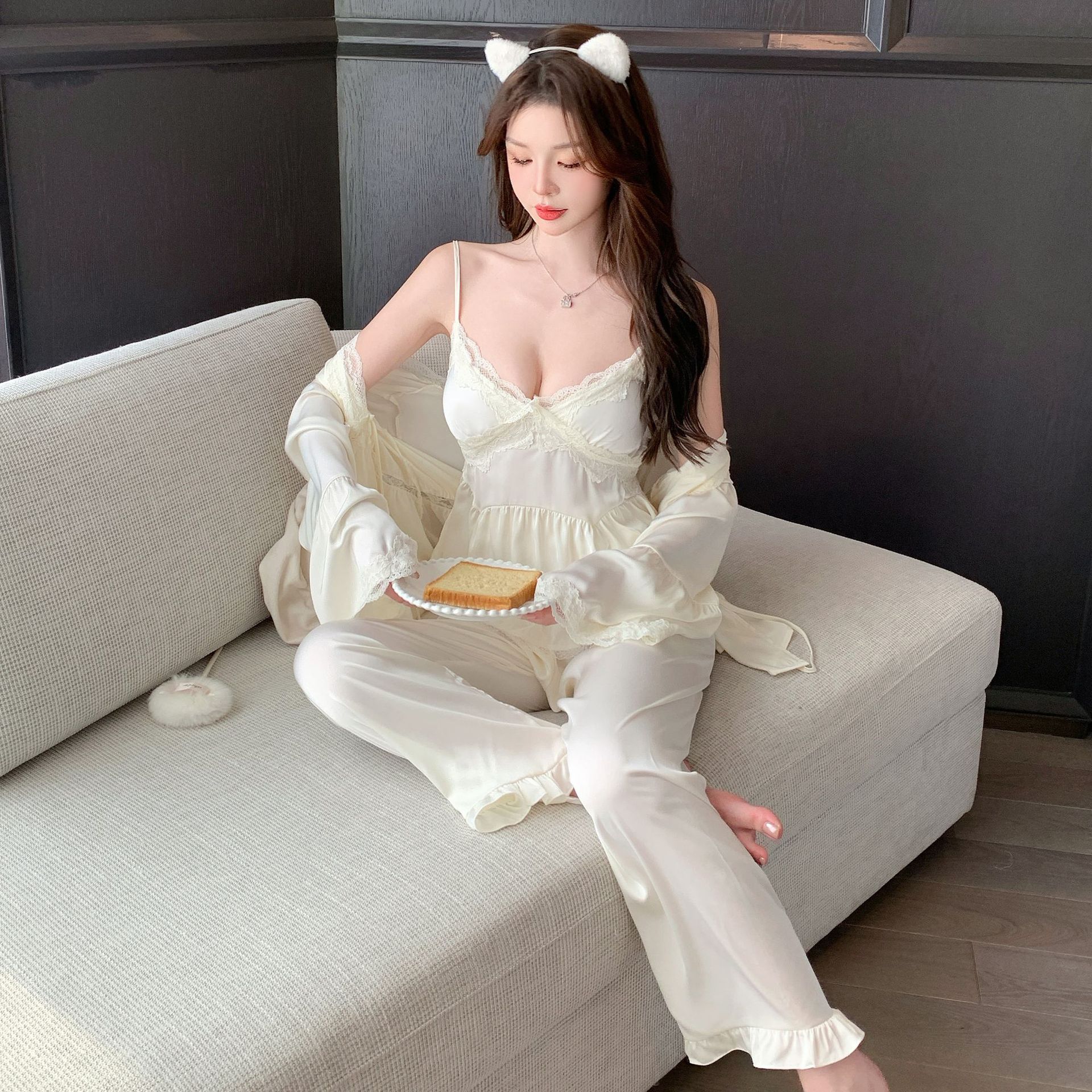 레이스 슬링 3 피스 세트 여성의 순수한 봄과 여름 새틴 실크 긴팔 홈 의류 따뜻하고 편안한 세트