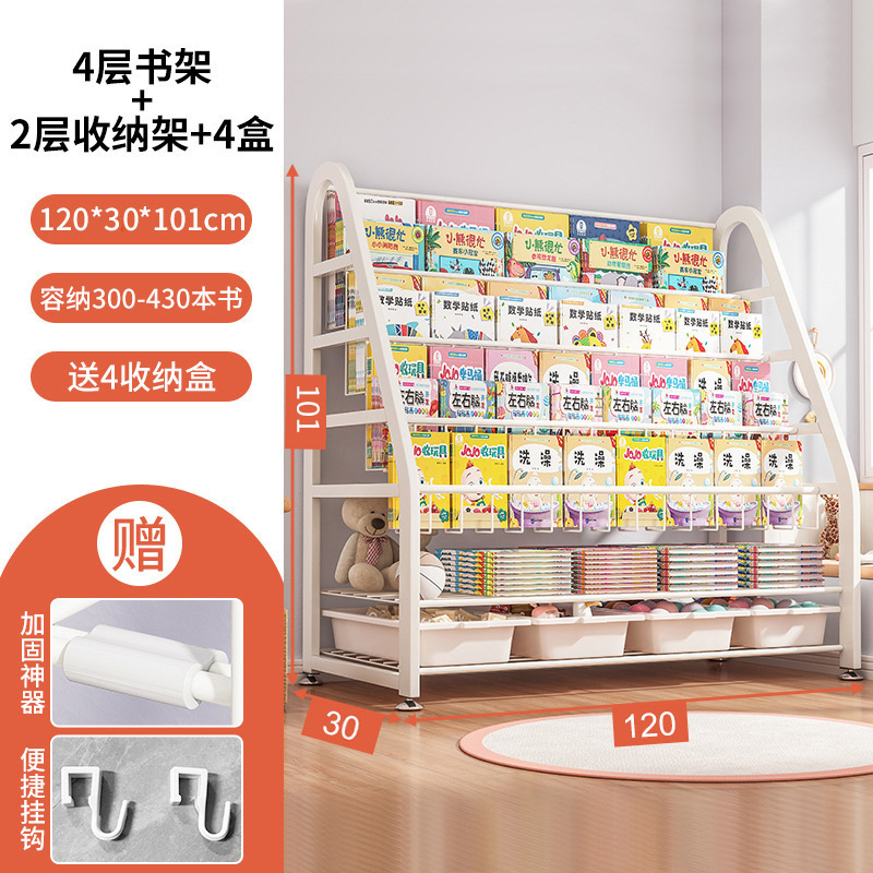 • 사이즈 업그레이드 [두꺼운 탄소강] 120cm-4단 책장 + 2단 수납선반 + 흰색 상자 4개★고정 스타일