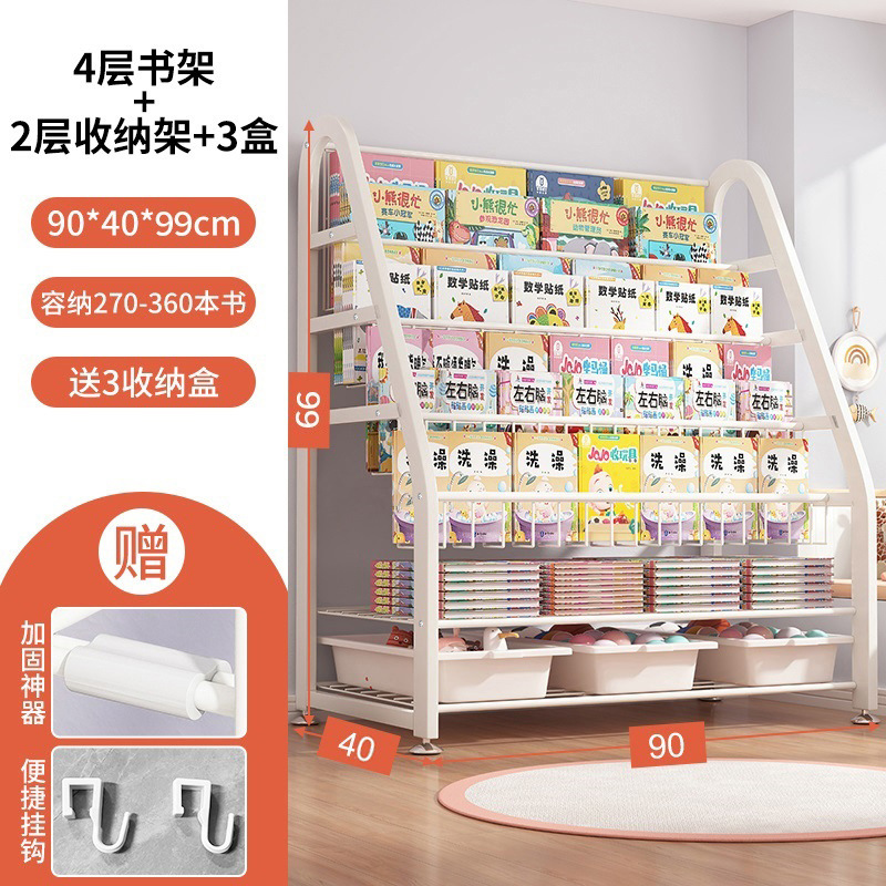 • 레이어 수 업그레이드 [두꺼운 탄소강] 90cm - 4단 책장 + 2단 수납선반 + 화이트 박스 3개★고정 스타일