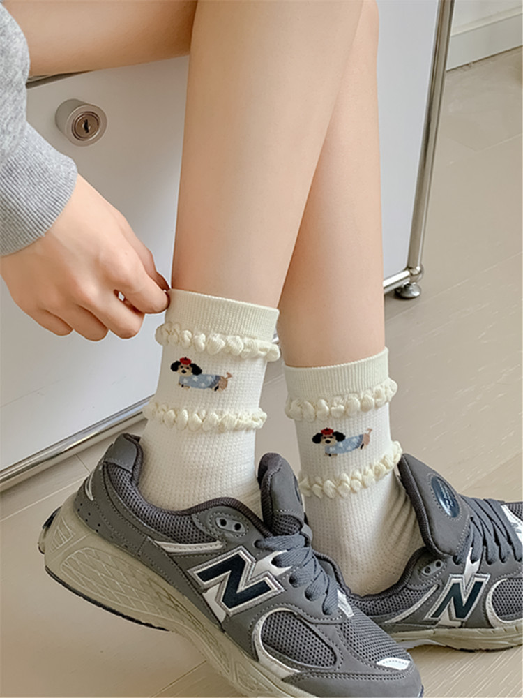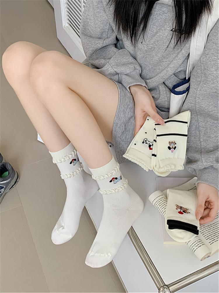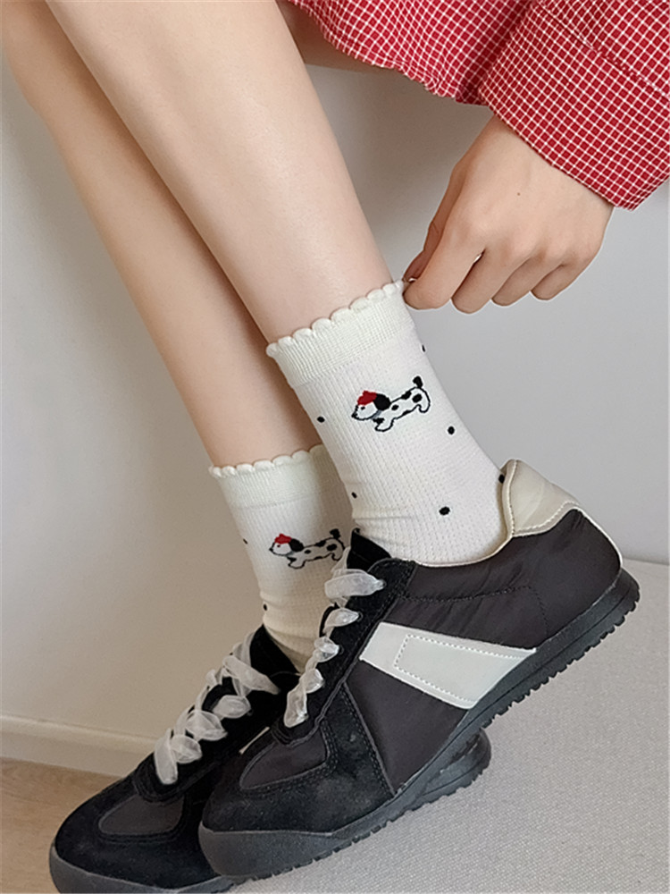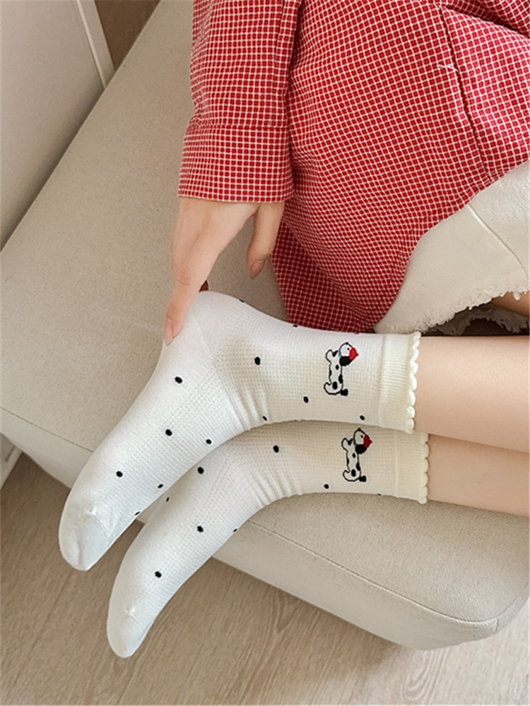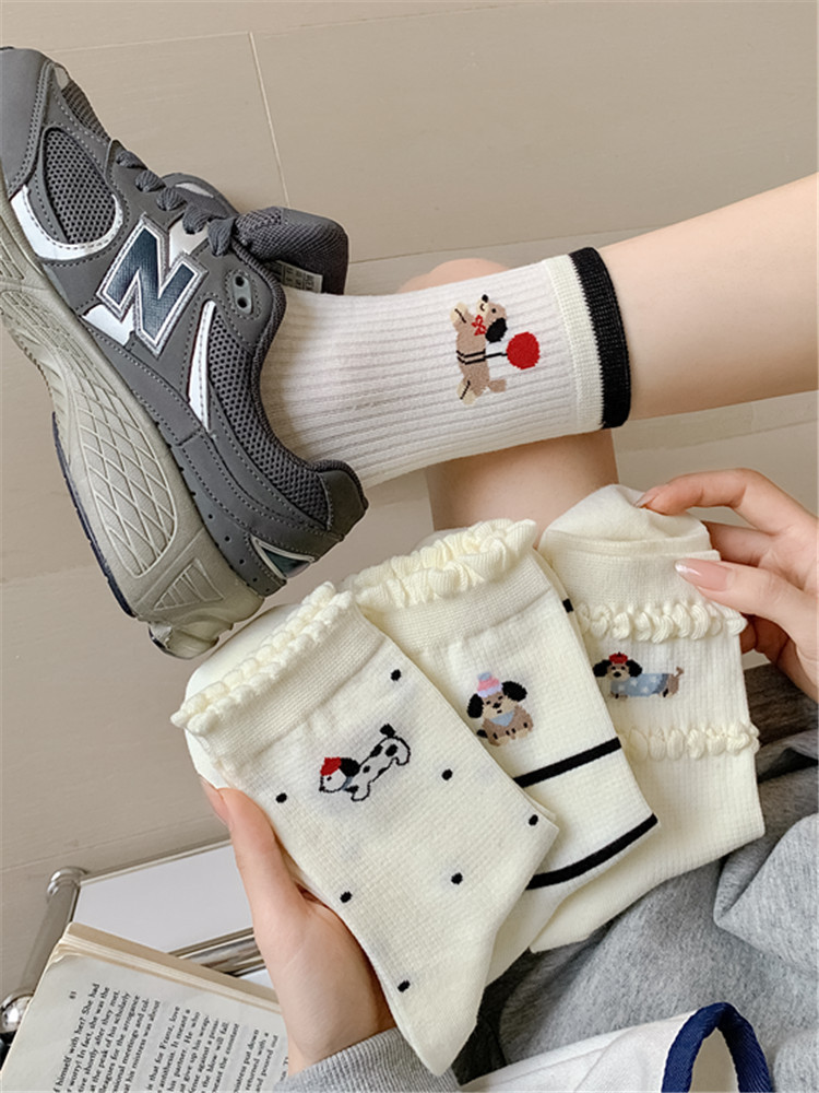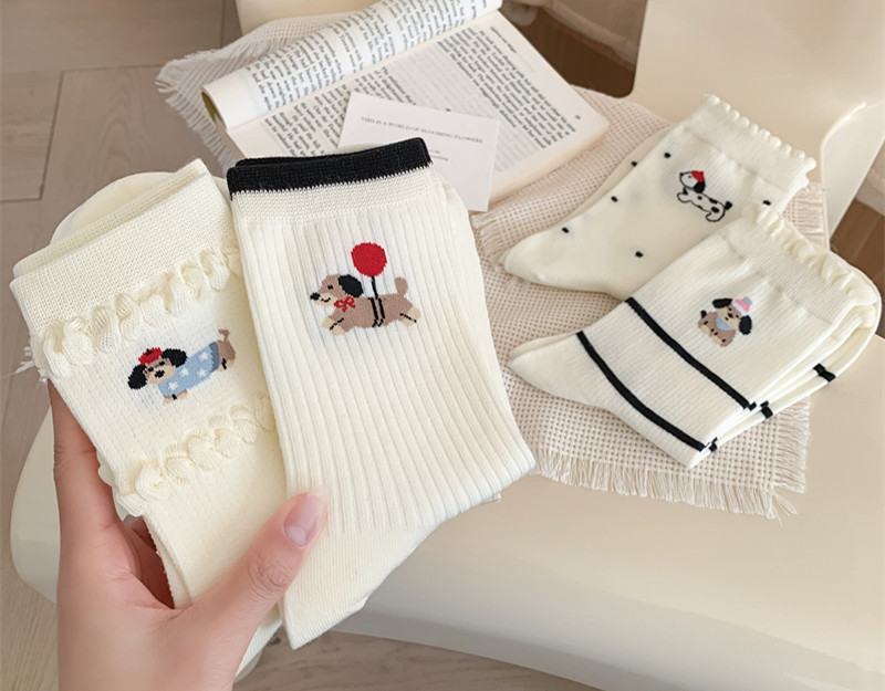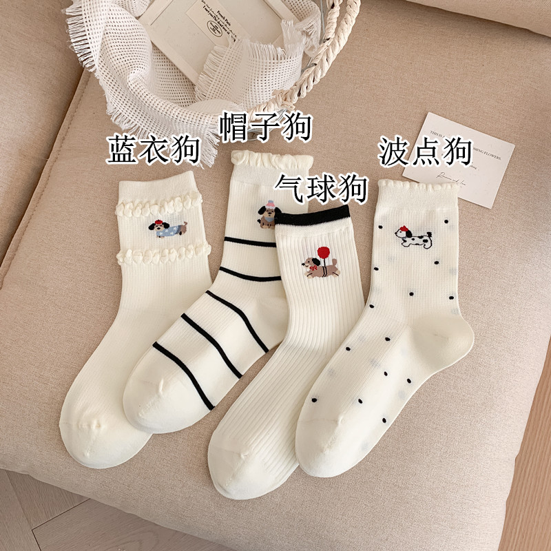 새로운 만화 귀여운 강아지 면 양말 중간 튜브 양말 봄과 가을 여름 대학 스타일 스태킹 양말 Ins 트렌디 한 올 매치