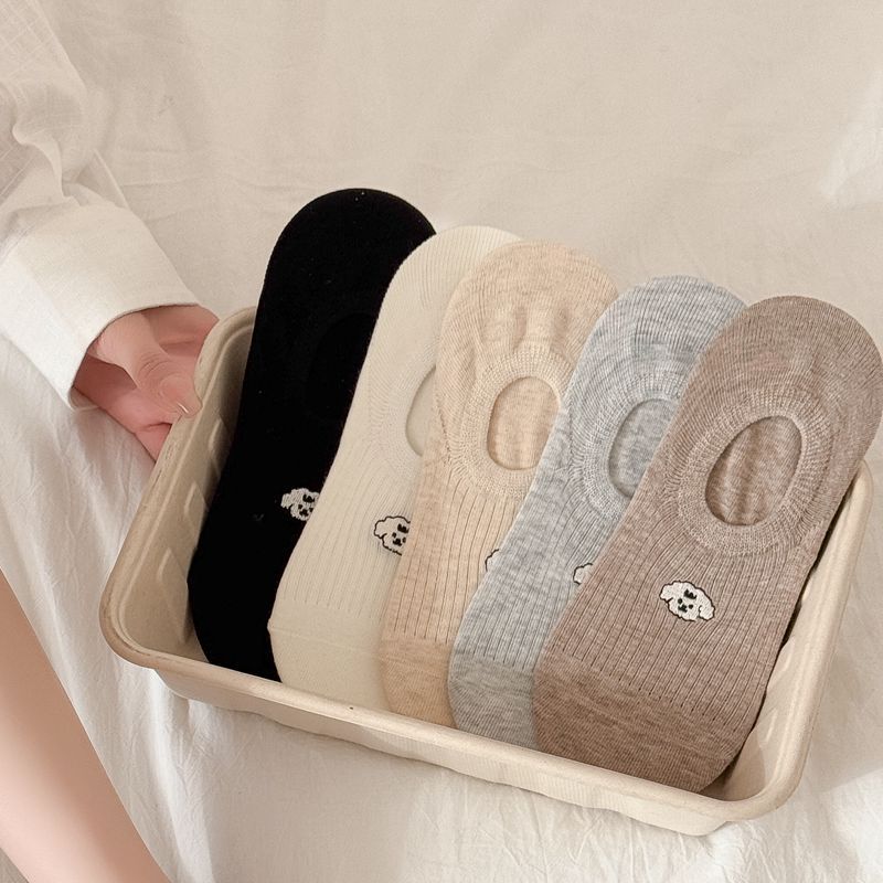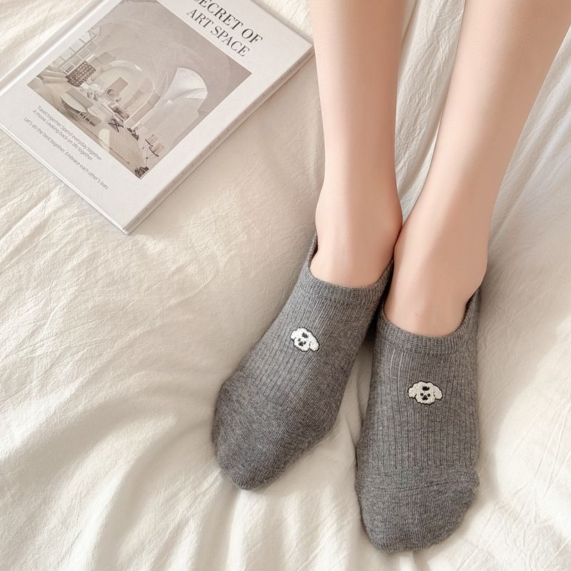 봄과 여름 단색 귀여운 만화 강아지 자수는 얇은 미끄럼 방지 실리콘 얕은 양말 여성 양말 보이지 않는 양말로 떨어지지 않습니다.스토어 가기