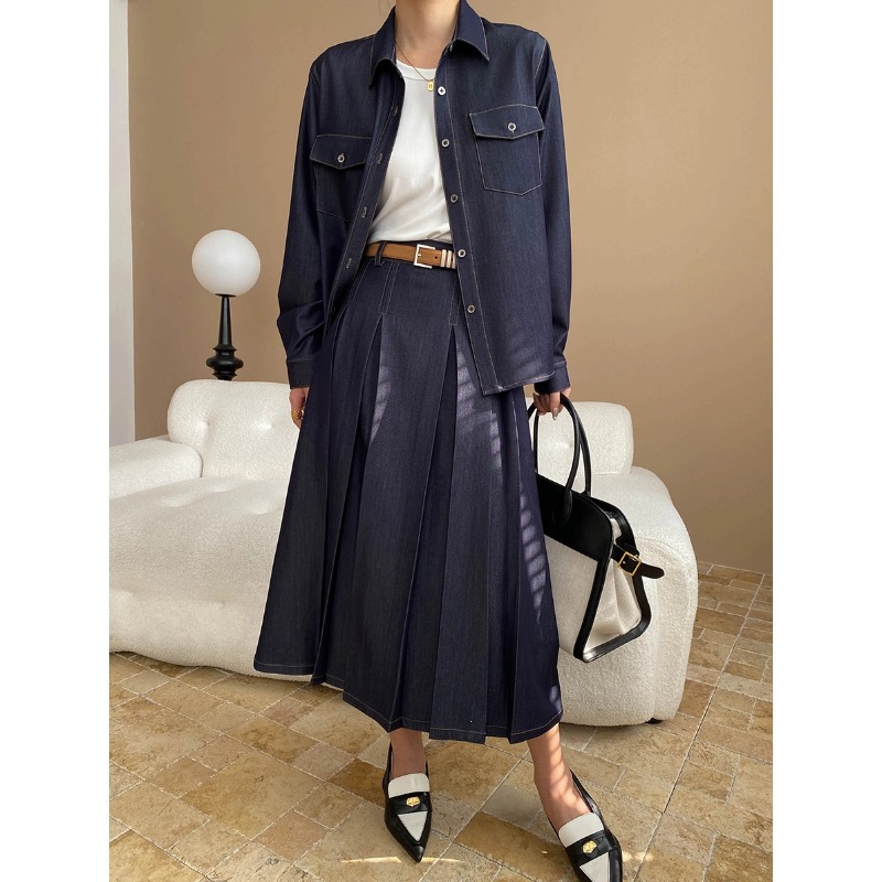 Sinan 초가을 신상 텐셀 레트로 데님 셔츠 하이웨이스트 플리츠 스커트 슈트 SN7073