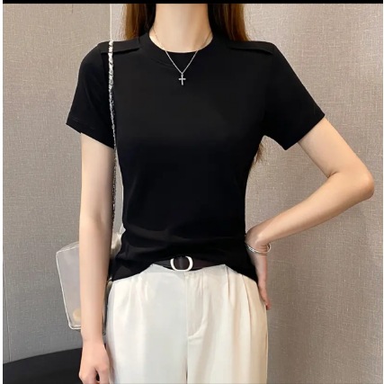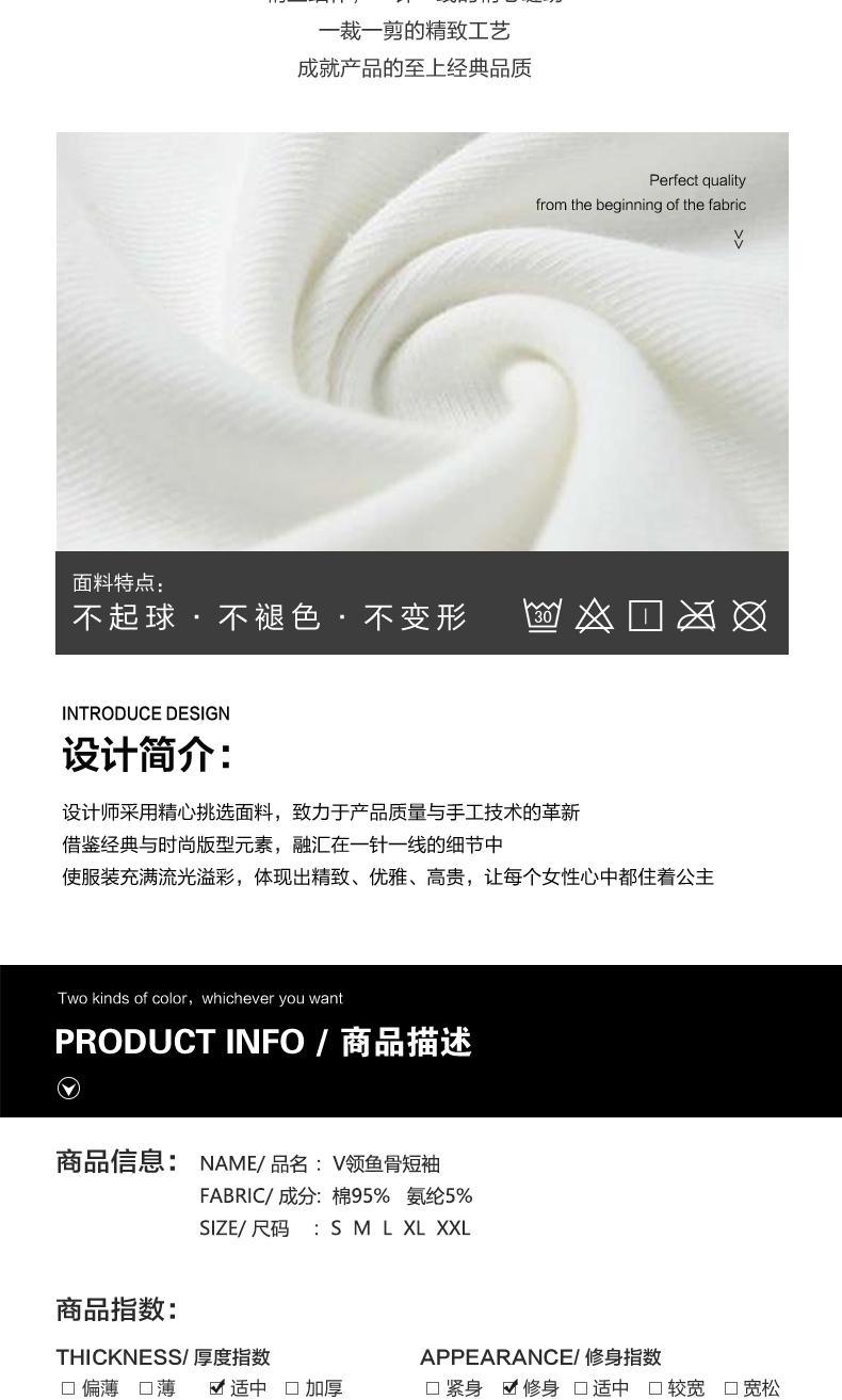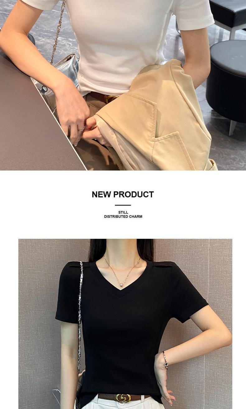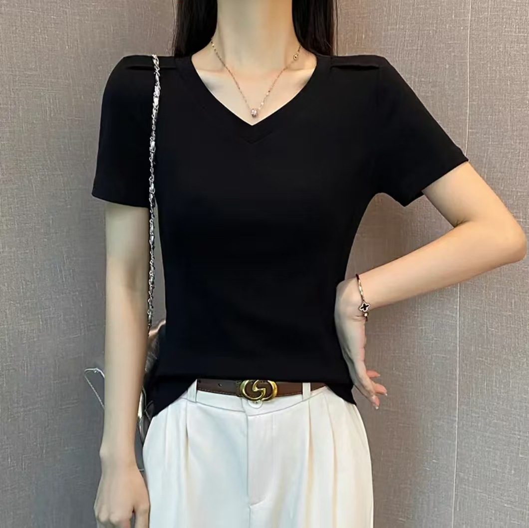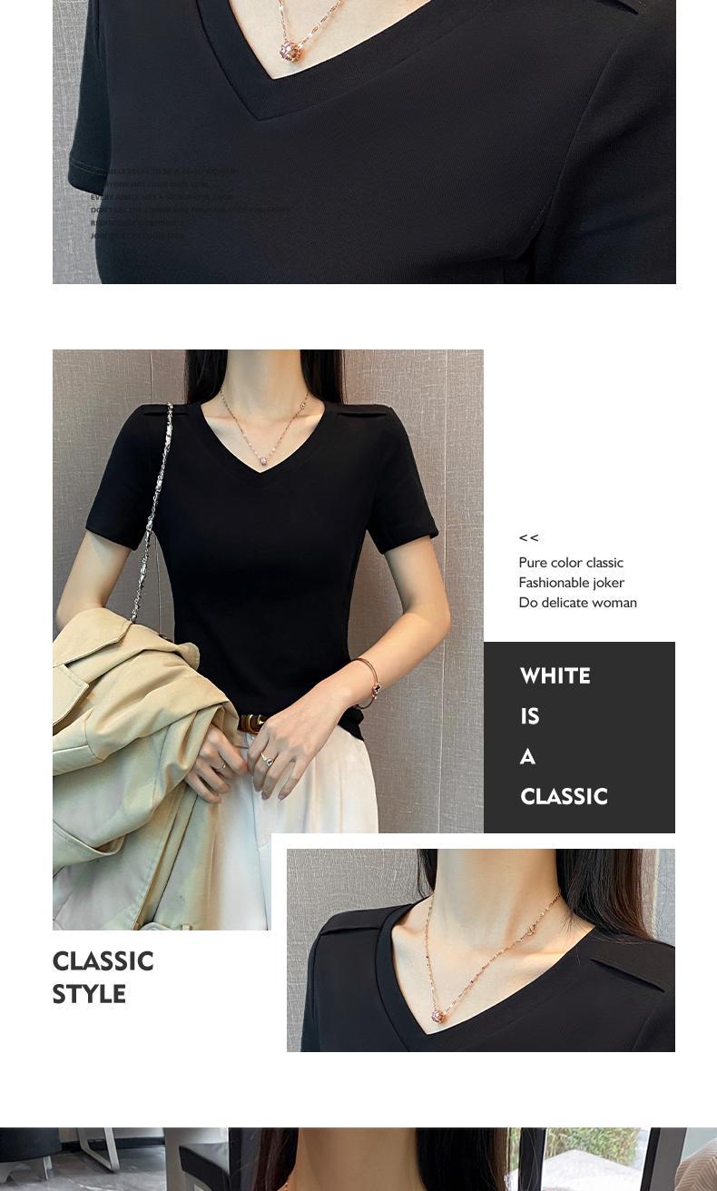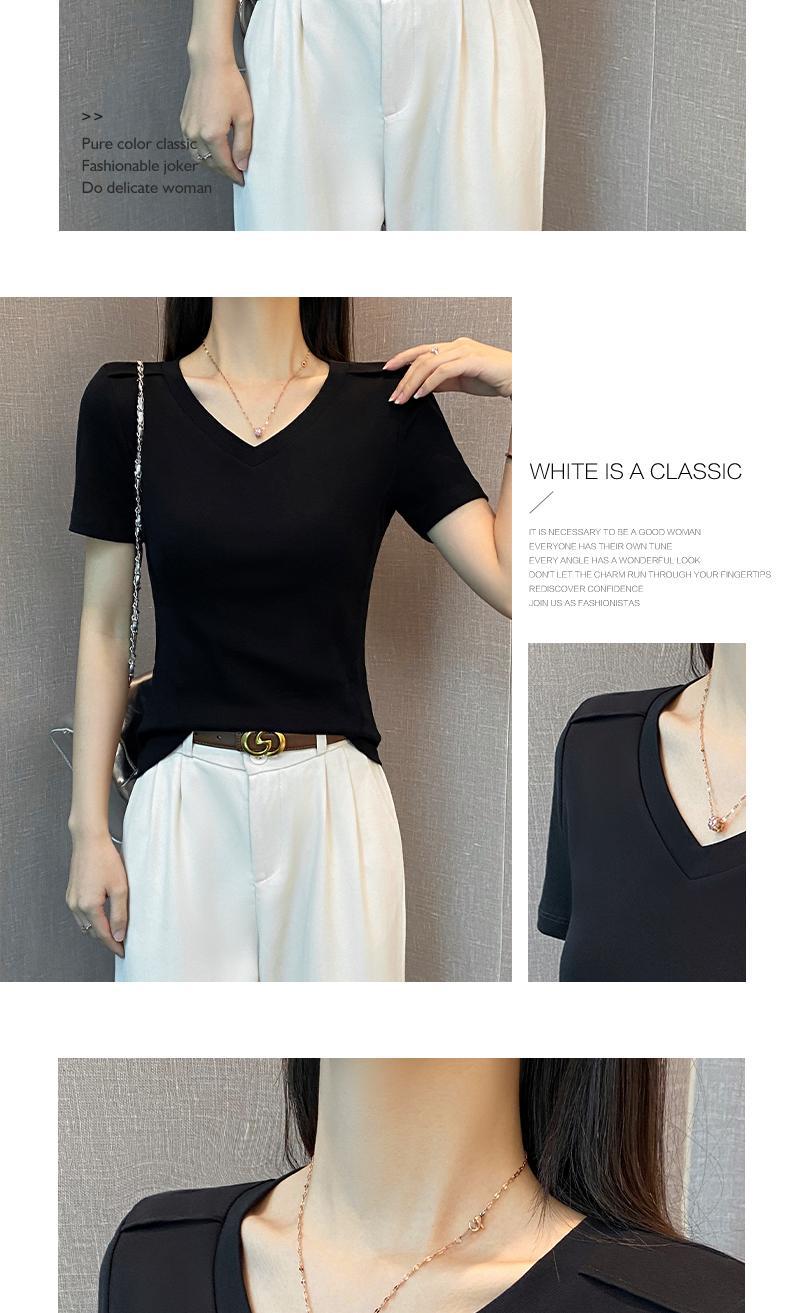 흑백 V-Neck Fishbone 반팔 티셔츠 여성의 봄과 여름 낮은 목 슬림베이스 셔츠 내부 어깨 슬리밍 탑스토어 가기