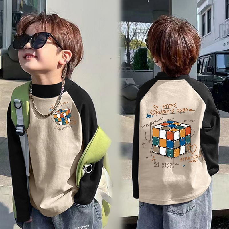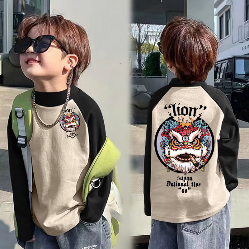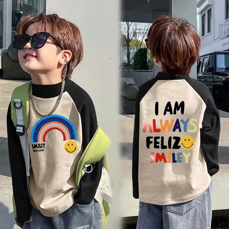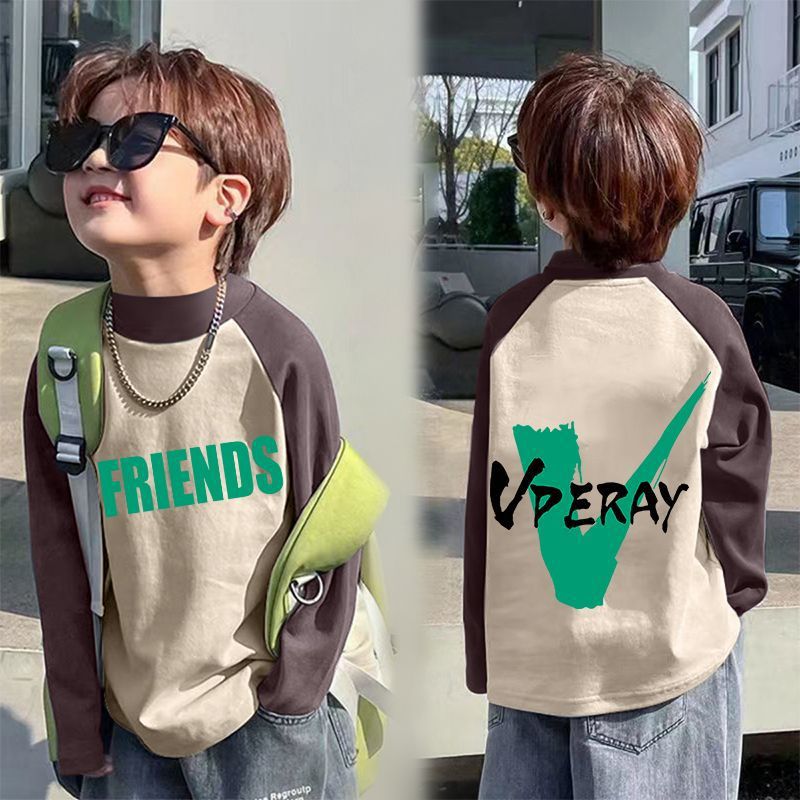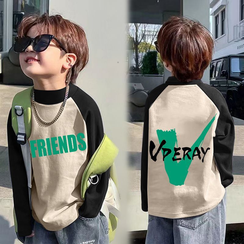 아동베이스 셔츠 드 벨벳 따뜻한 봄과 가을 새로운 중대형 어린이 하프 하이 칼라 티셔츠 아기 콘트라스트 컬러 베이스 셔츠스토어 가기