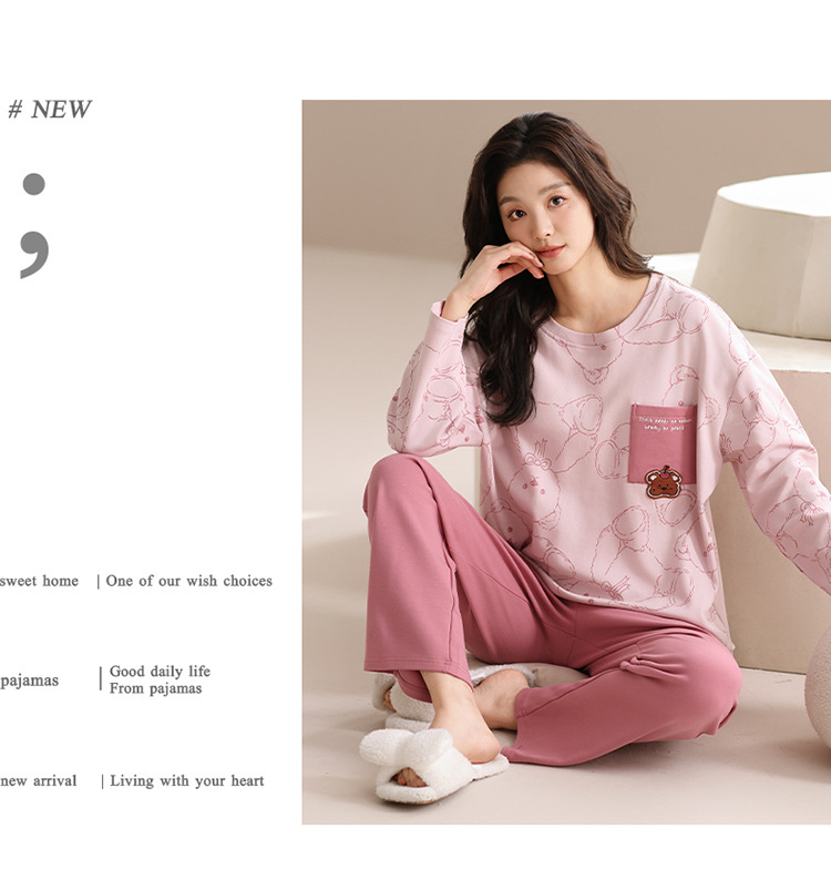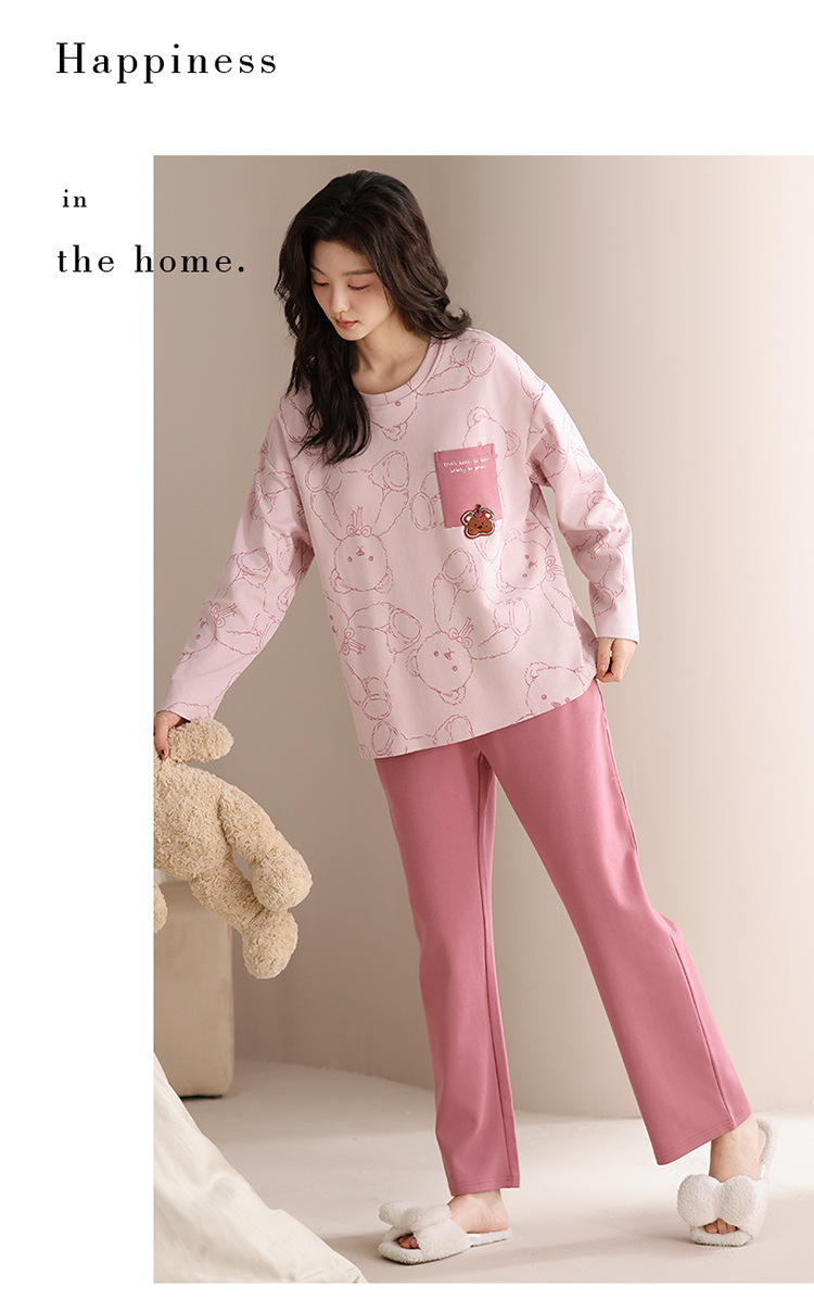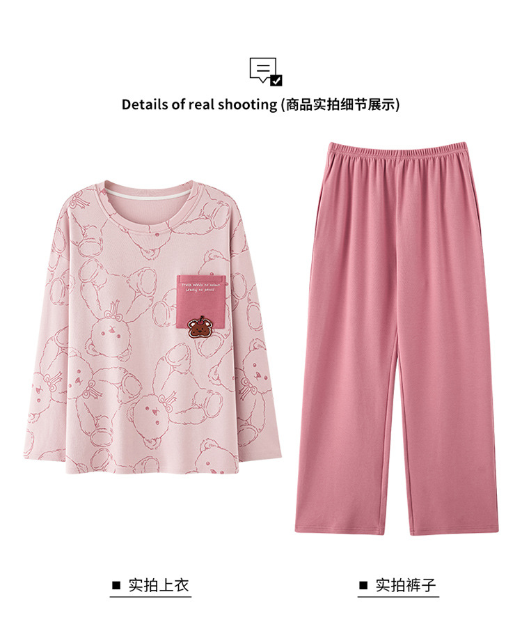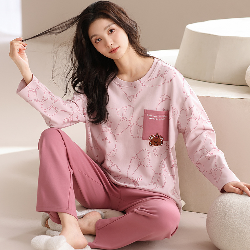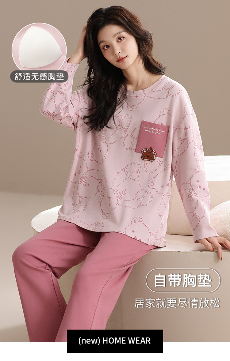 봄 2025 새로운 6535 양면 소녀 크루 넥 머리띠 가슴 패드 긴 소매 파자마 여성 홈 의류 세트