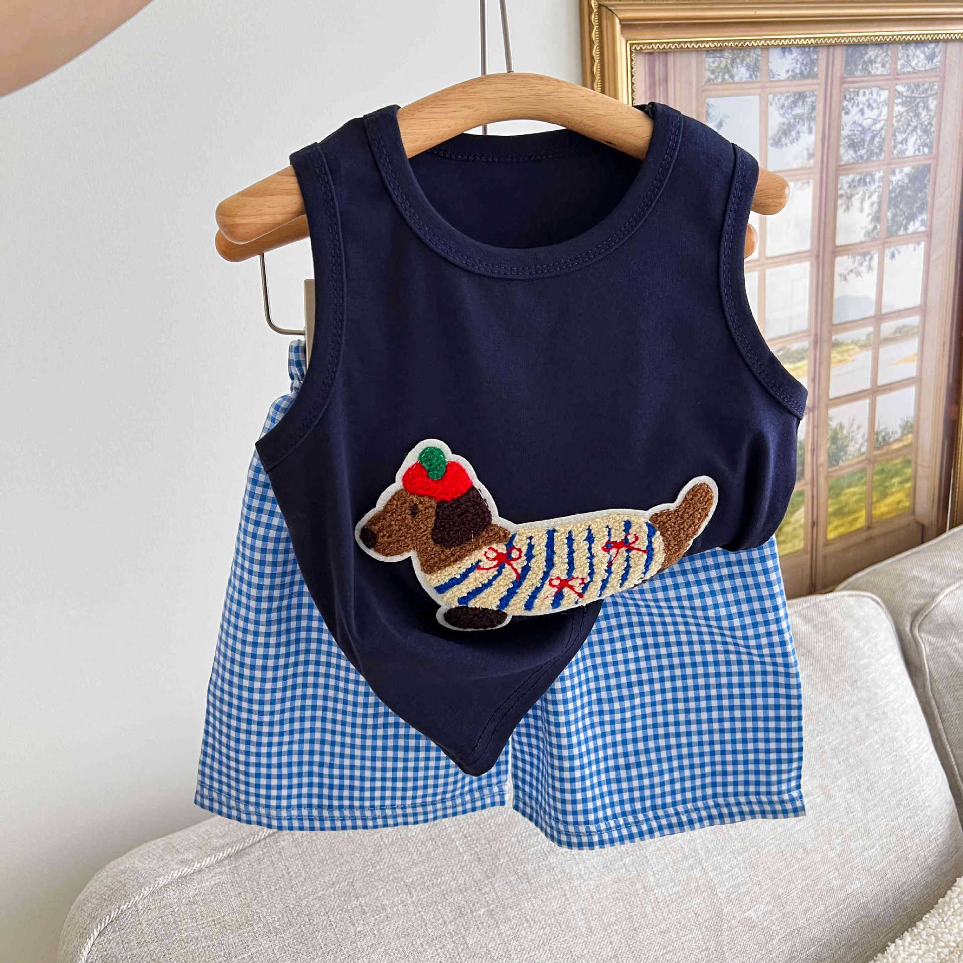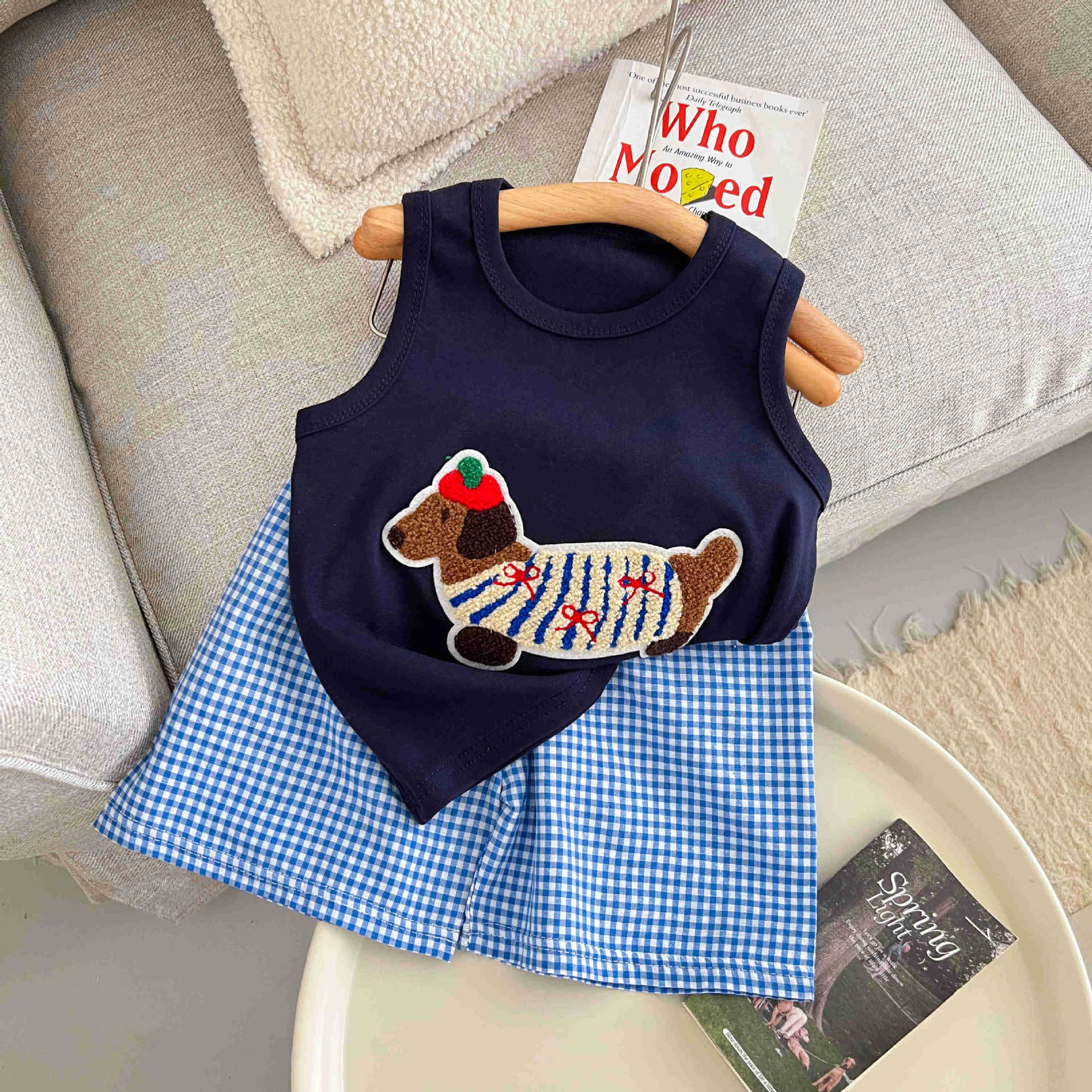• 개 조끼 + 파란색 체크 무늬 반바지