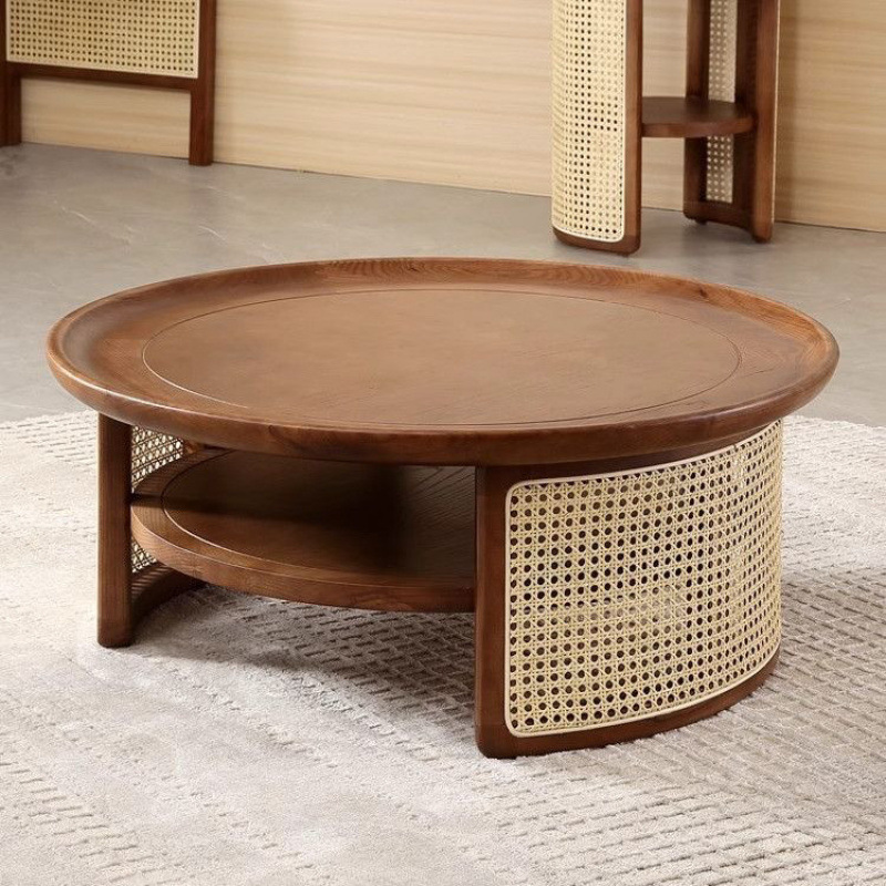 프랑스 스타일 빈티지 솔리드 우드 등나무 커피 테이블 일본식 라운드 노르딕 티 테이블 홈 거실 간단한 홈스테이 테이블