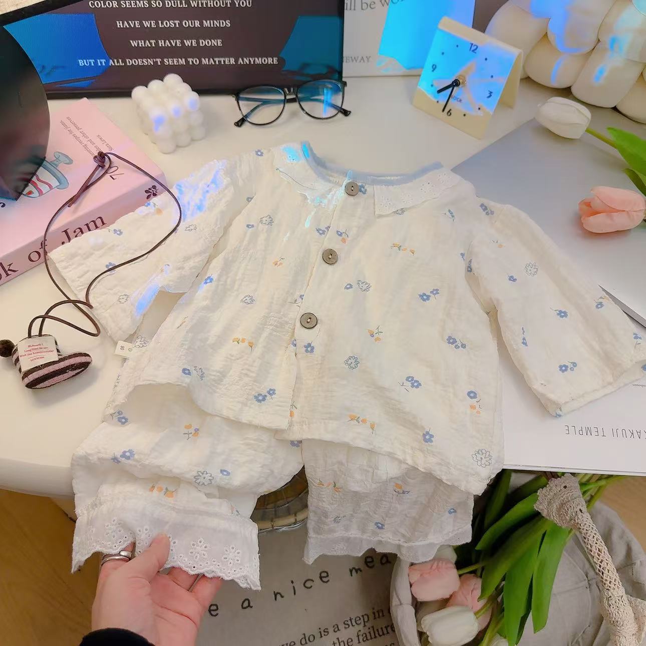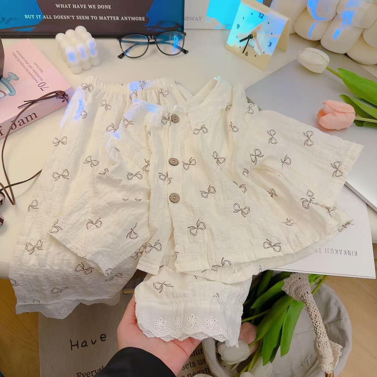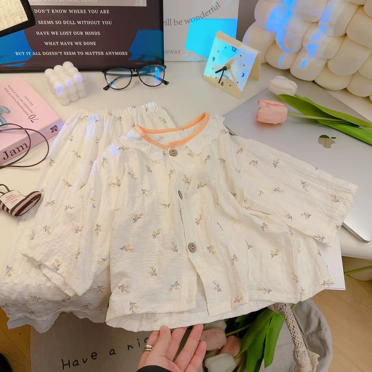 어린이 시간 면 잠옷 세트 소녀 여름 새로운 항균 달콤한 레이스 7 점 소매 홈 옷 투피스 세트