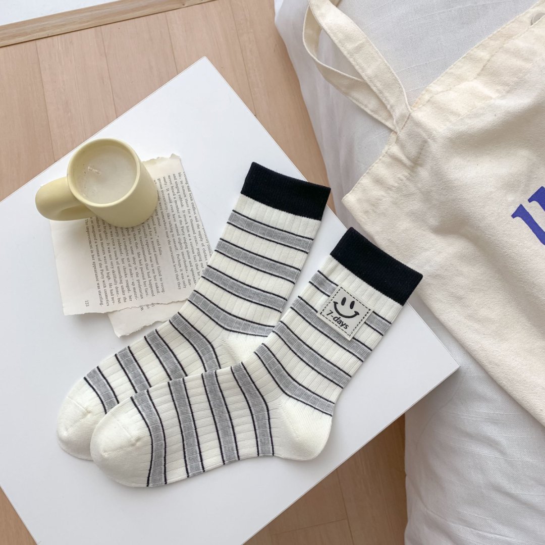 Mekki 25 봄 여름 새로운 한국 스타일 웃는 천 라벨 얇은 통기성 여성 중반 송아지 양말 스트라이프 캐주얼 파일스토어 가기
