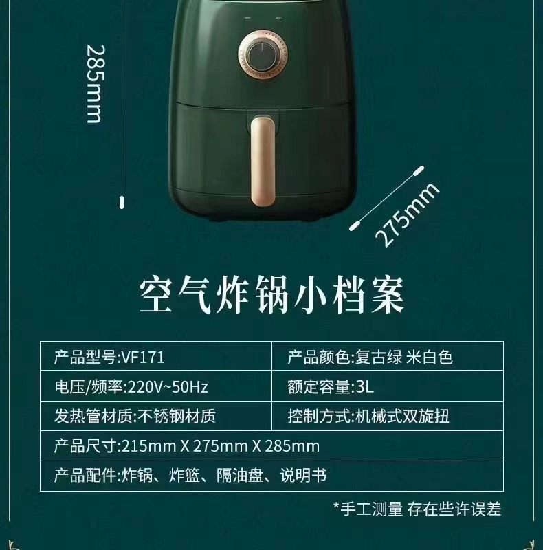 Jiuyang 공기 프라이어 VF171 가정용 다기능 전기 프라이어 3 리터 용량 베이킹 감자 칩 기계 선물 도매스토어 가기