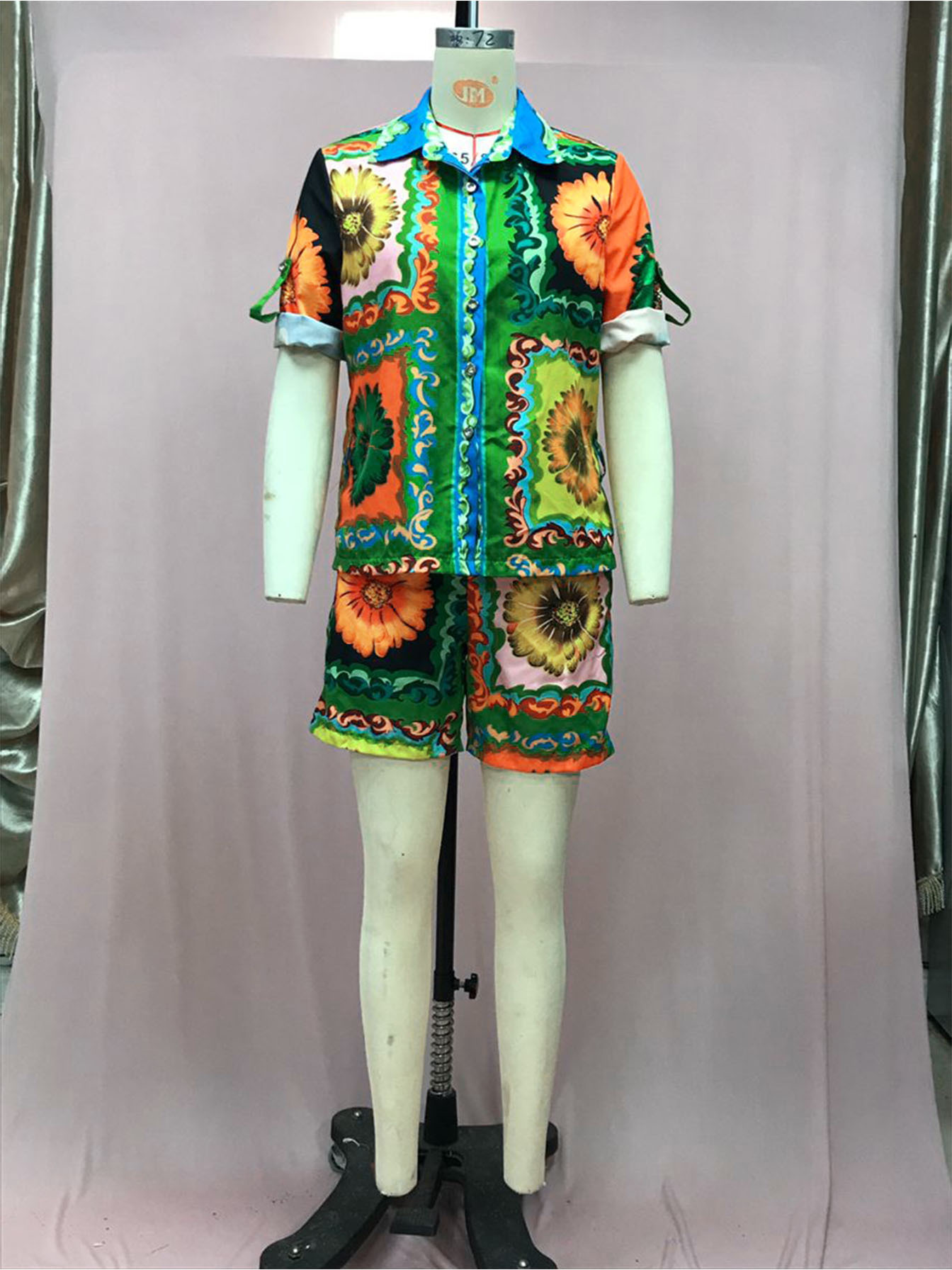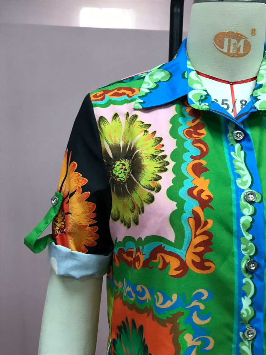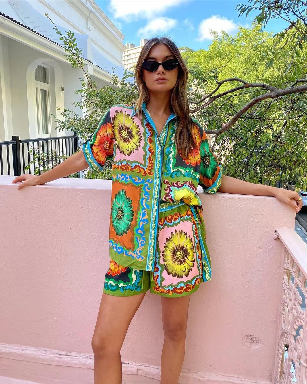 M2025 유럽과 미국의 새로운 AliExpress 느슨한 캐주얼 패션 올매치 인쇄 데이지 꽃 반바지 셔츠 두 세트