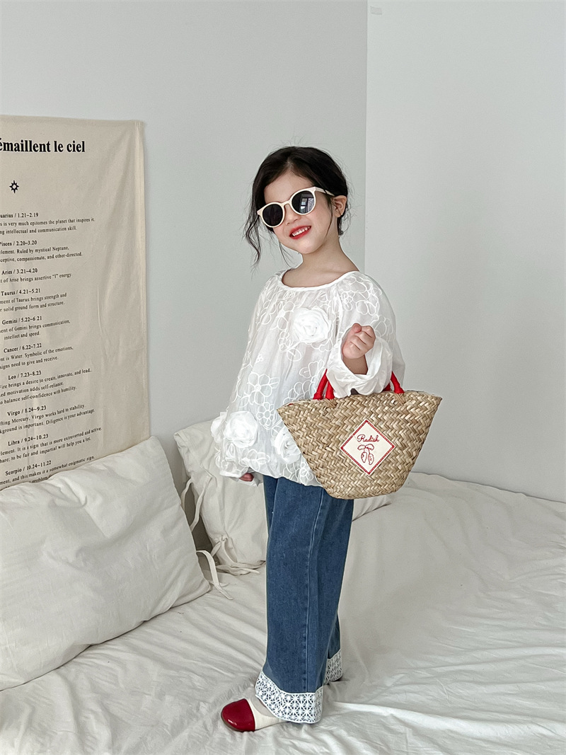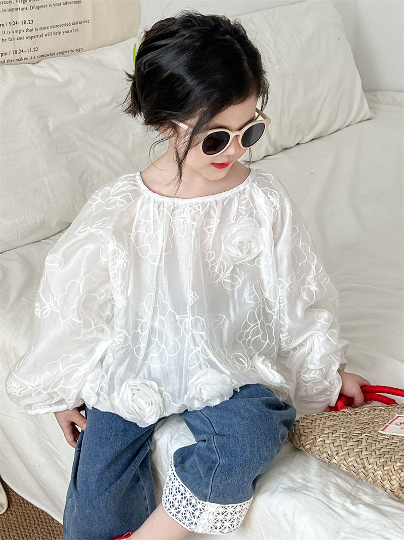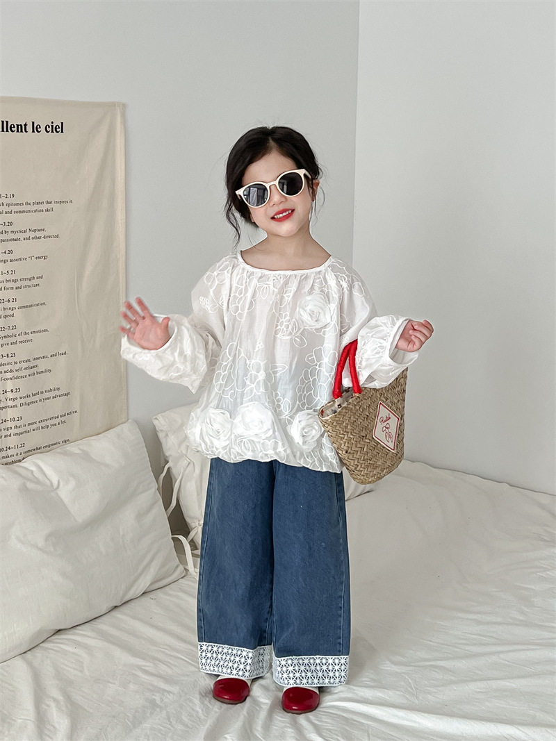 아동복 소녀 유행 무거운 자수 인터넷 축하 랜턴 슬리브 스테레오 꽃 스윙 셔츠 레이스 청바지 싱글 비트스토어 가기