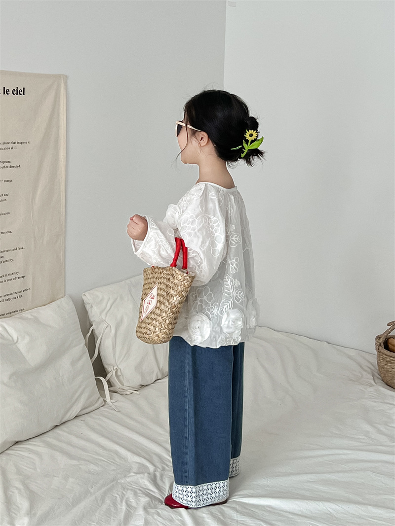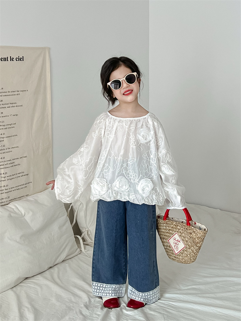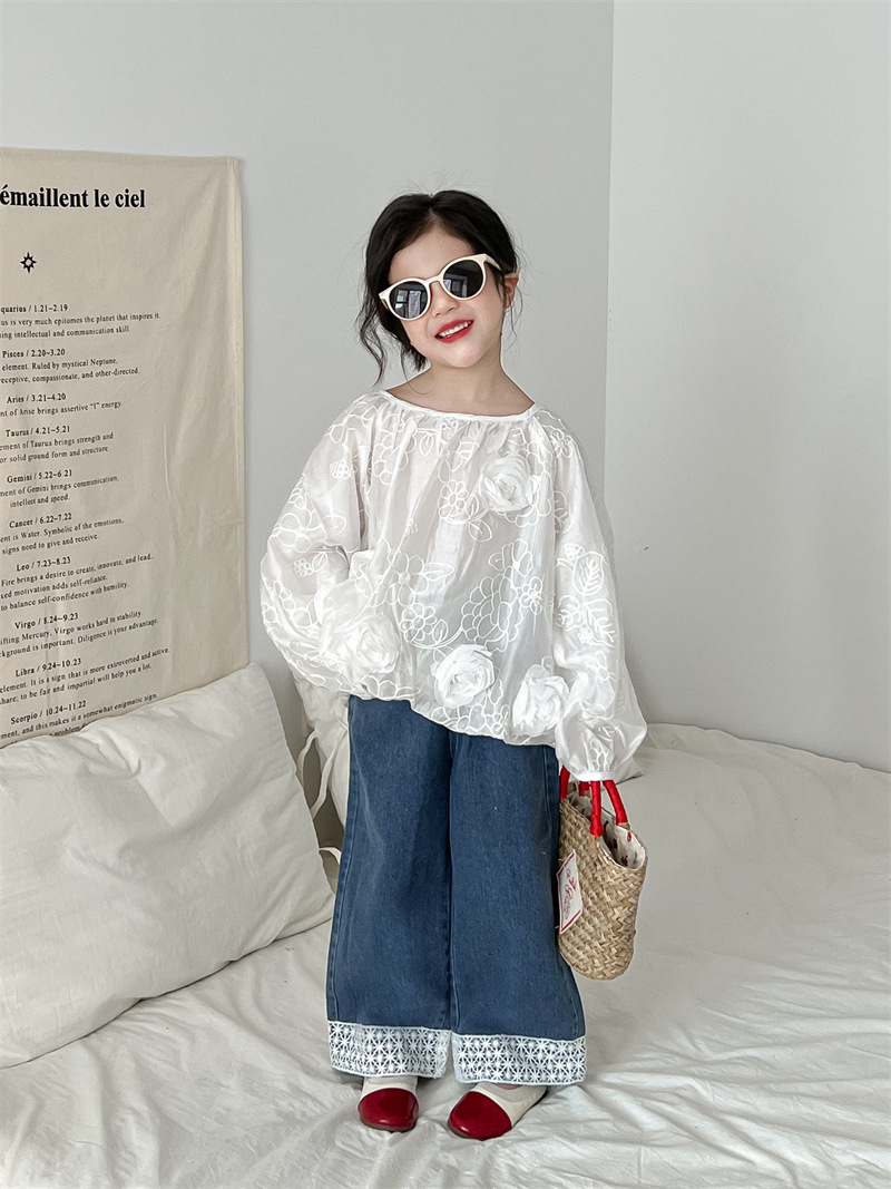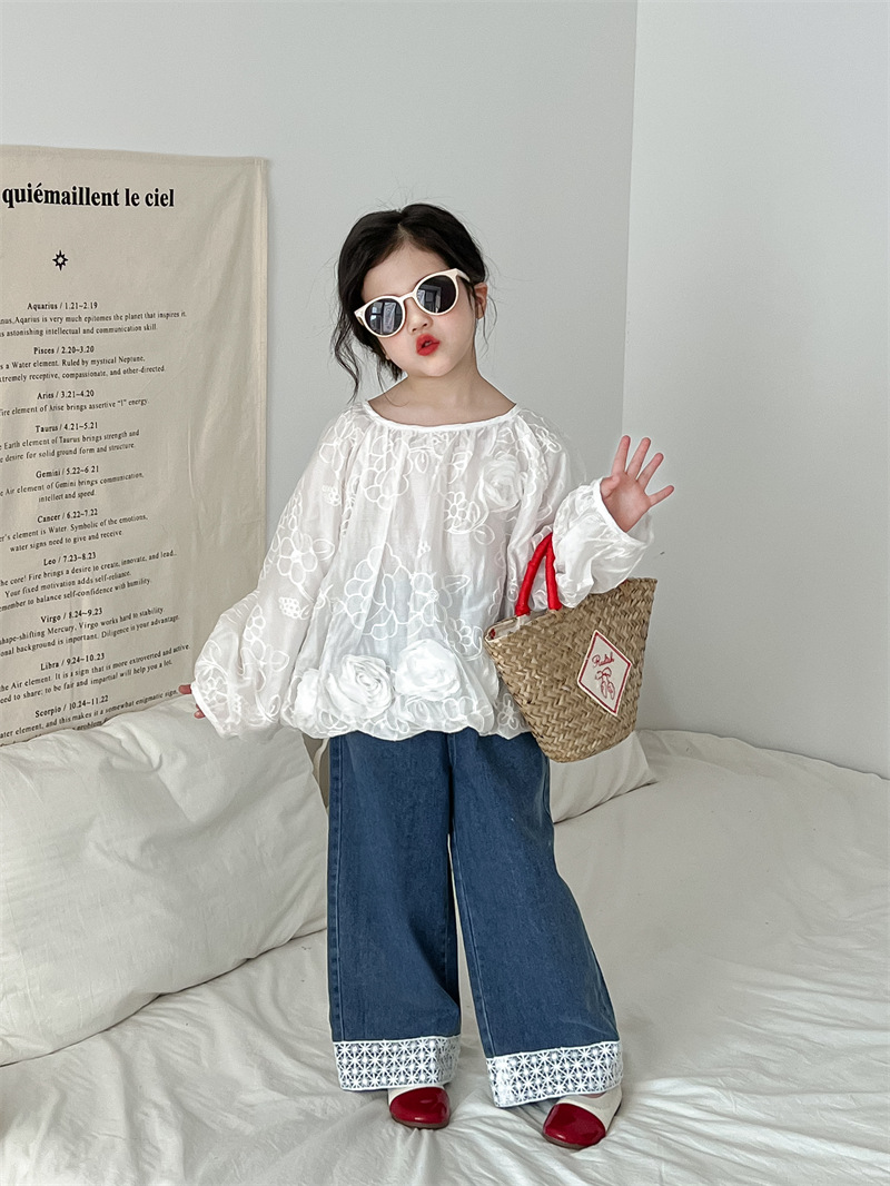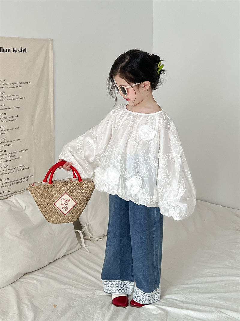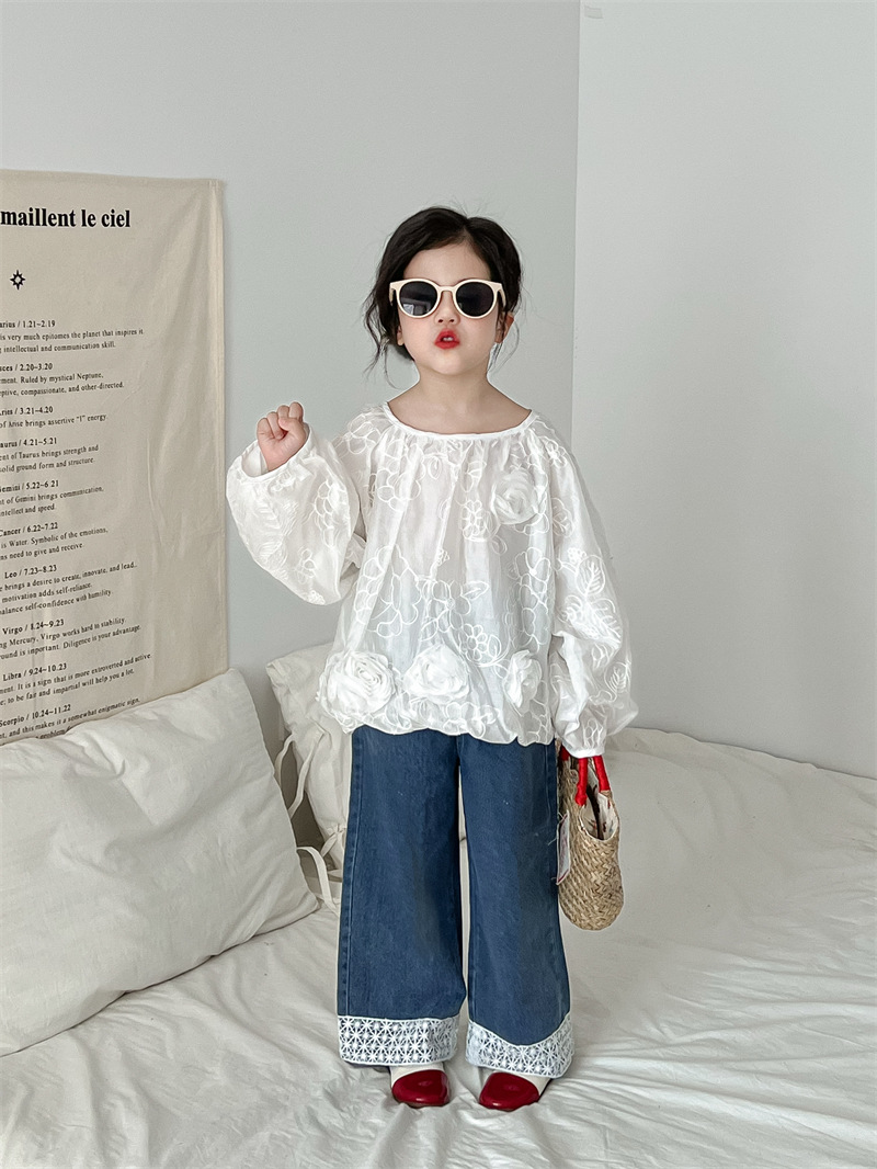 아동복 소녀 유행 무거운 자수 인터넷 축하 랜턴 슬리브 스테레오 꽃 스윙 셔츠 레이스 청바지 싱글 비트