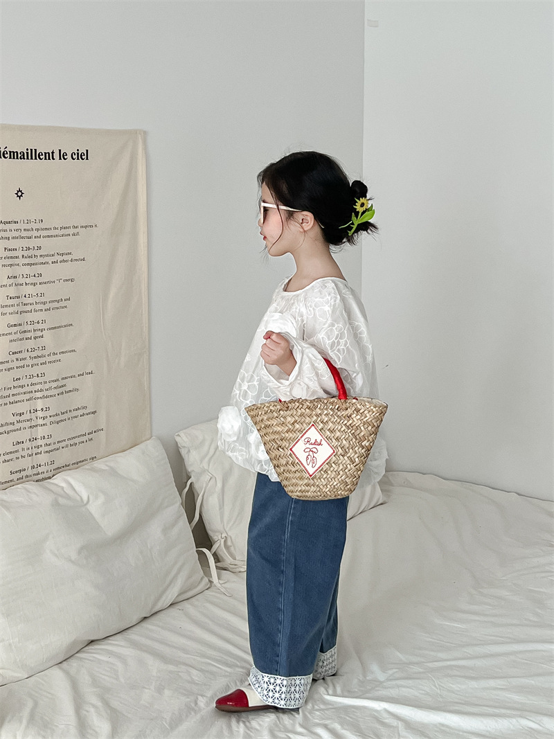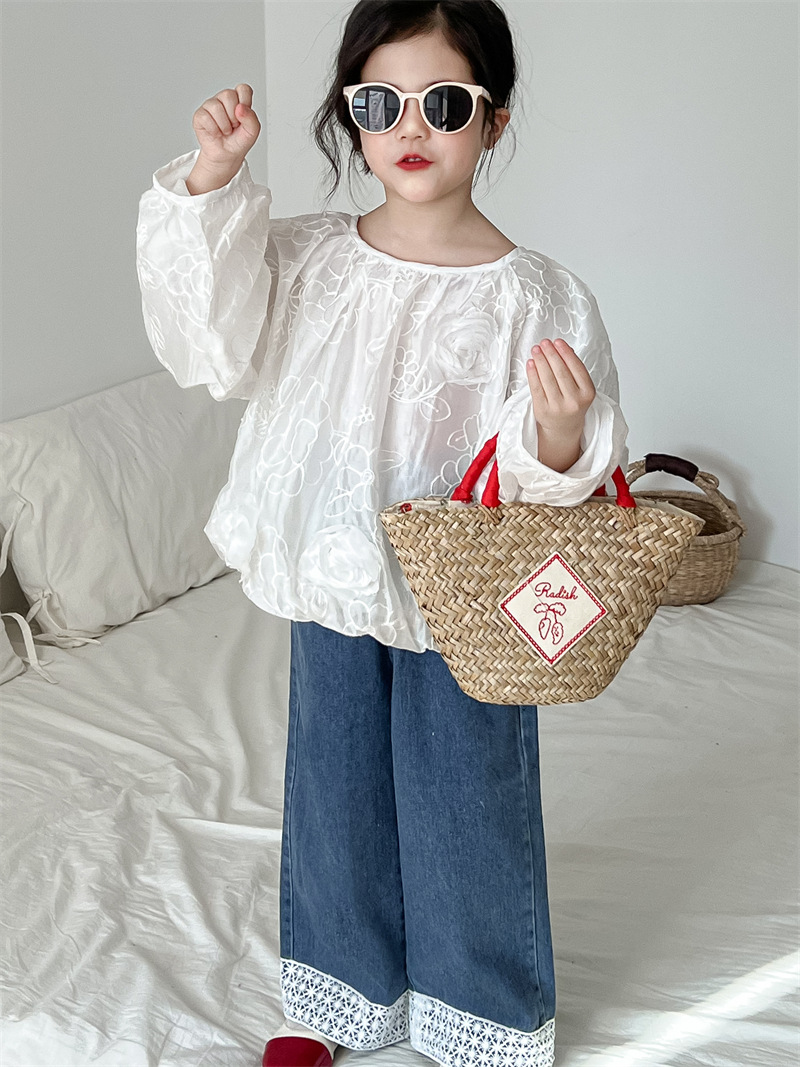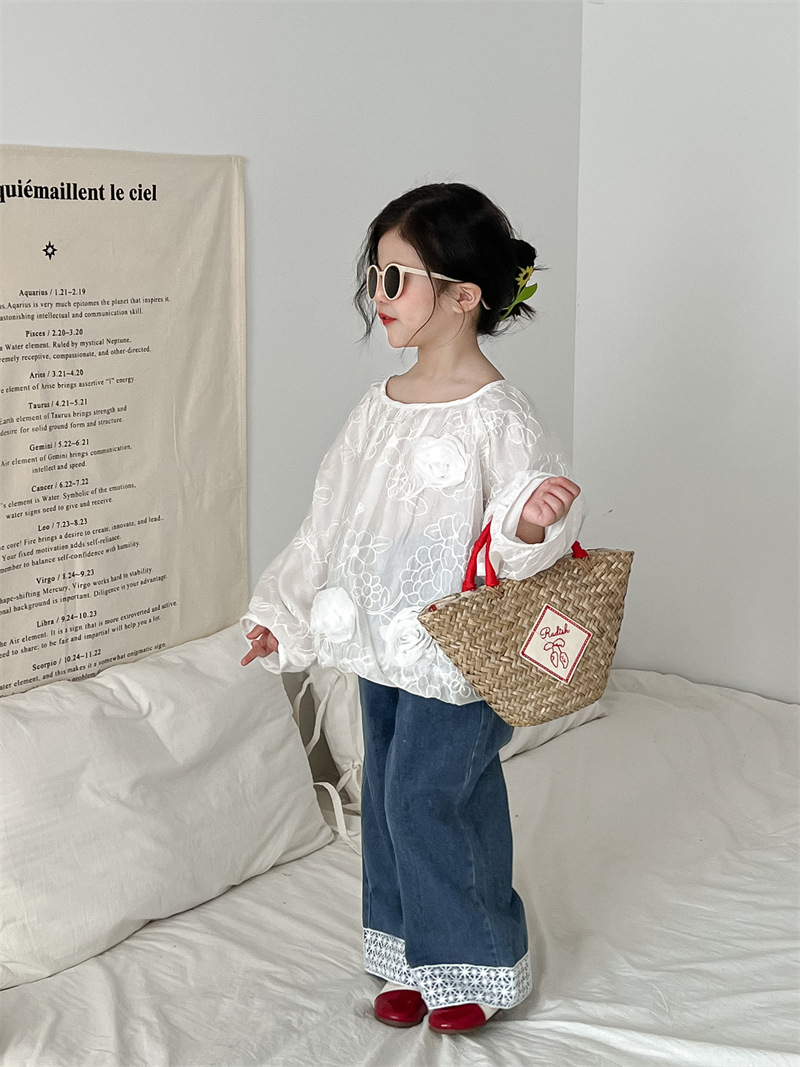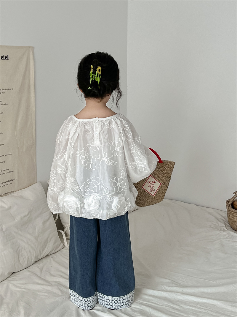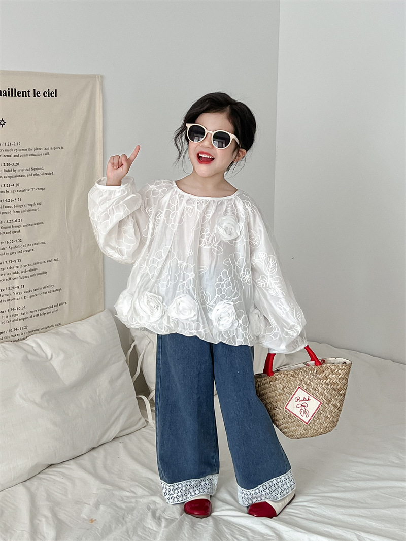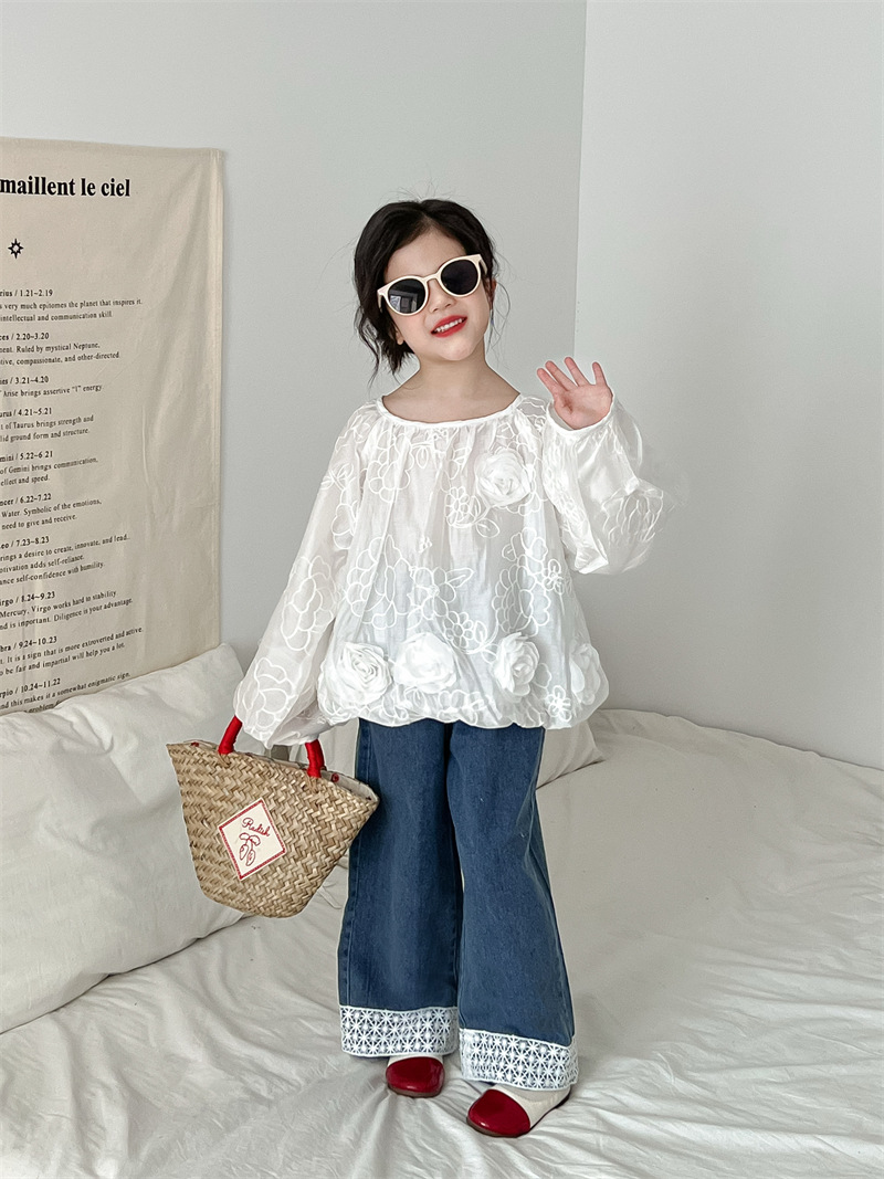 아동복 소녀 유행 무거운 자수 인터넷 축하 랜턴 슬리브 스테레오 꽃 스윙 셔츠 레이스 청바지 싱글 비트