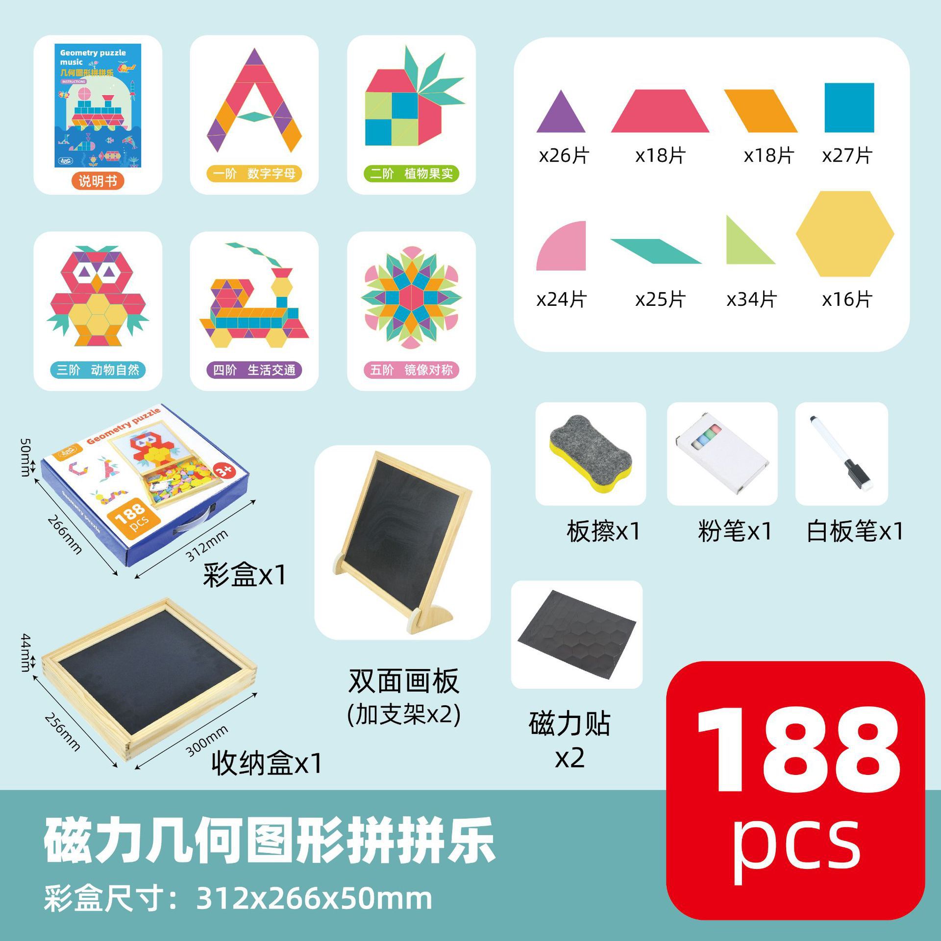 • 188피스 나무 상자 자석 기하학적 칠교놀이(CPC/CE)