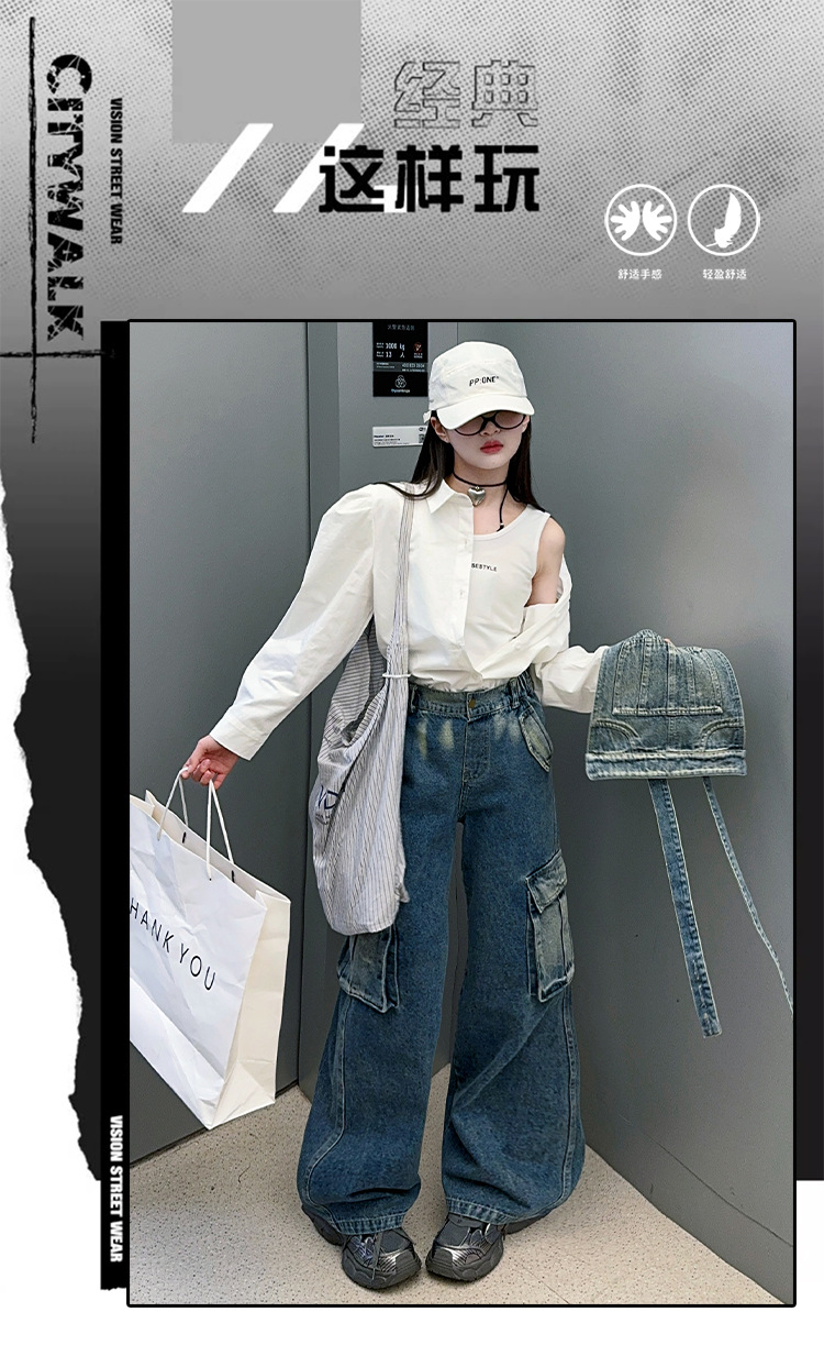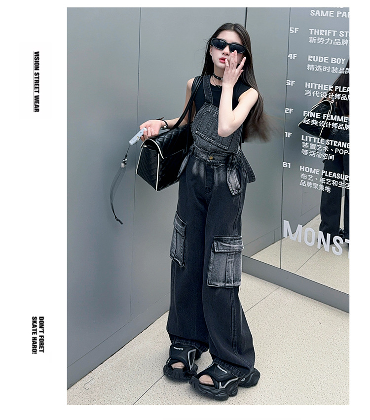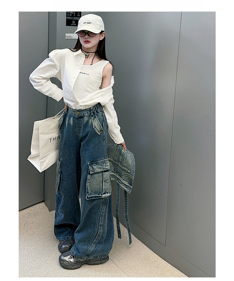 2025 년 봄 · 가을 새 한국식 디자인 센스 스트레이트 다리 바지 세트 소녀 투웨어 데님 스트랩스토어 가기