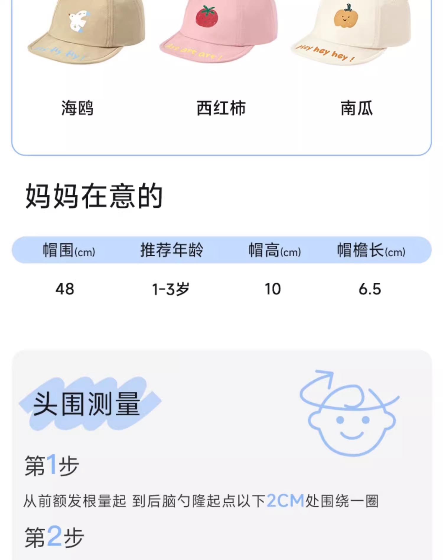 • 모자 둘레 48cm (권장 연령: 1-3세)