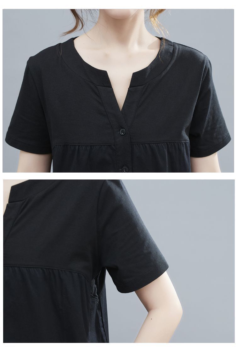 플러스 사이즈 원피스 미디 스티칭 통통녀 캐주얼 루즈 슬리밍 반팔 우아한 원피스 여성용 V 넥 원피스