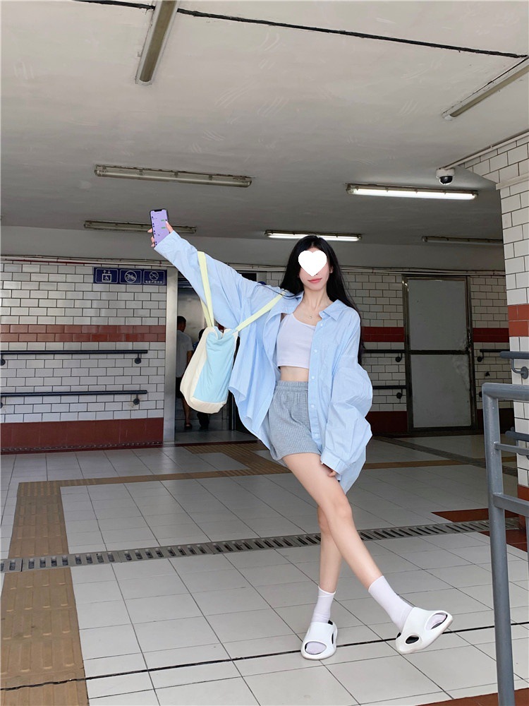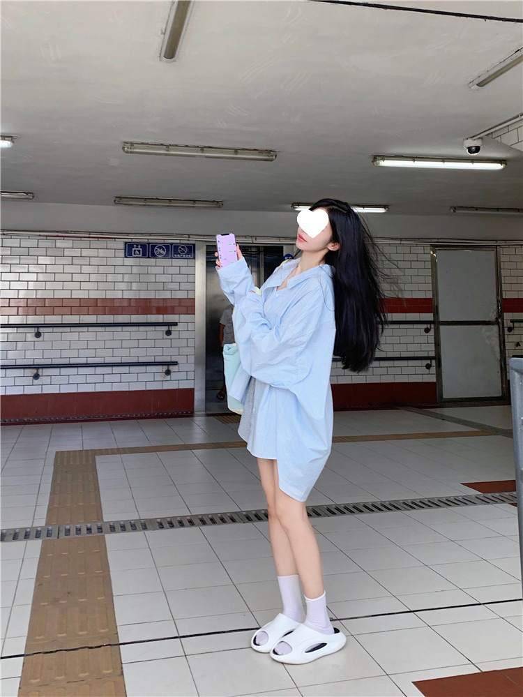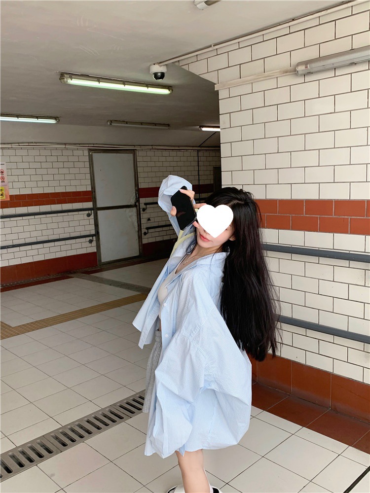 새로운 한국 스타일 블루 스트라이프 셔츠 여성의 봄 디자인 감각 느슨한 긴 소매 태양 보호 중간 길이의 외부 세대 헤어스토어 가기