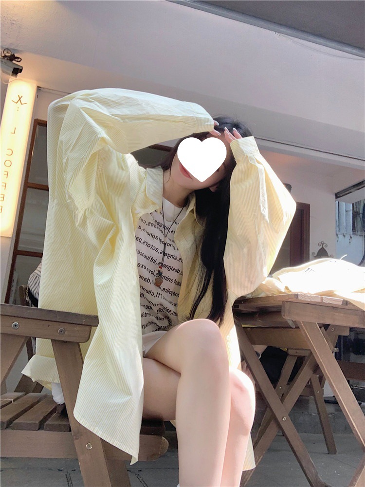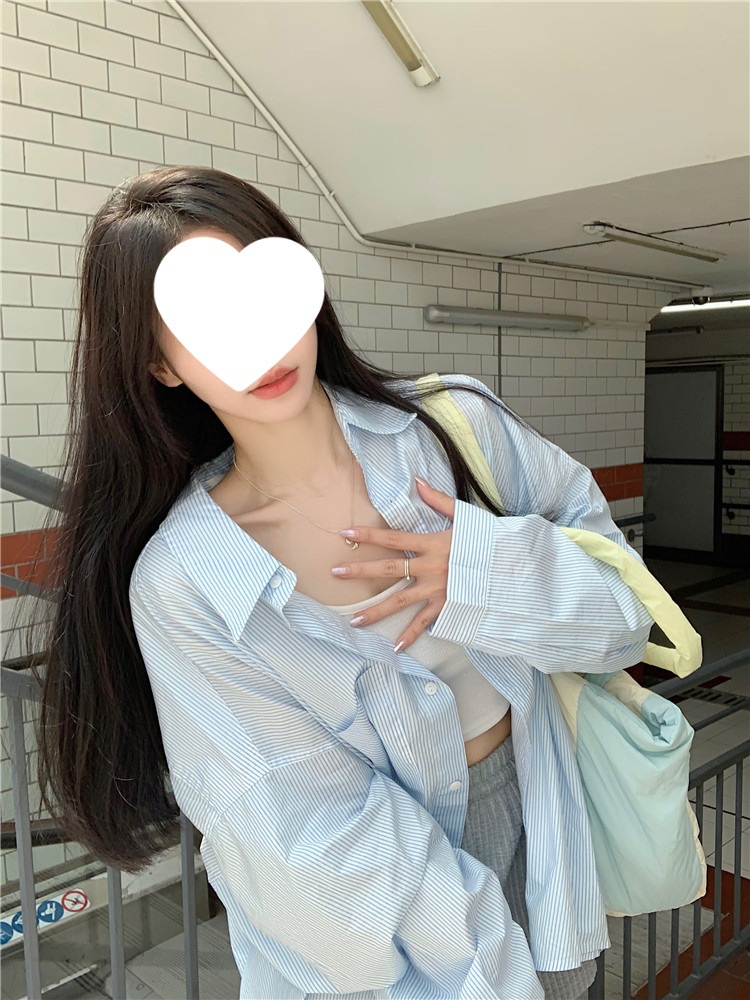 새로운 한국 스타일 블루 스트라이프 셔츠 여성의 봄 디자인 감각 느슨한 긴 소매 태양 보호 중간 길이의 외부 세대 헤어