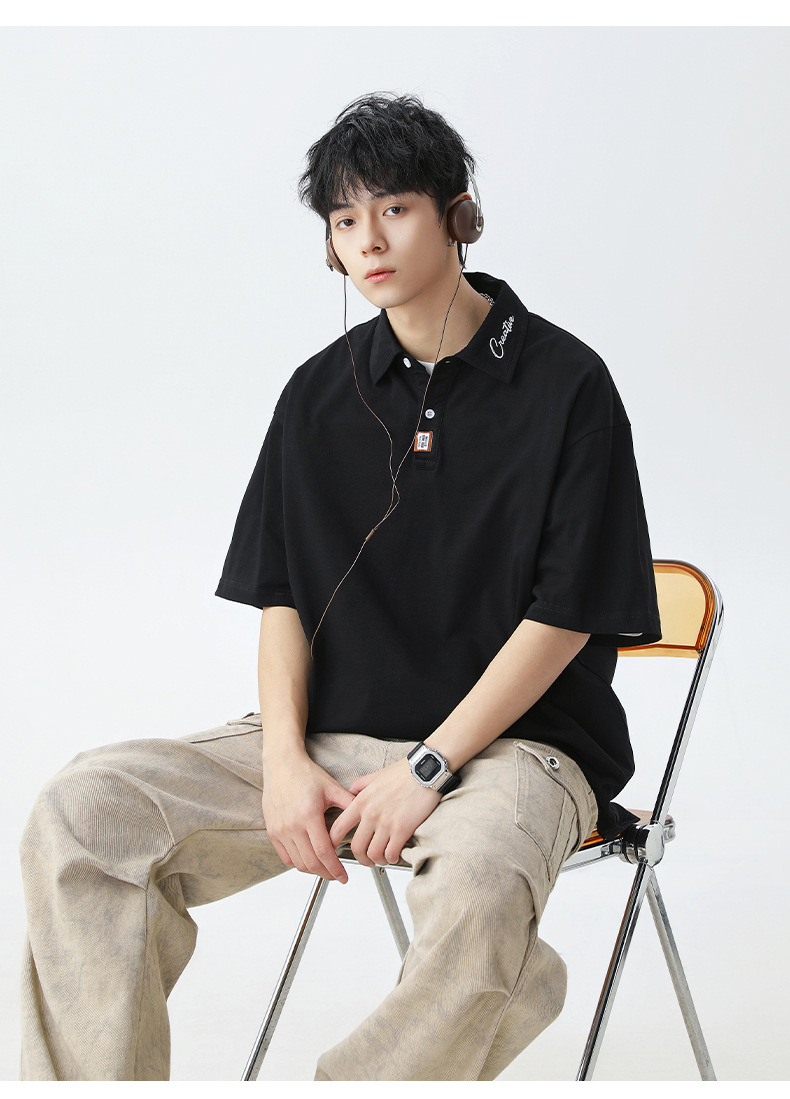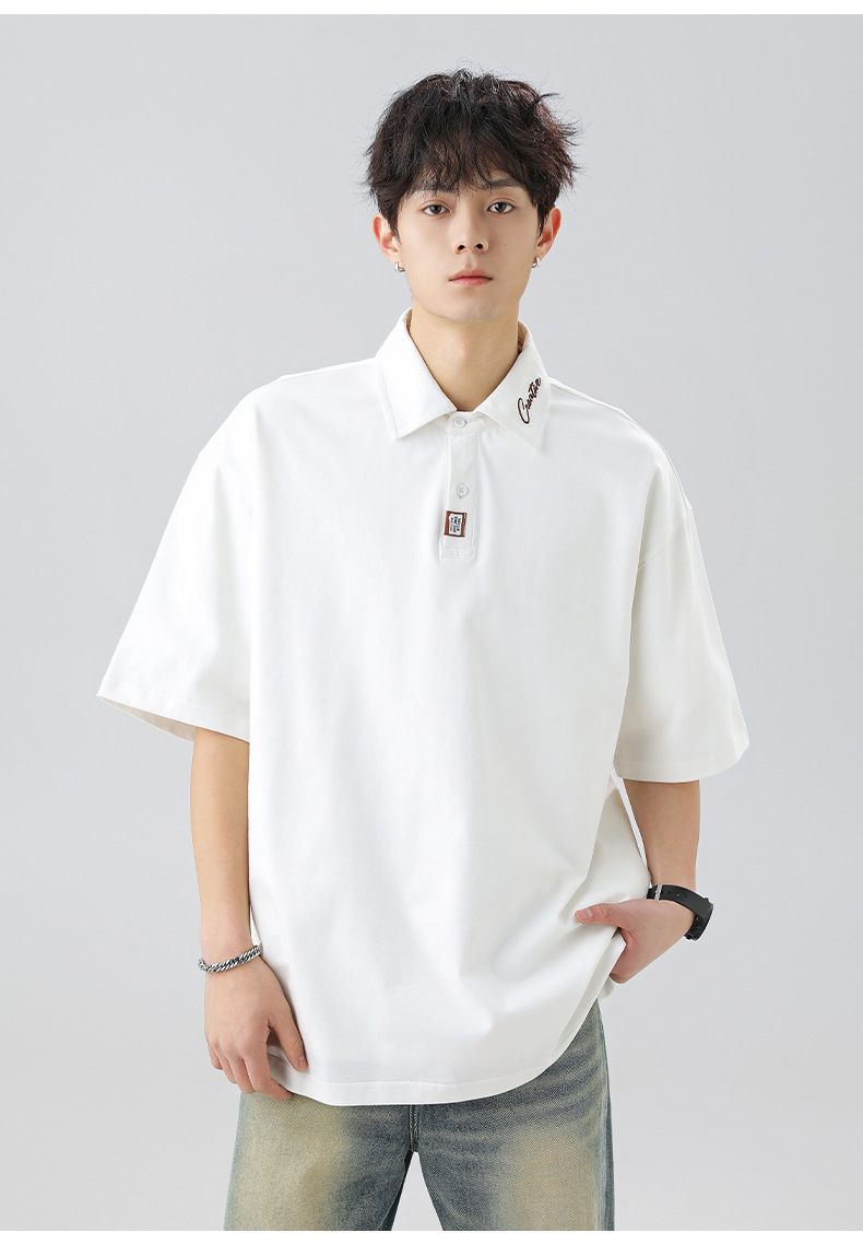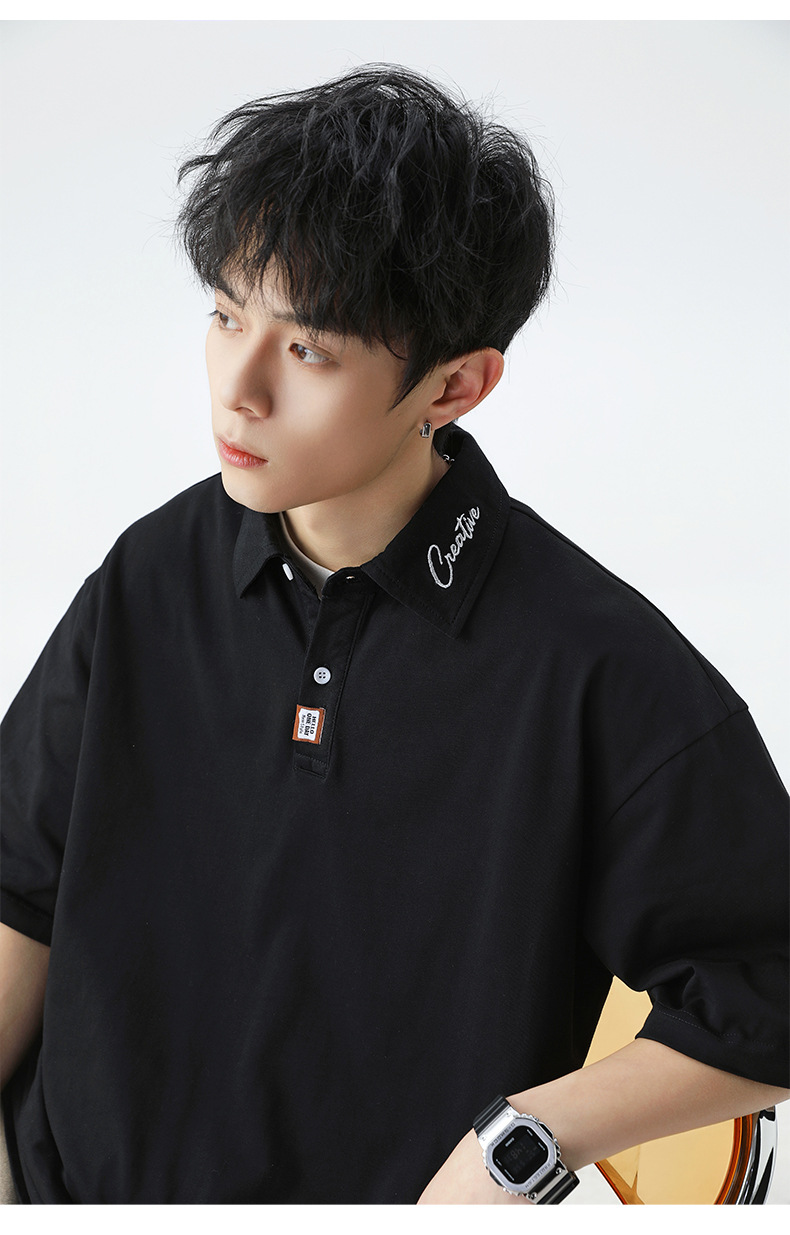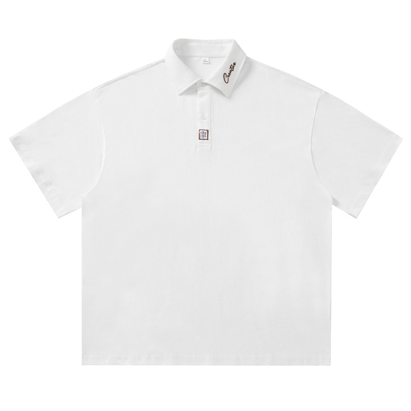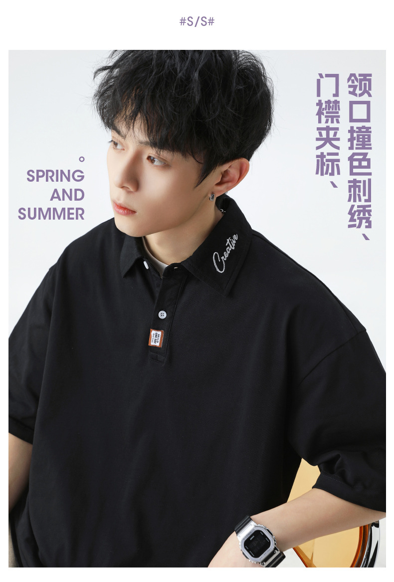 칼라에 대비되는 색상의 문자 자수가 있는 반팔 폴로셔츠 남성용 25 여름 스타일 일본식 루즈핏 순면 반팔 티셔츠 상의
