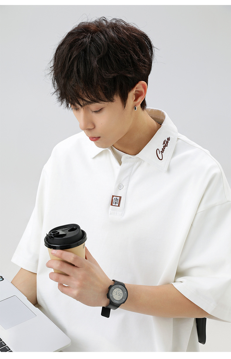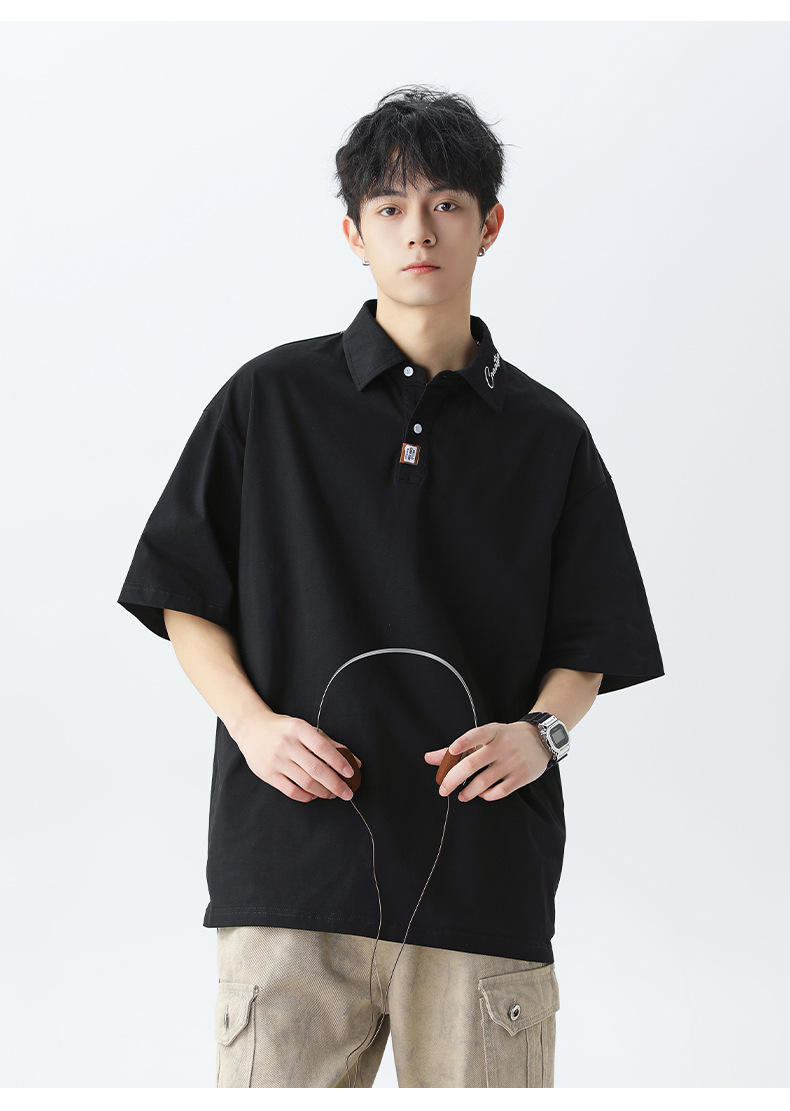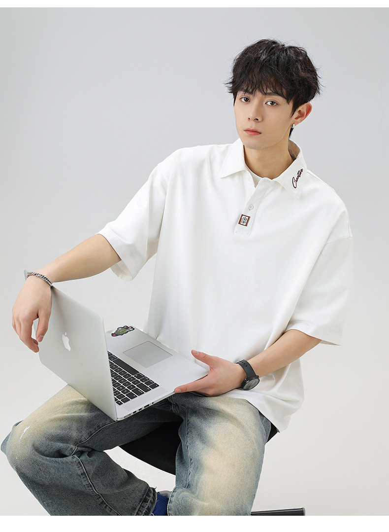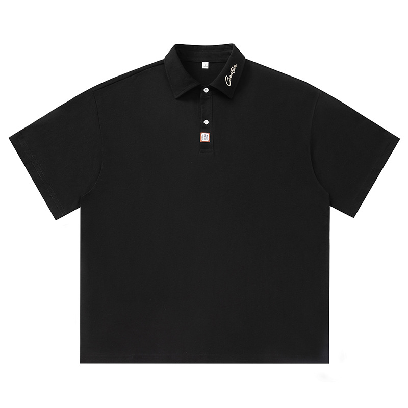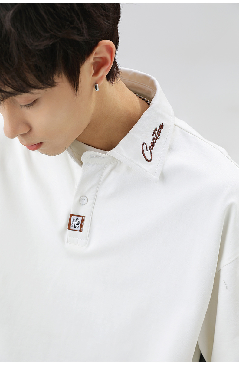 칼라에 대비되는 색상의 문자 자수가 있는 반팔 폴로셔츠 남성용 25 여름 스타일 일본식 루즈핏 순면 반팔 티셔츠 상의