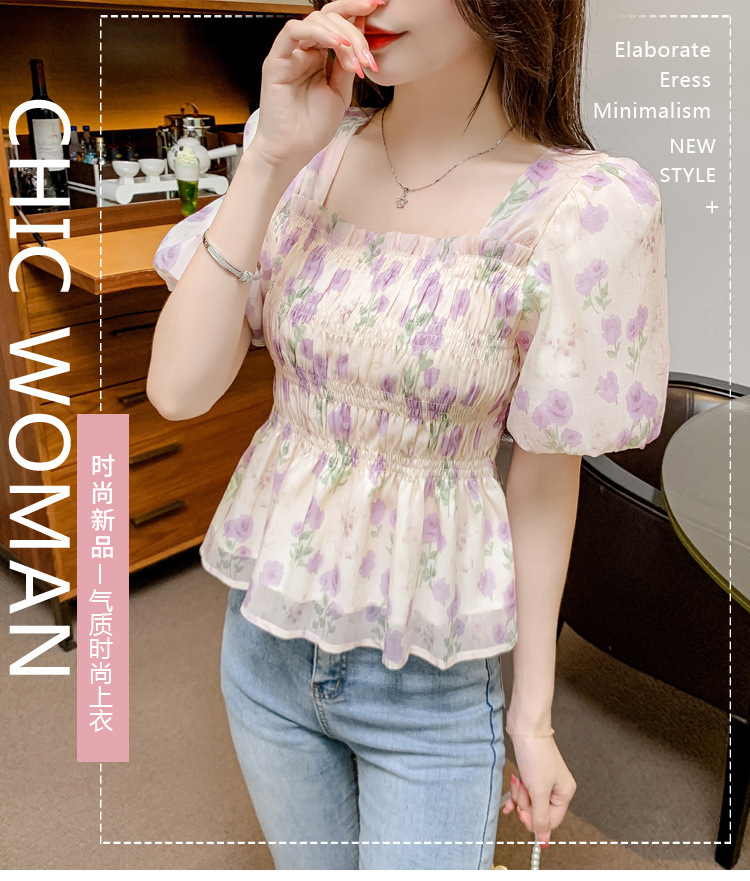 여름 반팔 프렌치 다용도 스퀘어 넥 꽃무늬 쉬폰 퍼프 소매, 패셔너블한 허리 조절 스위트 프린트 셔츠스토어 가기