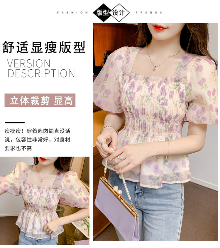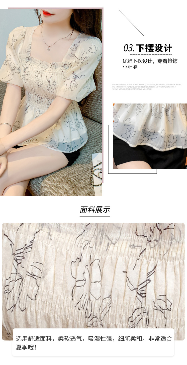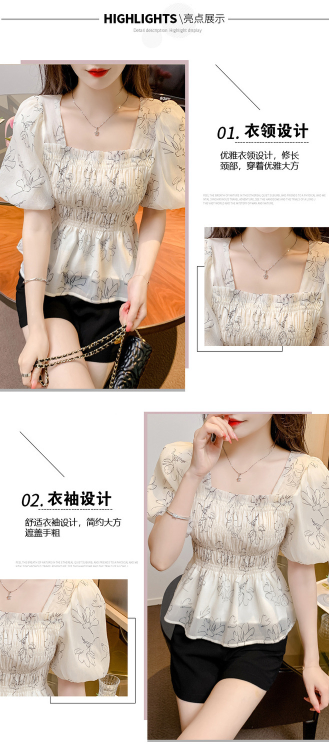 여름 반팔 프렌치 다용도 스퀘어 넥 꽃무늬 쉬폰 퍼프 소매, 패셔너블한 허리 조절 스위트 프린트 셔츠