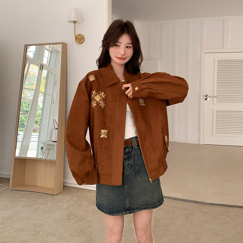 진짜 샷 오래된 돈 바람 무거운 산업 네일 드릴 스웨이드 가죽 재킷 2025 새로운 작은 나이 감소 외국 스타일 재킷스토어 가기