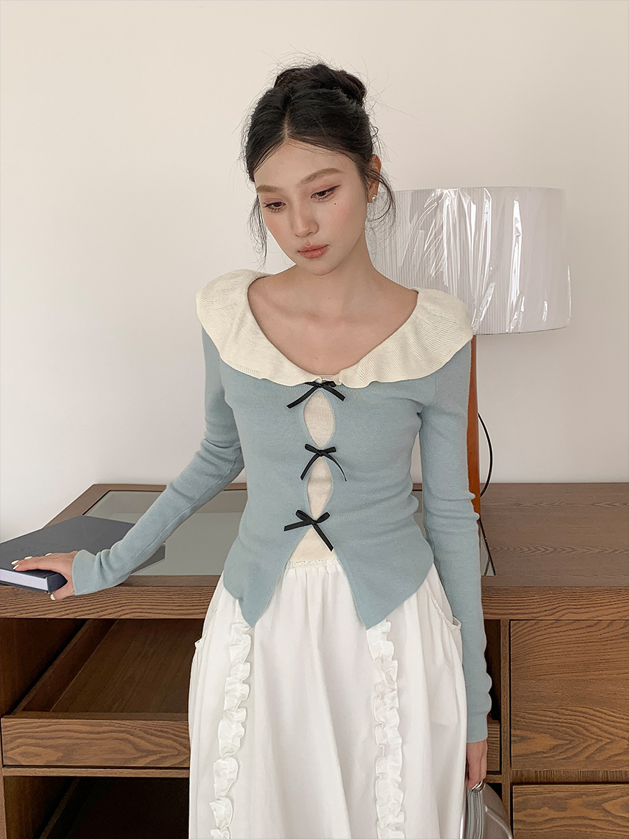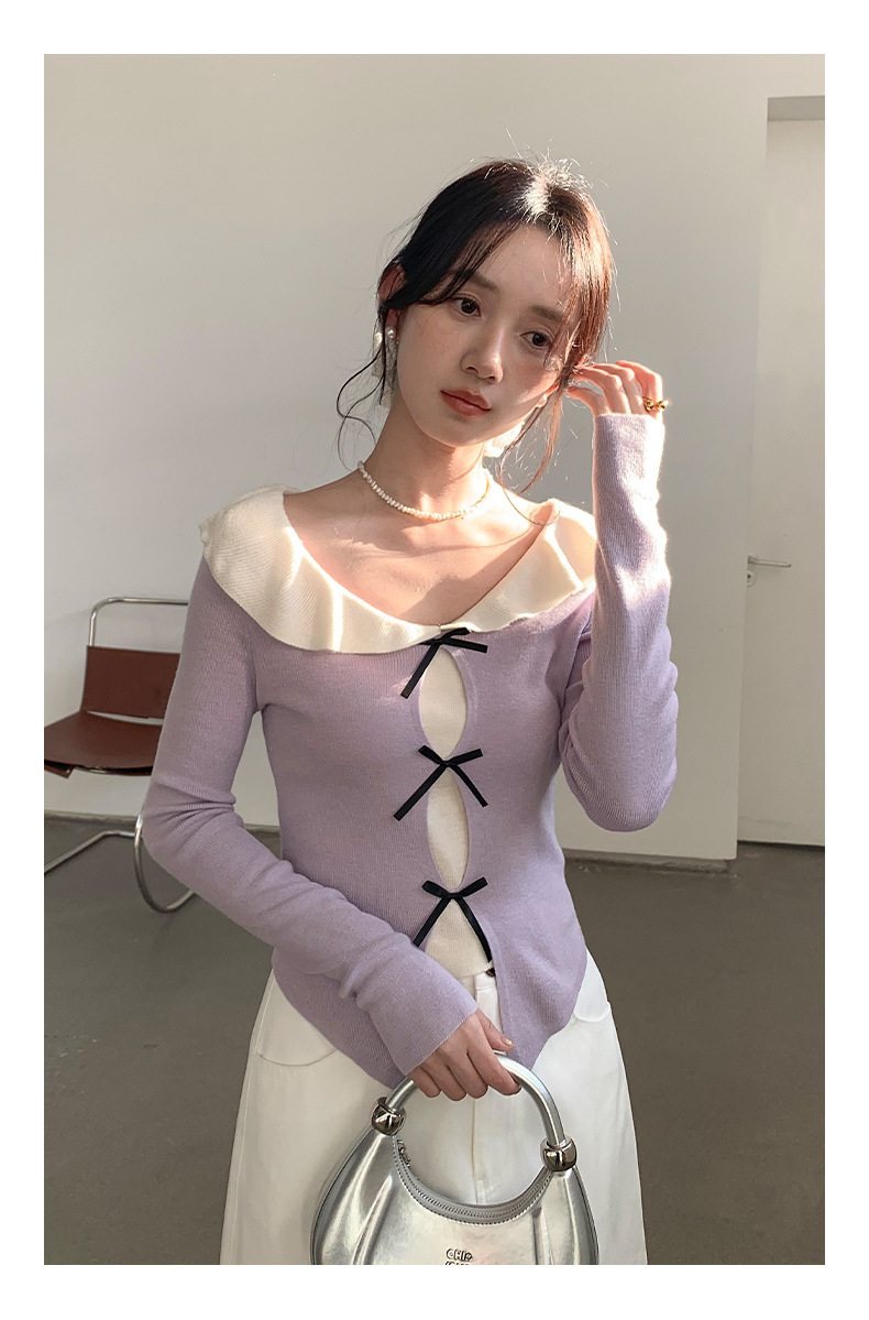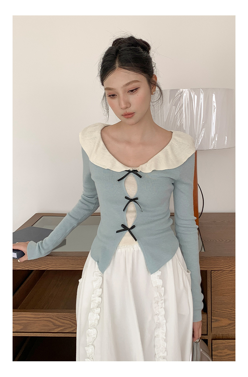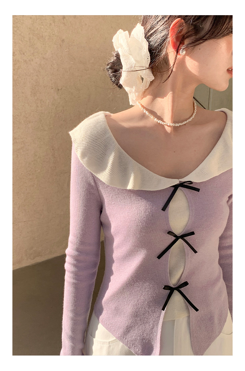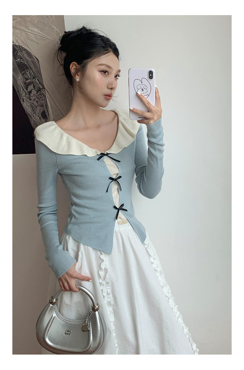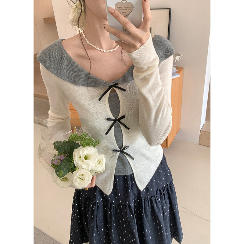 Yier 스웨터 디자인 가짜 투피스 인형 칼라 보우 스웨터 여성 짧은 스타일 부드러운 슬림 기질 0337