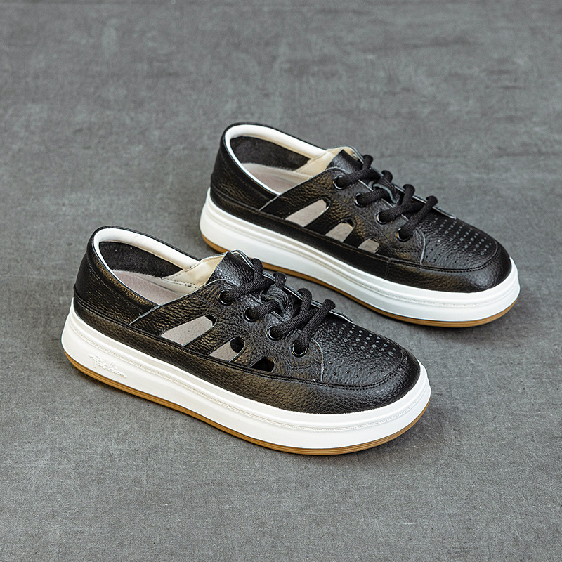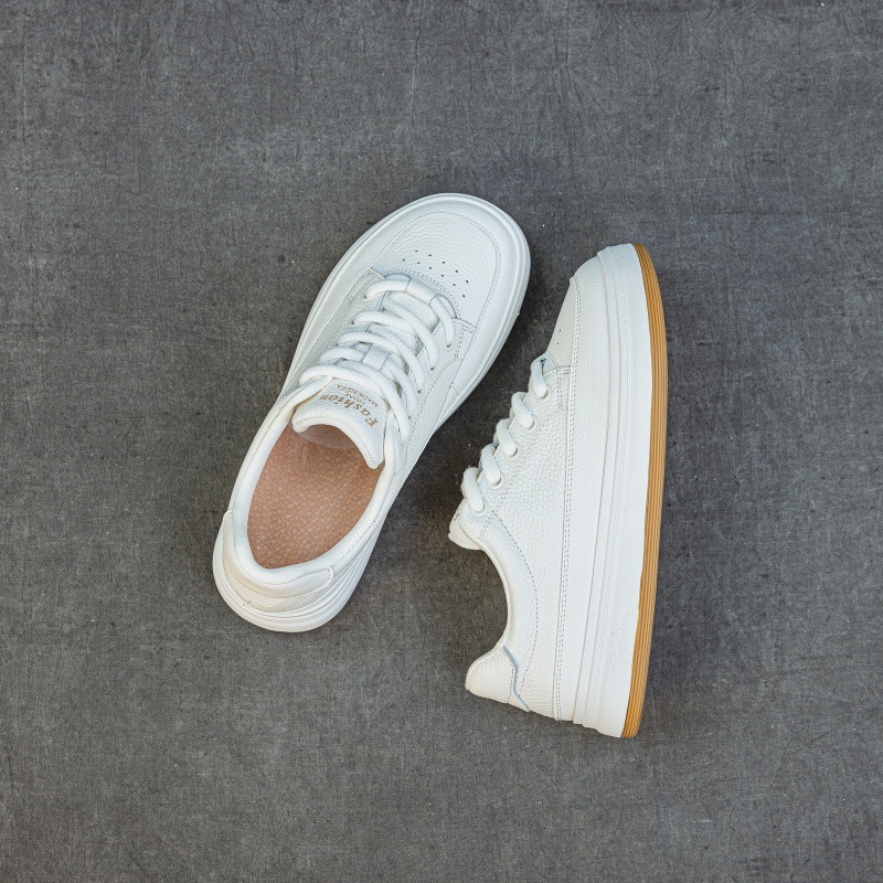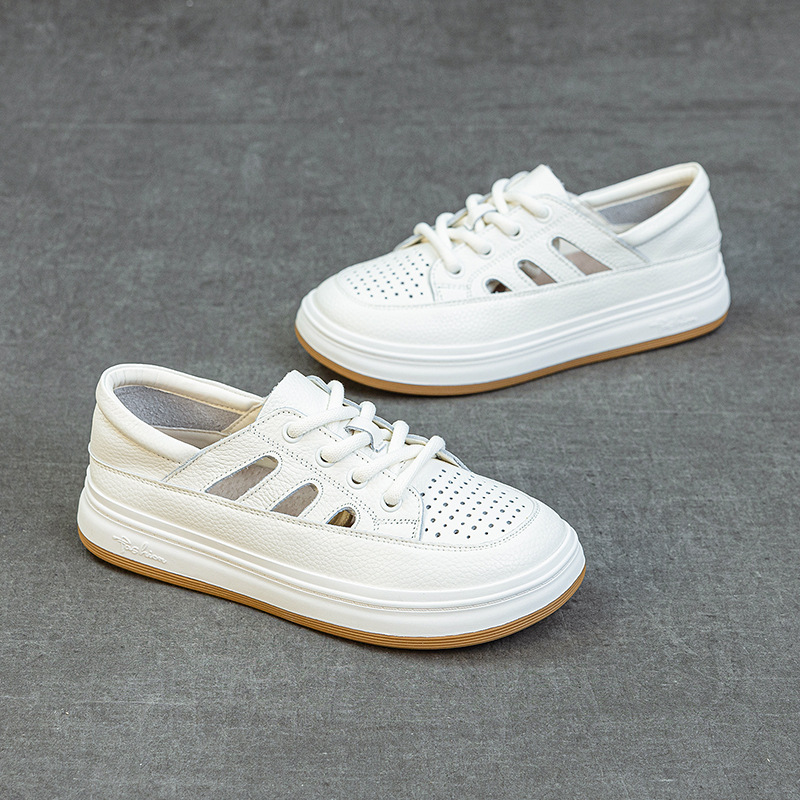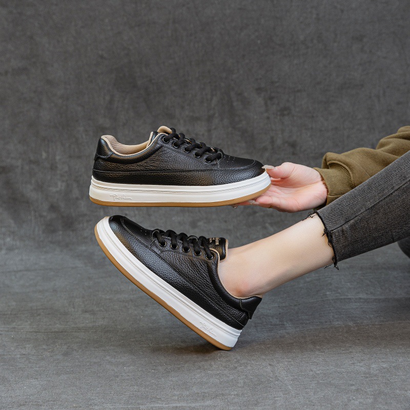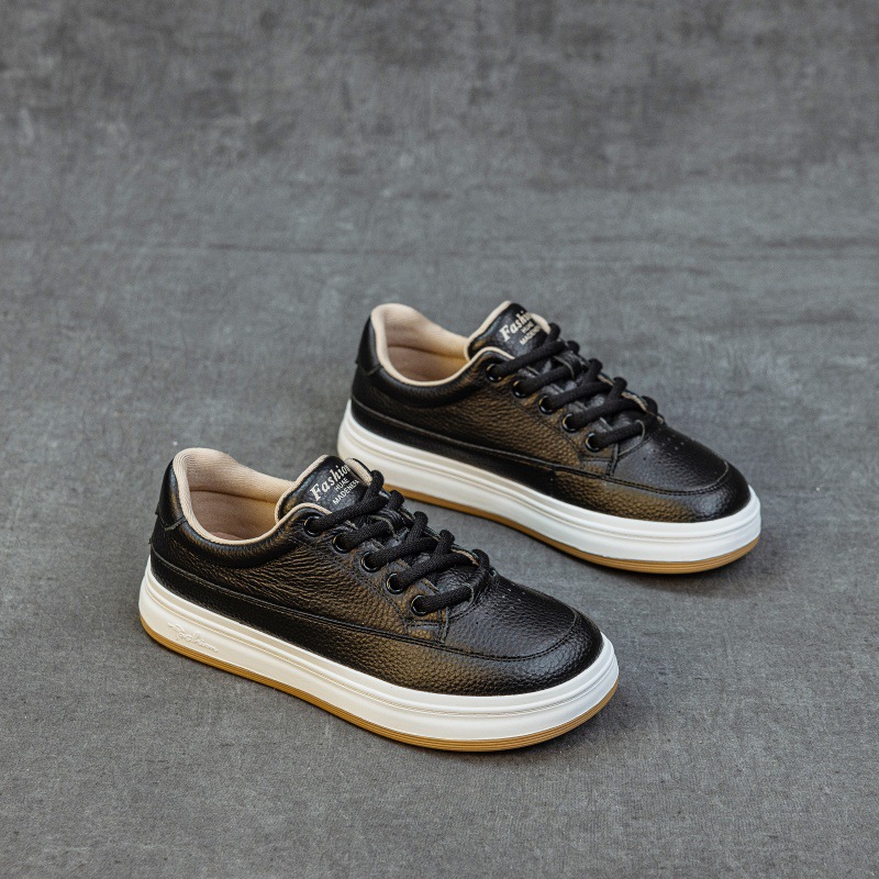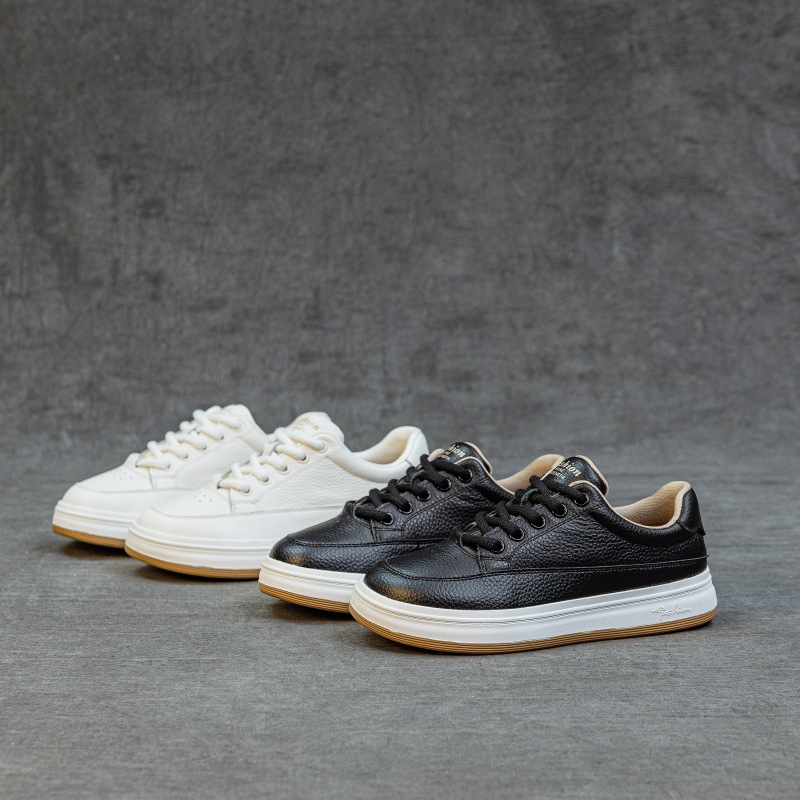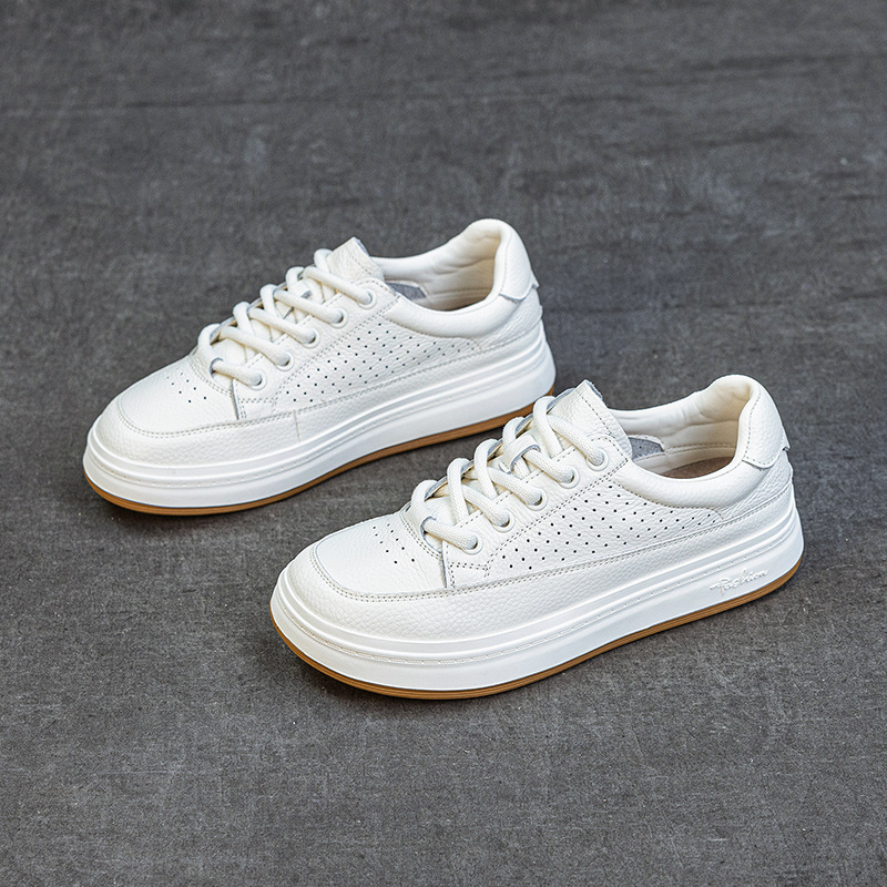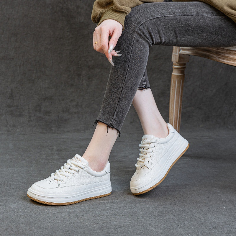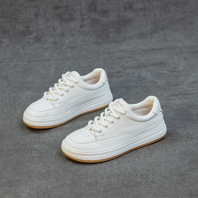 탑 레이어 Cowhide 편안한 플랫 화이트 신발 여성의 2025 봄 새로운 올 매치 캐주얼 보드 신발 라운드 토 레이스 업 신발